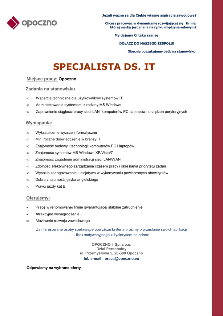 JeŜeli waŜne są dla Ciebie własne aspiracje zawodowe? Chcesz pracować w dynamicznie rozwijającej się firmie, której marka jest znana na rynku międzynarodowym? My dajemy Ci taką szansę DOŁĄCZ DO NASZEGO ZESPOŁU! Obecnie poszukujemy osób na stanowisko: SPECJALISTA DS. IT Miejsce pracy: Opoczno Zadania na stanowisku • Wsparcie techniczne dla uŜytkowników systemów IT • Administrowanie systemami z rodziny MS Windows • Zapewnienie ciągłości pracy sieci LAN, komputerów PC, laptopów i urządzeń peryferyjnych Wymagania: • Wykształcenie wyŜsze informatyczne • Min. roczne doświadczenie w branŜy IT • Znajomość budowy i technologii komputerów PC i laptopów • Znajomość systemów MS Windows XP/Vista/7 • Znajomość zagadnień administracji sieci LAN/WAN • Zdolność efektywnego zarządzania czasem pracy i określania priorytetu zadań • Wysokie zaangaŜowanie i inicjatywa w wykonywaniu powierzonych obowiązków • Dobra znajomość języka angielskiego • Prawo jazdy kat B Oferujemy: • Pracę w renomowanej firmie gwarantującej stabilne zatrudnienie • Atrakcyjne wynagrodzenie • MoŜliwość rozwoju zawodowego Zainteresowane osoby spełniające powyŜsze kryteria prosimy o przesłanie swoich aplikacji - listu motywacyjnego z Ŝyciorysem na adres: OPOCZNO I Sp. z o.o. Dział Personalny ul. Przemysłowa 5, 26-300 Opoczno lub e-mail: [email protected] Odpowiemy na wybrane oferty