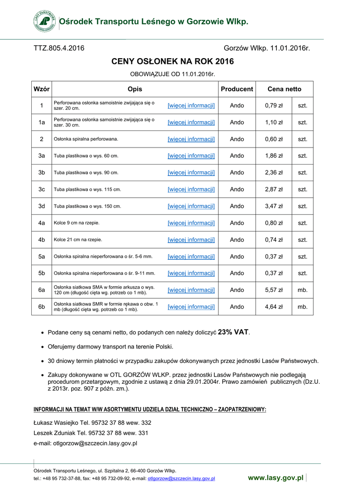 Ośrodek Transportu Leśnego w Gorzowie Wlkp. Gorzów Wlkp. 11.01.2016r. TTZ.805.4.2016 CENY OSŁONEK NA ROK 2016 OBOWIĄZUJE OD 11.01.2016r. Wzór Opis Producent Cena netto 1 Perforowana osłonka samoistnie zwijająca się o szer. 20 cm. [więcej informacji] Ando 0,79 zł szt. 1a Perforowana osłonka samoistnie zwijająca się o szer. 30 cm. [więcej informacji] Ando 1,10 zł szt. 2 Osłonka spiralna perforowana. [więcej informacji] Ando 0,60 zł szt. 3a Tuba plastikowa o wys. 60 cm. [więcej informacji] Ando 1,86 zł szt. 3b Tuba plastikowa o wys. 90 cm. [więcej informacji] Ando 2,36 zł szt. 3c Tuba plastikowa o wys. 115 cm. [więcej informacji] Ando 2,87 zł szt. 3d Tuba plastikowa o wys. 150 cm. [więcej informacji] Ando 3,47 zł szt. 4a Kolce 9 cm na rzepie. [więcej informacji] Ando 0,80 zł szt. 4b Kolce 21 cm na rzepie. [więcej informacji] Ando 0,74 zł szt. 5a Osłonka spiralna nieperforowana o śr. 5-6 mm. [więcej informacji] Ando 0,37 zł szt. 5b Osłonka spiralna nieperforowana o śr. 9-11 mm. [więcej informacji] Ando 0,37 zł szt. 6a Osłonka siatkowa SMA w formie arkusza o wys. 120 cm (długość cięta wg. potrzeb co 1 mb). [więcej informacji] Ando 5,57 zł mb. 6b Osłonka siatkowa SMR w formie rękawa o obw. 1 mb (długość cięta wg. potrzeb co 1 mb). [więcej informacji] Ando 4,64 zł mb. Podane ceny są cenami netto, do podanych cen należy doliczyć 23% VAT. Oferujemy darmowy transport na terenie Polski. 30 dniowy termin płatności w przypadku zakupów dokonywanych przez jednostki Lasów Państwowych. Zakupy dokonywane w OTL GORZÓW WLKP. przez jednostki Lasów Państwowych nie podlegają procedurom przetargowym, zgodnie z ustawą z dnia 29.01.2004r. Prawo zamówień publicznych (Dz.U. z 2013r. poz. 907 z późn. zm.). INFORMACJI NA TEMAT W/W ASORTYMENTU UDZIELA DZIAŁ TECHNICZNO – ZAOPATRZENIOWY: Łukasz Wasiejko Tel. 95732 37 88 wew. 332 Leszek Zduniak Tel. 95732 37 88 wew. 331 e-mail: [email protected] Ośrodek Transportu Leśnego, ul. Szpitalna 2, 66-400 Gorzów Wlkp. tel.: +48 95 732-37-88, fax: +48 95 732-09-92, e-mail: [email protected] www.lasy.gov.pl