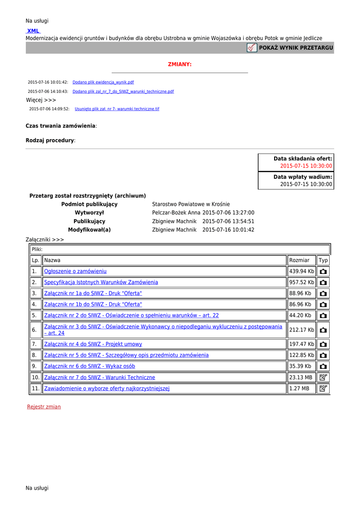 Na usługi XML Modernizacja ewidencji gruntów i budynków dla obrębu Ustrobna w gminie Wojaszówka i obrębu Potok w gminie Jedlicze POKAŻ WYNIK PRZETARGU ZMIANY: 2015-07-16 10:01:42: Dodano plik ewidencja_wynik.pdf 2015-07-06 14:10:43: Dodano plik zal_nr_7_do_SIWZ_warunki_techniczne.pdf Więcej >>> 2015-07-06 14:09:52: Usunięto plik zał. nr 7- warumki techniczne.tif Czas trwania zamówienia: Rodzaj procedury: Data składania ofert: 2015-07-15 10:30:00 Data wpłaty wadium: 2015-07-15 10:30:00 Przetarg został rozstrzygnięty (archiwum) Podmiot publikujący Starostwo Powiatowe w Krośnie Wytworzył Pelczar-Bożek Anna 2015-07-06 13:27:00 Publikujący Zbigniew Machnik 2015-07-06 13:54:51 Modyfikował(a) Zbigniew Machnik 2015-07-16 10:01:42 Załączniki >>> Pliki: Lp. Nazwa Rozmiar 1. Ogłoszenie o zamówieniu 439.94 Kb 2. Specyfikacja Istotnych Warunków Zamówienia 957.52 Kb 3. Załącznik nr 1a do SIWZ - Druk "Oferta" 88.96 Kb 4. Załącznik nr 1b do SIWZ - Druk "Oferta" 86.96 Kb 5. Załącznik nr 2 do SIWZ - Oświadczenie o spełnieniu warunków – art. 22 44.20 Kb 6. Załącznik nr 3 do SIWZ - Oświadczenie Wykonawcy o niepodleganiu wykluczeniu z postępowania – art. 24 212.17 Kb 7. Załącznik nr 4 do SIWZ - Projekt umowy 197.47 Kb 8. Załącznik nr 5 do SIWZ - Szczegółowy opis przedmiotu zamówienia 122.85 Kb 9. Załącznik nr 6 do SIWZ - Wykaz osób 35.39 Kb 10. Załącznik nr 7 do SIWZ - Warunki Techniczne 23.13 MB 11. Zawiadomienie o wyborze oferty najkorzystniejszej 1.27 MB Rejestr zmian Na usługi Typ