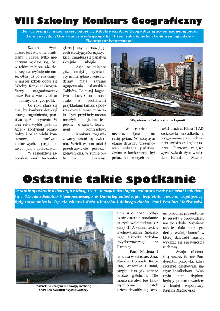 VIII Szkolny Konkurs Geograficzny Po raz ósmy w naszej szkole odbył się Szkolny Konkurs Geograficzny zorganizowany przez Panią wicedyrektor nauczyciela geografii. W tym roku tematem konkursu była Azja "kontynent kontrastów". Szkolne życie usłane jest wieloma atrak cjami i chyba tylko nie licznym wydaje się, że w takim miejscu nic cie kawego zdażyć się nie mo że. Otóż już po raz ósmy w naszej szkole odbył się Szkolny Konkurs Geogra ficzny zorganizowany przez Panią wicedyrektor nauczyciela geografii. Co roku stara się ona, by konkurs dotyczył innego zagadnienia, pań stwa bądź kontynentu. W tym roku wybór padł na Azję kontynent różno rodny i pełen wielu kon trastów, zarówno kulturowych, gospodar czych, jak i społecznych. W sąsiedztwie ja pońskiej myśli technolo gicznej i szybko rozwijają cych się „tygrysów azjatyc kich" znajdują się państwa skrajnie ubogie. Azja to miejsce gdzie medytują tybetań scy mnisi, gdzie swoje sie dzimy mają skrajne ugupowania islamskich Talibów. To tutaj bogac two kultury Chin kontra stuje z brutalnymi przykładami łamania pod stawowych praw człowie ka. Tych przykłady można mnożyć, ale jedno jest pewne o Azja to konty nent kontrastów. Konkurs zorgani zowany został 19 kwiet nia. Wzieli w nim udział przedstawiciele poszcze gólnych klas. W sumie by ły to 4 drużyny. Współczesne Tokyo stolica Japonii W rundzie I uczniowie odpowiadali na serię pytań. W kolejnym etapie drużyny prezento wali wybrane państwo. Jedną z konkurencji był pokaz kulinarnych zdol ności drużyn. Klasa II AD zaskoczyła wszystkich, a przygotowana przez nich sa łatka szybko zniknęła z ta lerza. Pierwsze miejsce wywalczyła drużyna w skła dzie Kamila i Michał. Ostatnie takie spotkanie Ostatnie spotkanie dziewczyn z klasy III A naszych dzielnych wolontaruszek z dziećmi i młodzie żą z Ośrodka SzkolnoWychowawczego w Damnicy zakończyło trzyletnią owocną współpracę. Były wspomnienia, łzy ale również dużo uśmiechu i dobrego ducha. Pani Paulina Maćkowska. Zamek, w którym ma swoją siedzibę Ośrodek SzkolnoWychowawczy Dnia 26.04.2012r. odby ło się ostatnie spotkanie naszych wolontariuszek z klasy III A (kosmitek), z wychowankami Specjal nego Ośrodka Szkolno Wychowawczego w Damnicy. Pani Marlena i jej klasa w składzie: Asia, Klaudia, Dominik, Karo lina, Weronika i Rafał, przyjęli nas jak zawsze bardzo gościnnie. Nie mogło się obyć bez kawy cappuccino i ciastek Dzieci chwaliły się swo mi pracami, prezentowa ły zeszyty i oprowadzały nas po szkole. Najwięcej radości dała nam gra derby (wyścigi konne), w której dzieciaki musiały wykazać się sprawnością ruchową. Swoja obecno ścią zaszczyciła nas Pani dyrektor placówki, która szczerze dziękowała na szym licealistkom. Wrę czyła nam dyplom, będący podsumowaniem 3 letniej współpracy. P a u l i n a M a ć k ow s k a