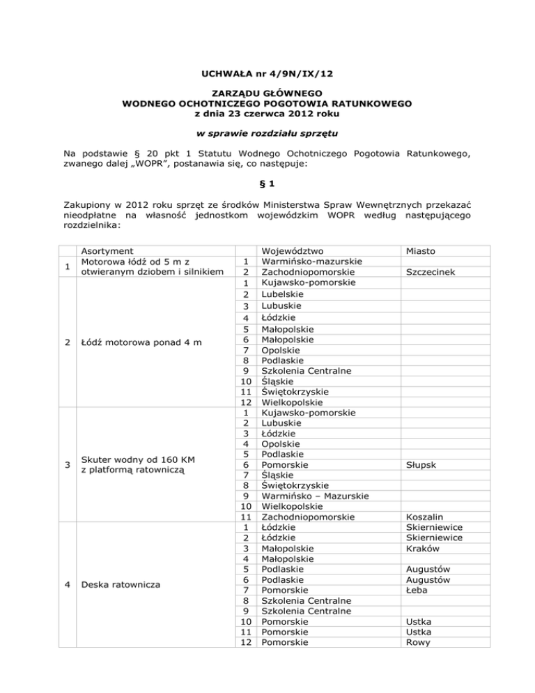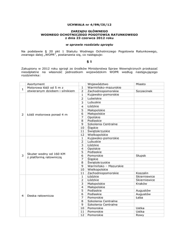 UCHWAŁA nr 4/9N/IX/12 ZARZĄDU GŁÓWNEGO WODNEGO OCHOTNICZEGO POGOTOWIA RATUNKOWEGO z dnia 23 czerwca 2012 roku w sprawie rozdziału sprzętu Na podstawie § 20 pkt 1 Statutu Wodnego Ochotniczego Pogotowia Ratunkowego, zwanego dalej „WOPR”, postanawia się, co następuje: §1 Zakupiony w 2012 roku sprzęt ze środków Ministerstwa Spraw Wewnętrznych przekazać nieodpłatne na własność jednostkom wojewódzkim WOPR według następującego rozdzielnika: 1 Asortyment Motorowa łódź od 5 m z otwieranym dziobem i silnikiem 2 Łódź motorowa ponad 4 m 3 Skuter wodny od 160 KM z platformą ratowniczą 4 Deska ratownicza 1 2 1 2 3 4 5 6 7 8 9 10 11 12 1 2 3 4 5 6 7 8 9 10 11 1 2 3 4 5 6 7 8 9 10 11 12 Województwo Warmińsko-mazurskie Zachodniopomorskie Kujawsko-pomorskie Lubelskie Lubuskie Łódzkie Małopolskie Małopolskie Opolskie Podlaskie Szkolenia Centralne Śląskie Świętokrzyskie Wielkopolskie Kujawsko-pomorskie Lubuskie Łódzkie Opolskie Podlaskie Pomorskie Śląskie Świętokrzyskie Warmińsko – Mazurskie Wielkopolskie Zachodniopomorskie Łódzkie Łódzkie Małopolskie Małopolskie Podlaskie Podlaskie Pomorskie Szkolenia Centralne Szkolenia Centralne Pomorskie Pomorskie Pomorskie Miasto Szczecinek Słupsk Koszalin Skierniewice Skierniewice Kraków Augustów Augustów Łeba Ustka Ustka Rowy 5 6 Silnik zaburtowy do łodzi 90 KM Silnik zaburtowy do łodzi 60 KM 13 14 15 16 17 18 19 20 21 22 23 24 25 26 1 1 Pomorskie Szkolenia Centralne Szkolenia Centralne Dolnośląskie Pomorskie Pomorskie Wielkopolskie Zachodniopomorskie Zachodniopomorskie Zachodniopomorskie Zachodniopomorskie Zachodniopomorskie Zachodniopomorskie Mazowieckie Dolnośląskie Mazowieckie Rowy Wrocław Słupsk Słupsk Mielno Kołobrzeg Dźwirzyno Ustronie Morskie Świnoujście Międzyzdroje Warszawa Wrocław Warszawa §2 1. Prezes jednostki wojewódzkiej WOPR do zakupionego w 2012 roku sprzętu, w ramach udziału własnego, dopłaca kwotę w wysokości co najmniej 20% wartości sprzętu, według wystawionych faktur. 2. Część kwoty dopłaty wymienionej w ust. 1 przeznaczona zostanie na ubezpieczenie sprzętu. 3. Prezes jednostki wojewódzkiej WOPR dokona wpłaty kwoty wymienionej w ust. 1 w terminie i na rachunki odrębnie określone. 4. Nie dokonanie wpłaty wymienionej w ust. 1 może skutkować zmianą rozdziału sprzętu. 5. Za realizację postanowienia wymienionego w ust. 4 odpowiada Prezes WOPR na podstawie zmian rozdziału sprzętu zatwierdzonych uchwałą Zarządu Głównego WOPR. §3 Osoby upoważnione na podstawie odrębnych przepisów, podpiszą aneks do umowy z MSW w sprawie rozdziału sprzętu, zgodny z podziałem wymienionym w § 1. §4 W imieniu WOPR, osoby upoważnione na podstawie odrębnych przepisów, podpiszą z jednostkami wojewódzkimi WOPR umowy w sprawie nieodpłatnego przekazania na własność: 1. sprzęt wymieniony w § 1, w terminie do 30 dni po jego zakupieniu; 2. sprzęt zamortyzowany, będący już w nieodpłatnym użyczeniu jednostkom WOPR i osobom fizycznym na dzień 31 grudnia 2011 roku, w terminie do dnia 15 lipca 2012 roku; 3. sprzęt podlegający jeszcze amortyzacji, będący już w nieodpłatnym użyczeniu jednostkom WOPR i osobom fizycznym na dzień 31 grudnia 2011 roku, w terminie do dnia 30 lipca 2012 roku, z podaniem wartości i okresu amortyzacji oraz ceny i daty zakupu poszczególnego sprzętu; §5 Uchwała wchodzi w życie z dniem podjęcia.
