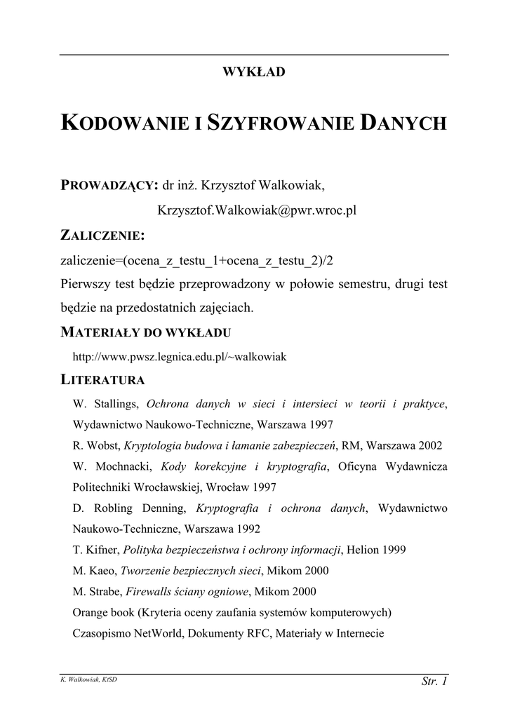 WYKŁAD KODOWANIE I SZYFROWANIE DANYCH PROWADZĄCY: dr inż. Krzysztof Walkowiak, [email protected] ZALICZENIE: zaliczenie=(ocena_z_testu_1+ocena_z_testu_2)/2 Pierwszy test będzie przeprowadzony w połowie semestru, drugi test będzie na przedostatnich zajęciach. MATERIAŁY DO WYKŁADU http://www.pwsz.legnica.edu.pl/~walkowiak LITERATURA W. Stallings, Ochrona danych w sieci i intersieci w teorii i praktyce, Wydawnictwo Naukowo-Techniczne, Warszawa 1997 R. Wobst, Kryptologia budowa i łamanie zabezpieczeń, RM, Warszawa 2002 W. Mochnacki, Kody korekcyjne i kryptografia, Oficyna Wydawnicza Politechniki Wrocławskiej, Wrocław 1997 D. Robling Denning, Kryptografia i ochrona danych, Wydawnictwo Naukowo-Techniczne, Warszawa 1992 T. Kifner, Polityka bezpieczeństwa i ochrony informacji, Helion 1999 M. Kaeo, Tworzenie bezpiecznych sieci, Mikom 2000 M. Strabe, Firewalls ściany ogniowe, Mikom 2000 Orange book (Kryteria oceny zaufania systemów komputerowych) Czasopismo NetWorld, Dokumenty RFC, Materiały w Internecie K. Walkowiak, KISD Str. 1 PROGRAM WYKŁADU • Wstęp. Ogólne definicje i pojęcia związane z bezpieczeństwem sieci komputerowych i ochroną danych. • Algorytmy szyfrujące symetryczne (z jednym kluczem). • Algorytmy asymetryczne (z dwoma kluczami). • Algorytmy haszujące. • Dystrybucja kluczy. • Poufność w sieciach komputerowych. • Zastosowania technik kryptograficznych w Internecie (pgp, ssl). • Uwierzytelnianie, sygnatury cyfrowe. • Sterowanie dostępem. • Znormalizowane kryteria oceny bezpieczeństwa systemów komputerowych. • Zapory ogniowe. • Bezpieczeństwo WLAN. • Niezawodność i przeżywalność sieci komputerowych. • Bezpieczeństwo danych. • Polityka bezpieczeństwa. • Kodowanie danych. K. Walkowiak, KISD Str. 2