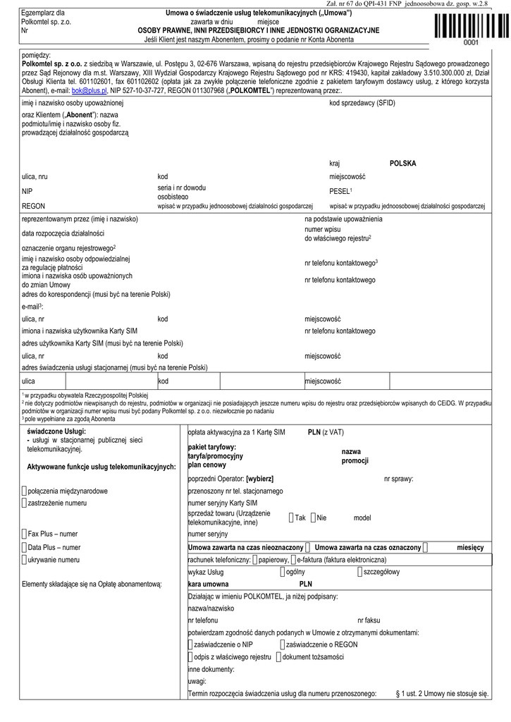 Zał. nr 67 do QPI-431 FNP jednoosobowa dz. gosp. w.2.8 Egzemplarz dla Polkomtel sp. z.o. Nr Umowa o świadczenie usług telekomunikacyjnych („Umowa”) zawarta w dniu miejsce OSOBY PRAWNE, INNI PRZEDSIĘBIORCY I INNE JEDNOSTKI OGRANIZACYJNE Jeśli Klient jest naszym Abonentem, prosimy o podanie nr Konta Abonenta pomiędzy: Polkomtel sp. z o.o. z siedzibą w Warszawie, ul. Postępu 3, 02-676 Warszawa, wpisaną do rejestru przedsiębiorców Krajowego Rejestru Sądowego prowadzonego przez Sąd Rejonowy dla m.st. Warszawy, XIII Wydział Gospodarczy Krajowego Rejestru Sądowego pod nr KRS: 419430, kapitał zakładowy 3.510.300.000 zł, Dział Obsługi Klienta tel. 601102601, fax 601102602 (opłata jak za zwykłe połączenie telefoniczne zgodnie z pakietem taryfowym dostawcy usług, z którego korzysta Abonent), e-mail: [email protected], NIP 527-10-37-727, REGON 011307968 („POLKOMTEL”) reprezentowaną przez:. imię i nazwisko osoby upoważnionej kod sprzedawcy (SFID) oraz Klientem („Abonent”): nazwa podmiotu/imię i nazwisko osoby fiz. prowadzącej działalność gospodarczą kraj ulica, nru NIP REGON POLSKA kod seria i nr dowodu osobistego miejscowość wpisać w przypadku jednoosobowej działalności gospodarczej wpisać w przypadku jednoosobowej działalności gospodarczej PESEL1 reprezentowanym przez (imię i nazwisko) na podstawie upoważnienia numer wpisu do właściwego rejestru2 data rozpoczęcia działalności oznaczenie organu rejestrowego2 imię i nazwisko osoby odpowiedzialnej za regulację płatności imiona i nazwiska osób upoważnionych do zmian Umowy adres do korespondencji (musi być na terenie Polski) nr telefonu kontaktowego3 nr telefonu kontaktowego e-mail3: ulica, nr kod miejscowość imiona i nazwiska użytkownika Karty SIM nr telefonu kontaktowego adres użytkownika Karty SIM (musi być na terenie Polski) ulica, nr kod adres świadczenia usługi stacjonarnej (musi być na terenie Polski) miejscowość ulica miejscowość kod 1w przypadku obywatela Rzeczypospolitej Polskiej dotyczy podmiotów niewpisanych do rejestru, podmiotów w organizacji nie posiadających jeszcze numeru wpisu do rejestru oraz przedsiębiorców wpisanych do CEiDG. W przypadku podmiotów w organizacji numer wpisu musi być podany Polkomtel sp. z o.o. niezwłocznie po nadaniu 3 pole wypełniane za zgodą Abonenta 2 nie świadczone Usługi: - usługi w stacjonarnej publicznej sieci telekomunikacyjnej. Aktywowane funkcje usług telekomunikacyjnych: opłata aktywacyjna za 1 Kartę SIM PLN (z VAT) pakiet taryfowy: taryfa/promocyjny plan cenowy nazwa promocji poprzedni Operator: [wybierz] nr sprawy: połączenia międzynarodowe przenoszony nr tel. stacjonarnego zastrzeżenie numeru numer seryjny Karty SIM sprzedaż towaru (Urządzenie telekomunikacyjne, inne) Fax Plus – numer Tak model numer seryjny Data Plus – numer Umowa zawarta na czas nieoznaczony ukrywanie numeru rachunek telefoniczny: papierowy, wykaz Usług Elementy składające się na Opłatę abonamentową: Nie kara umowna Umowa zawarta na czas oznaczony miesięcy e-faktura (faktura elektroniczna) ogólny szczegółowy PLN Działając w imieniu POLKOMTEL, ja niżej podpisany: nazwa/nazwisko nr telefonu nr faksu potwierdzam zgodność danych podanych w Umowie z otrzymanymi dokumentami: zaświadczenie o NIP odpis z właściwego rejestru zaświadczenie o REGON dokument tożsamości inne dokumenty: uwagi: Termin rozpoczęcia świadczenia usług dla numeru przenoszonego: § 1 ust. 2 Umowy nie stosuje się. Zał. nr 67 do QPI-431 FNP jednoosobowa dz. gosp. w.2.8 Użyte w Umowie określenia pisane z wielkiej litery posiadają znaczenie nadane im w Regulaminie świadczenia usług telekomunikacyjnych przez POLKOMTEL sp. z o.o. - Abonament („Regulamin”). §1 Świadczone Usługi. Termin oczekiwania na przyłączenie do sieci/termin rozpoczęcia świadczenia Usług 1. POLKOMTEL świadczy Usługi określone na stronie 1 Umowy. Uszczegółowione kategorie Usług świadczonych przez POLKOMTEL opisane są w Cenniku i w regulaminie promocji. 2. POLKOMTEL zobowiązuje się rozpocząć świadczenie Usług (przyłączyć do sieci) w czasie nie dłuższym niż 7 (siedem) dni od dnia zawarcia Umowy, z zastrzeżeniem ust. 3. 3. W przypadku gdy Abonent będący konsumentem zawarł Umowę na odległość lub poza lokalem przedsiębiorstwa oraz: a. zażądał rozpoczęcia świadczenia Usług przed upływem terminu do odstąpienia od Umowy - POLKOMTEL zobowiązuje się rozpocząć świadczenie Usług w terminie wskazanym w ust. 2, b. nie zażądał rozpoczęcia świadczenia Usług przed upływem terminu do odstąpienia od Umowy - POLKOMTEL zobowiązuje się rozpocząć świadczenie Usług następnego dnia po upływie 14-dniowego terminu na odstąpienie od Umowy. §2 Czas trwania Umowy oraz warunki jej przedłużenia i rozwiązania 1. Umowa zawarta jest na czas nieoznaczony lub oznaczony wskazany na stronie 1 Umowy („czas oznaczony Umowy”). 2. Po upływie czasu oznaczonego Umowy Umowa ulega przedłużeniu na czas nieoznaczony, o ile Abonent nie złoży przeciwnego oświadczenia na piśmie nie później niż na 30 dni przed upływem czasu oznaczonego Umowy. 3. Abonent może rozwiązać Umowę za pisemnym wypowiedzeniem. Okres wypowiedzenia wynosi 30 dni i liczony jest od pierwszego dnia Okresu rozliczeniowego następującego po Okresie rozliczeniowym, w którym złożono wypowiedzenie. Za dzień złożenia wypowiedzenia przyjmuje się dzień złożenia oświadczenia o wypowiedzeniu w Punkcie sprzedaży (obsługi) lub nadania przesyłki zawierającej wypowiedzenie do Działu Obsługi Klienta. Umowa ulega rozwiązaniu z upływem okresu wypowiedzenia. 4. W przypadku, gdy Abonent jest stroną więcej niż jednej Umowy, wypowiedzenie musi zawierać oznaczenie numeru telefonu, którego dotyczy Umowa. 5. Abonent, żądając przeniesienia przydzielonego numeru telefonu do innego dostawcy usług, może rozwiązać Umowę bez zachowania terminów wypowiedzenia