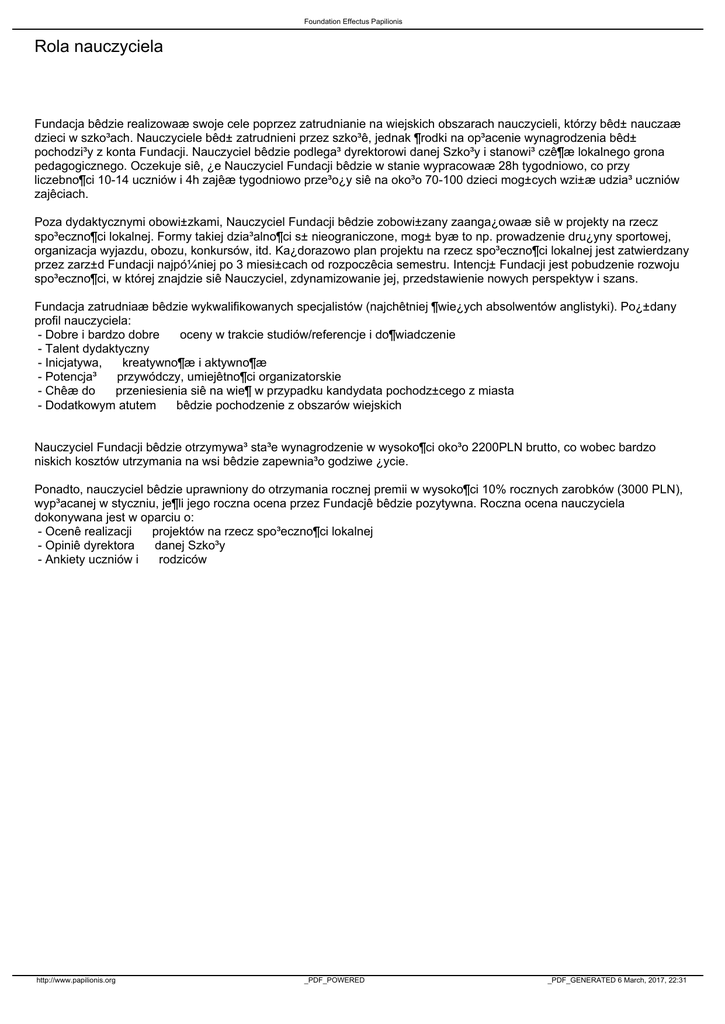 Foundation Effectus Papilionis Rola nauczyciela Fundacja bêdzie realizowaæ swoje cele poprzez zatrudnianie na wiejskich obszarach nauczycieli, którzy bêd± nauczaæ dzieci w szko³ach. Nauczyciele bêd± zatrudnieni przez szko³ê, jednak ¶rodki na op³acenie wynagrodzenia bêd± pochodzi³y z konta Fundacji. Nauczyciel bêdzie podlega³ dyrektorowi danej Szko³y i stanowi³ czê¶æ lokalnego grona pedagogicznego. Oczekuje siê, ¿e Nauczyciel Fundacji bêdzie w stanie wypracowaæ 28h tygodniowo, co przy liczebno¶ci 10-14 uczniów i 4h zajêæ tygodniowo prze³o¿y siê na oko³o 70-100 dzieci mog±cych wzi±æ udzia³ uczniów zajêciach. Poza dydaktycznymi obowi±zkami, Nauczyciel Fundacji bêdzie zobowi±zany zaanga¿owaæ siê w projekty na rzecz spo³eczno¶ci lokalnej. Formy takiej dzia³alno¶ci s± nieograniczone, mog± byæ to np. prowadzenie dru¿yny sportowej, organizacja wyjazdu, obozu, konkursów, itd. Ka¿dorazowo plan projektu na rzecz spo³eczno¶ci lokalnej jest zatwierdzany przez zarz±d Fundacji najpó¼niej po 3 miesi±cach od rozpoczêcia semestru. Intencj± Fundacji jest pobudzenie rozwoju spo³eczno¶ci, w której znajdzie siê Nauczyciel, zdynamizowanie jej, przedstawienie nowych perspektyw i szans. Fundacja zatrudniaæ bêdzie wykwalifikowanych specjalistów (najchêtniej ¶wie¿ych absolwentów anglistyki). Po¿±dany profil nauczyciela: - Dobre i bardzo dobre oceny w trakcie studiów/referencje i do¶wiadczenie - Talent dydaktyczny - Inicjatywa, kreatywno¶æ i aktywno¶æ - Potencja³ przywódczy, umiejêtno¶ci organizatorskie - Chêæ do przeniesienia siê na wie¶ w przypadku kandydata pochodz±cego z miasta - Dodatkowym atutem bêdzie pochodzenie z obszarów wiejskich Nauczyciel Fundacji bêdzie otrzymywa³ sta³e wynagrodzenie w wysoko¶ci oko³o 2200PLN brutto, co wobec bardzo niskich kosztów utrzymania na wsi bêdzie zapewnia³o godziwe ¿ycie. Ponadto, nauczyciel bêdzie uprawniony do otrzymania rocznej premii w wysoko¶ci 10% rocznych zarobków (3000 PLN), wyp³acanej w styczniu, je¶li jego roczna ocena przez Fundacjê bêdzie pozytywna. Roczna ocena nauczyciela dokonywana jest w oparciu o: - Ocenê realizacji projektów na rzecz spo³eczno¶ci lokalnej - Opiniê dyrektora danej Szko³y - Ankiety uczniów i rodziców http://www.papilionis.org _PDF_POWERED _PDF_GENERATED 6 March, 2017, 22:31