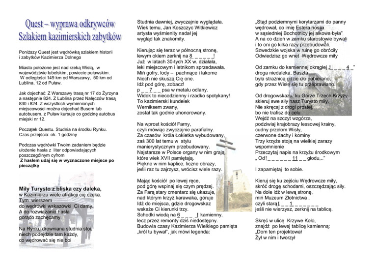 Studnia dawniej, zwyczajnie wyglądała. Wiek temu, Jan Koszczyc Witkiewicz artysta wyśmienity nadał jej wygląd tak znakomity. Poniższy Quest jest wędrówką szlakiem historii i zabytków Kazimierza Dolnego Miasto położone jest nad rzeką Wisłą, w województwie lubelskim, powiecie puławskim. W odległości 149 km od Warszawy, 50 km od Lublina, 12 od Puław. Jak dojechać: Z Warszawy trasą nr 17 do Żyrzyna a następnie 824. Z Lublina przez Nałęczów trasą 830 i 824. Z wszystkich wymienionych miejscowości można dojechać Busem lub autobusem, z Puław kursuje co godzinę autobus miejski nr 12. Początek Questu. Studnia na środku Rynku. Czas przejścia: ok. 1 godziny Podczas wędrówki Twoim zadaniem będzie ułożenie hasła z liter odpowiadających poszczególnym cyfrom.. Z hasłem udaj się w wyznaczone miejsce po pieczątkę Miły Turysto z bliska czy daleka, w Kazimierzu wiele atrakcji cię czeka. Tym wierszem do wędrówki wskazówki Ci damy. A do rozwiązania hasła gorąco zachęcamy. Na Rynku drewniana studnia stoi, niech podejdzie tam każdy, co wędrować się nie boi Kierując się teraz w północną stronę, lewym okiem zerknij na 8 _ _ _ _ _ Już w latach 30-tych XX w. działała, leki miejscowym i letnikom sprzedawała. Miń gofry, lody – pachnące i łakome Niech nie skuszą Cię one. Idź pod górę, zobacz! p _ _ 7 _ _ psa w metalu odlany. Widok to niecodzienny i rzadko spotykany! To kazimierski kundelek Werniksem zwany, został tak godnie uhonorowany. Na wprost kościół Farny, czyli mówiąc zwyczajnie parafialny. Za czasów króla Łokietka wybudowany, zaś 300 lat temu w stylu manierystycznym przebudowany. Najstarsze w Polsce organy w nim grają, które wiek XVII pamiętają. Piękne w nim kaplice, liczne obrazy, jeśli raz tu zajrzysz, wrócisz wiele razy. Mając kościół po lewej ręce, pod górę wspinaj się czym prędzej. Za Farą stary cmentarz się ukazuje, nad którym krzyż karawaka, góruje Idź do miejsca, gdzie drogowskaz wskaże Ci kierunki trzy. Schodki wiodą na 6 _ _ _ _ kamienny, lecz przez remonty dziś niedostępny. Budowla czasy Kazimierza Wielkiego pamięta „król tu bywał”, jak mówi legenda: „Stąd podziemnymi korytarzami do panny wędrował, co imię Estera nosiła w sąsiedniej Bochotnicy jej alkowa była” A na co dzień w zamku starostowie bywali i to oni go kilka razy przebudowali. Szwedzkie wojska w ruinę go obróciły Odwiedzisz go wnet Wędrowcze miły Od zamku do kamiennej okrągłej „_ _ _ _ 4 _” droga niedaleka, Baszta była strażnicą gdzie cło pobierano, gdy przez Wisłę się tu przeprawiano. Od drogowskazu, ku Górze Trzech Krzyży skieruj swe siły nasz Turysto miły. Nie skręcaj z drogi prostej, bo nie trafisz do celu Wejdź na szczyt wzgórza, podziwiaj krajobrazy lessowej krainy, cudny przełom Wisły, czerwone dachy i kominy Trzy krzyże stoją na wielkiej zarazy wspomnienie Przeczytaj napis na krzyżu środkowym „ Od _ _ _ _ _ _ 11 _ _ głodu,..” I zapamiętaj to sobie. Kieruj się ku zejściu Wędrowcze miły, skróć drogę schodami, oszczędzając siły. Na dole idź w lewą stronę, miń Muzeum Złotnictwa , czyli starą , _ _ 1 _ _ _ _ _ _ jeśli nie wierzysz, zerknij na tablicę. Skręć w ulicę Krzywe Koło, znajdź po lewej tablicę kamienną: „Dom ten projektował Żył w nim i tworzył Karol _ 2 _ _ _ _ _ _” Jego zasługi dla miasta Kazimierza są rzeczą znamienną. Przetnij ul. Lubelską, podziwiaj malarskie galerie, kroków kilka zrób w prawą stronę koło Cafe Plus, znajdź schody w dół, do zejścia przydadzą się one, po prawej stronie synagoga, „Domem 9 _ _ _ _ _ _ _ _ Beitanu” zwana. Na niej tablica upamiętnia Żydów, którzy do synagogi na modły chodzili. i w czasie II Wojny swe życie stracili. Wejdź na Mały Rynek, tu Żydzi mieszkali, a w drewnianych jatkach, co na środku stoją, mięso koszerne kupowali. Nad Małym Rynkiem kościół Św. Anny góruje, przyznaj swą urodą oko twe raduje. Mijając placu zabaw, przejdź most kamiennym, pod którym potok płynie senny. To Grodarz, co czasem groźne wody toczył i dawniej nieraz powodzią zaskoczył. Śmiało przejdź na drugą stronę. W ulicę Plebankę skieruj kroki swe i zaraz w prawo niech nogi poniosą cię. Uliczką P _ _ _ 10 _ _ _ do końca krocz śmiele. I drewnianymi schodami wspinając się przy franciszkanów znajdziesz się _ _ _ _ _ 3 _ _.Dawniej w czasach jeszcze przed chrześcijańskich Było to miejsce kultu bóstw pogańskich A ci co tu mieszkali czarnego kura do rozpadliny wrzucali Potem powstała kaplica, której patronką była Przenajświętsza Dziewica. Kazimierzanie kościół postawili i w XVII w franciszkanów sprowadzili. Odtąd pielgrzymi tu przybywają Cudownemu obrazowi Zwiastowania NMP swe życie zawierzają. Cuda wielkie tu się działy Kroniki klasztorne od dawna je uwieczniały. Obraz w ołtarzu w korony papieskie zdobny Wrzuć grosz do skarbony Turysto szczodry Wychodząc z kościoła w lewą kieruj się stronę, tam drzwi do klasztoru śmiało otwórz one. Idź prosto krużgankiem, w środku ogród wirydarzem zwany, ze studnią głęboką spokój tu niespotykany. Wyjdź na dziedziniec brukowany kamieniem, i dolinę Wisły, ogarnij swym spojrzeniem. Zejdź w dół po bruku, po prawej pomnik „Cud nad Wisłą” sławi, na murze klasztornym zaś tablice, tu bohaterów kazimierskich nazwiska wyryte Ulica K_ 12 _ _ _ _ 5 _ _ nią krocz śmiele, Ku Rynkowi wędruj, wysiłku niewiele. Na Ryku po prawej kamienica Gdańską zwana, nazwa stąd, że zboże kiedyś nad morze spławiano, a dziś Jarmark Polski jest tam, cudów w nim ogrom nie tylko dla dam Przed Tobą zaś dwie złączone kamienice. dwóch braci Przybylów je postawiło i świętych patronów na fasadach umieściło Bogato zdobione, słyną na kraj cały. Czas skończyć wędrówki Twe Wpisz rozwiązania nad kreseczki te: 1 2 3 4 5 6 7 8 9 10 11 12 A dowiesz się jak to miasto zwano nim Kazimierzem Dolny