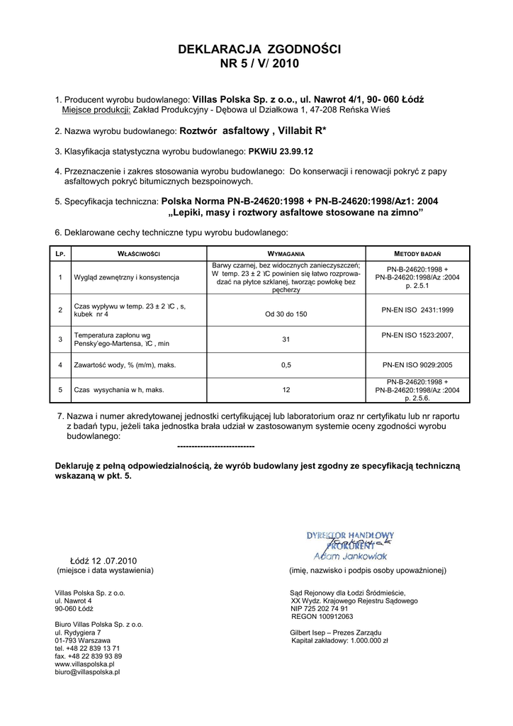 DEKLARACJA ZGODNOŚCI NR 5 / V/ 2010 1. Producent wyrobu budowlanego: Villas Polska Sp. z o.o., ul. Nawrot 4/1, 90- 060 Łódź Miejsce produkcji: Zakład Produkcyjny - Dębowa ul Działkowa 1, 47-208 Reńska Wieś 2. Nazwa wyrobu budowlanego: Roztwór asfaltowy , Villabit R* 3. Klasyfikacja statystyczna wyrobu budowlanego: PKWiU 23.99.12 4. Przeznaczenie i zakres stosowania wyrobu budowlanego: Do konserwacji i renowacji pokryć z papy asfaltowych pokryć bitumicznych bezspoinowych. 5. Specyfikacja techniczna: Polska Norma PN-B-24620:1998 + PN-B-24620:1998/Az1: 2004 „Lepiki, masy i roztwory asfaltowe stosowane na zimno” 6. Deklarowane cechy techniczne typu wyrobu budowlanego: L P. WŁAŚCIWOŚCI WYMAGANIA METODY BADAŃ Barwy czarnej, bez widocznych zanieczyszczeń; W temp. 23 ± 2 °C powinien się łatwo rozprowadzać na płytce szklanej, tworząc powłokę bez pęcherzy PN-B-24620:1998 + PN-B-24620:1998/Az :2004 p. 2.5.1 1 Wygląd zewnętrzny i konsystencja 2 Czas wypływu w temp. 23 ± 2 °C , s, kubek nr 4 3 Temperatura zapłonu wg Pensky’ego-Martensa, °C , min 31 4 Zawartość wody, % (m/m), maks. 0,5 PN-EN ISO 9029:2005 5 Czas wysychania w h, maks. 12 PN-B-24620:1998 + PN-B-24620:1998/Az :2004 p. 2.5.6. Od 30 do 150 PN-EN ISO 2431:1999 PN-EN ISO 1523:2007, 7. Nazwa i numer akredytowanej jednostki certyfikującej lub laboratorium oraz nr certyfikatu lub nr raportu z badań typu, jeżeli taka jednostka brała udział w zastosowanym systemie oceny zgodności wyrobu budowlanego: --------------------------Deklaruję z pełną odpowiedzialnością, że wyrób budowlany jest zgodny ze specyfikacją techniczną wskazaną w pkt. 5. Łódź 12 .07.2010 (miejsce i data wystawienia) (imię, nazwisko i podpis osoby upoważnionej) Villas Polska Sp. z o.o. ul. Nawrot 4 90-060 Łódź Sąd Rejonowy dla Łodzi Śródmieście, XX Wydz. Krajowego Rejestru Sądowego NIP 725 202 74 91 REGON 100912063 Biuro Villas Polska Sp. z o.o. ul. Rydygiera 7 01-793 Warszawa tel. +48 22 839 13 71 fax. +48 22 839 93 89 www.villaspolska.pl [email protected] Gilbert Isep – Prezes Zarządu Kapitał zakładowy: 1.000.000 zł 2