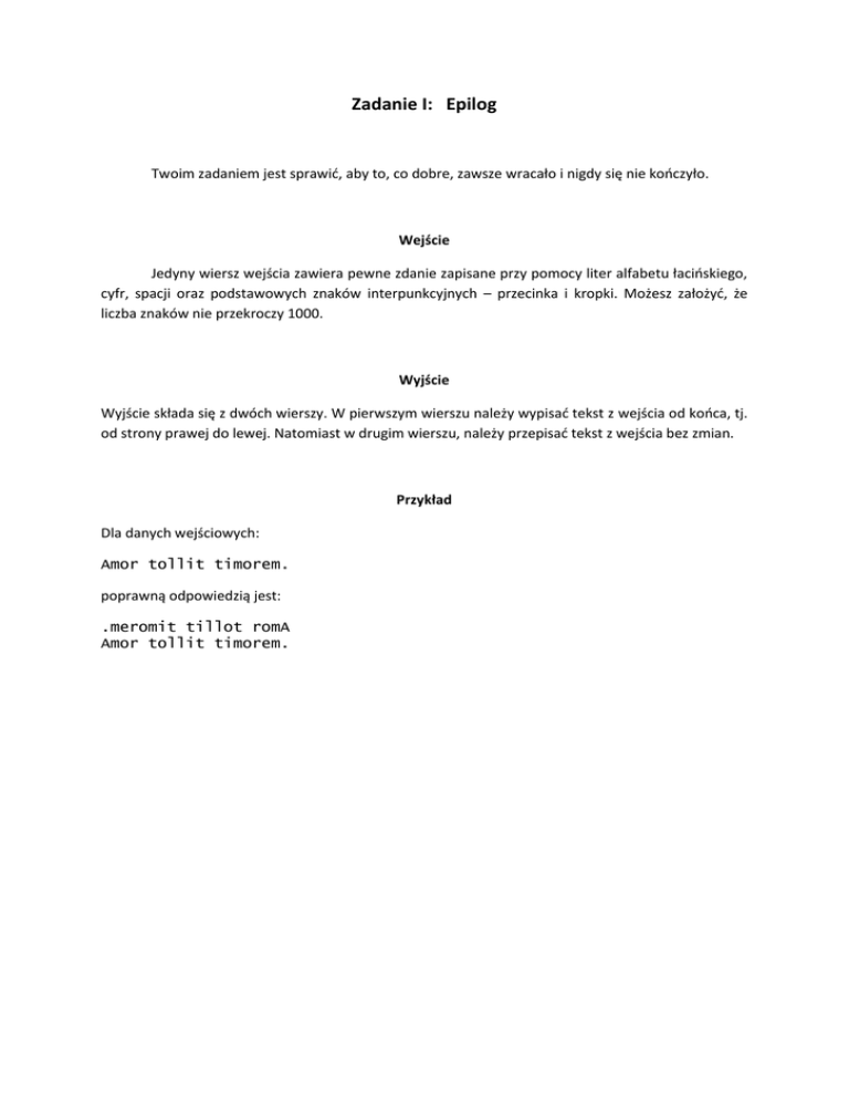 Zadanie I: Epilog Twoim zadaniem jest sprawić, aby to, co dobre, zawsze wracało i nigdy się nie kończyło. Wejście Jedyny wiersz wejścia zawiera pewne zdanie zapisane przy pomocy liter alfabetu łacińskiego, cyfr, spacji oraz podstawowych znaków interpunkcyjnych – przecinka i kropki. Możesz założyć, że liczba znaków nie przekroczy 1000. Wyjście Wyjście składa się z dwóch wierszy. W pierwszym wierszu należy wypisać tekst z wejścia od końca, tj. od strony prawej do lewej. Natomiast w drugim wierszu, należy przepisać tekst z wejścia bez zmian. Przykład Dla danych wejściowych: Amor tollit timorem. poprawną odpowiedzią jest: .meromit tillot romA Amor tollit timorem.