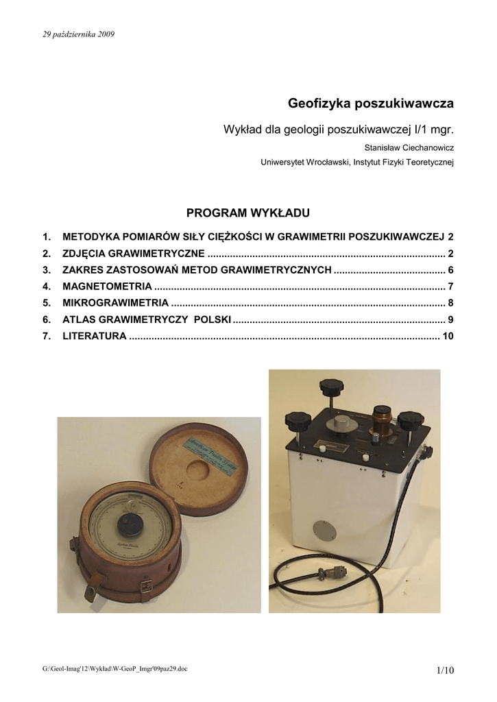 29 października 2009 Geofizyka poszukiwawcza Wykład dla geologii poszukiwawczej I/1 mgr. Stanisław Ciechanowicz Uniwersytet Wrocławski, Instytut Fizyki Teoretycznej PROGRAM WYKŁADU 1. METODYKA POMIARÓW SIŁY CIĘŻKOŚCI W GRAWIMETRII POSZUKIWAWCZEJ 2 2. ZDJĘCIA GRAWIMETRYCZNE ..................................................................................... 2 3. ZAKRES ZASTOSOWAŃ METOD GRAWIMETRYCZNYCH ........................................ 6 4. MAGNETOMETRIA ........................................................................................................ 7 5. MIKROGRAWIMETRIA .................................................................................................. 8 6. ATLAS GRAWIMETRYCZY POLSKI ............................................................................ 9 7. LITERATURA ............................................................................................................... 10 G:\Geol-Imag'12\Wykład\W-GeoP_Imgr'09paz29.doc 1/10 29 października 2009 1. METODYKA POMIARÓW SIŁY CIĘŻKOŚCI W GRAWIMETRII POSZUKIWAWCZEJ 1. Zasada pomiaru grawimetrem polowym. Wykonuje się pomiar względny na powierzchni terenu z dokładnością rzędu przynajmniej 0,01 mGal=10Gal. Pomiar ten polega na wyznaczaniu różnicy siły ciężkości g między dwoma punktami pomiarowymi, których położenie geograficzne i wysokość npm. wyznacza się z dokładnością do kilku mm. Wartość absolutną natężenia siły ciężkości g w danym punkcie pomiarowym otrzymujemy poprzez nawiązanie pomierzonej różnicyg do wartości bezwzględnej w punkcie podstawowym. W ten sposób wyznaczamy wartości bezwzględne siły ciężkości g dla poszczególnych punktów pomiarowych. Grawimetr polowy może być również używany do pomiarów siły ciężkości pod ziemią. Specjalnie skonstruowane grawimetry służą do pomiarów otworowych. W mikrograwimetrii wymagana dokładność grawimetrów wynosi 5 Gal. 2. Metodyka pomiarów grawimetrycznych: sieć pomiarów podstawowa i wypełniająca. Pomiary względne w punktach sieci podstawowej wykonywane są metodą łańcuchową. Poniżej opisano metodę łańcuchową na przykładzie ciągu sześciu punktów bazowych, leżących daleko od siebie i oznaczonych jako A, B, C, D, E, F. Pomiary wykonane grawimetrem dają szereg szesnastu odczytów; Dryft grawimetru (chód własny) jest to samoistne przesunięcie punktu zerowego narastające w miarę upływu czasu [6, p. 24]. Sposób pomiarów w punktach sieci wypełniającej; A1,2,3,, nB1,2,3,, nC , A, B, C – punkty bazowe, 1,2,3,...,n – punkty wypełniające. Każdy ciąg odczytów w punktach wypełniających rozpoczyna się i kończy na punkcie bazowym, przy czym bazowy punkt końcowy może być inny niż punkt początkowy. Dryft w danym punkcie szczegółowym oblicza się podobnie jak w metodzie łańcuchowej za pomocą szybkości dryftu mnożonej przez odpowiedni upływ czasu, jaki nastąpił do chwili odczytu w tym punkcie. Jeśli punkty bazowe początkowy i końcowy są różne, to w celu obliczenia dryftu dla punktów wypełniających należy od różnicy odczytów siły ciężkości w punktach bazowych odliczyć względną wartość siły ciężkości między tymi punktami. 2. ZDJĘCIA GRAWIMETRYCZNE Termin zdjęcie grawimetryczne oznacza zestawienie w formie opisowej i graficznej (na podkładzie topograficznym, odręcznie lub w trybie cyfrowym) wszystkich danych i wyników pomiarowych opracowanych dla określonych wielkości grawimetrycznych. Przeważnie są to w pierwszej kolejności anomalie Bouguer’a. Podobnie jest zdefiniowane zdjęcie magnetyczne, przy czym anomalie pola geomagnetycznego mają własną definicję. ABA BCBCDC DED EFE F , Rodzaje zdjęć grawimetrycznych w punktach zewnętrznych A, F odczyt jest dwukrotny, w punktach wewnętrznych B, C, D, E odczyt jest trzykrotny. Celem metody łańcuchowej jest eliminacja dryftu grawimetru podczas pomiarów dokonywanych w okresie jego liniowości. G:\Geol-Imag'12\Wykład\W-GeoP_Imgr'09paz29.doc Wykonuje się zdjęcia grawimetryczne następujących rodzajów: a) Zdjęcia rekonesansowe b) Zdjęcia regionalne 2/10 29 października 2009 c) Zdjęcia półszczegółowe i szczegółowe Zdjęcia regionalne oraz półszczegółowe i szczegółowe wykonuje się w dwóch etapach; i. Pomiary w sieci podstawowej – punkty pomiarowe (bazowe) rozmieszcza się równomiernie i względnie rzadko, sposób pomiarów metodą łańcuchową ii. Pomiary w sieci wypełniającej – z Wszystkie rodzaje zdjęć mogą być zarówno typu profilowego jak i powierzchniowego; Zdjęcie profilowe – ciągi pomiarowe biegną prostopadle do osi podłużnej struktury geologicznej Zdjęcia powierzchniowe Tabela 1. Rodzaje zdjęć grawimetrycznych – punkty pomiarowe w miarę Zdjęcia próbkowanie podkład topograficzny równomiernie pokrywają grawimetryczne określony obszar. rekonesansowe Liczba punktów 1/5km2 – 1/400km2 1:200000 – 1:500000 pomiarowych na jednostkę regionalne powierzchni zdjęcia (tzw. 1/km2 – 1/5 km2 1:50000 – 1:100000 próbkowanie) jest ustalana półszczegółowe zależnie od rodzaju zdjęcia, 2/km2 – 10000/km2 1:1000 – 1:50000 i szczegółowe wielkości obszaru, wielkości struktur przewidzianych do nawiązaniem do ustalonych punktów zdjęcia i od zadania geologicznego. bazowych. Próbkowanie uwzględnia również amplitudę Na większej powierzchni terenu sieć badanej anomalii – mniejsze amplitudy punktów pomiarowych zdjęcia jest wymagają większego zagęszczenia nieregularna. Dla potrzeb interpretacji, punktów. metodami interpolacji różnego rodzaju takie zdjęcie jest przekształcane w regularną Zdjęcia rekonesansowe prowadzone siatkę kwadratową. Warto dodać, że w są w ramach zwiadu geofizycznego na drodze współpracy międzynarodowej, terenie całkowicie nierozpoznanym pod metodą pomiarów satelitarnych rozpoczęto względem grawimetrycznym; wykonywanie zdjęć grawimetrycznych i o pod