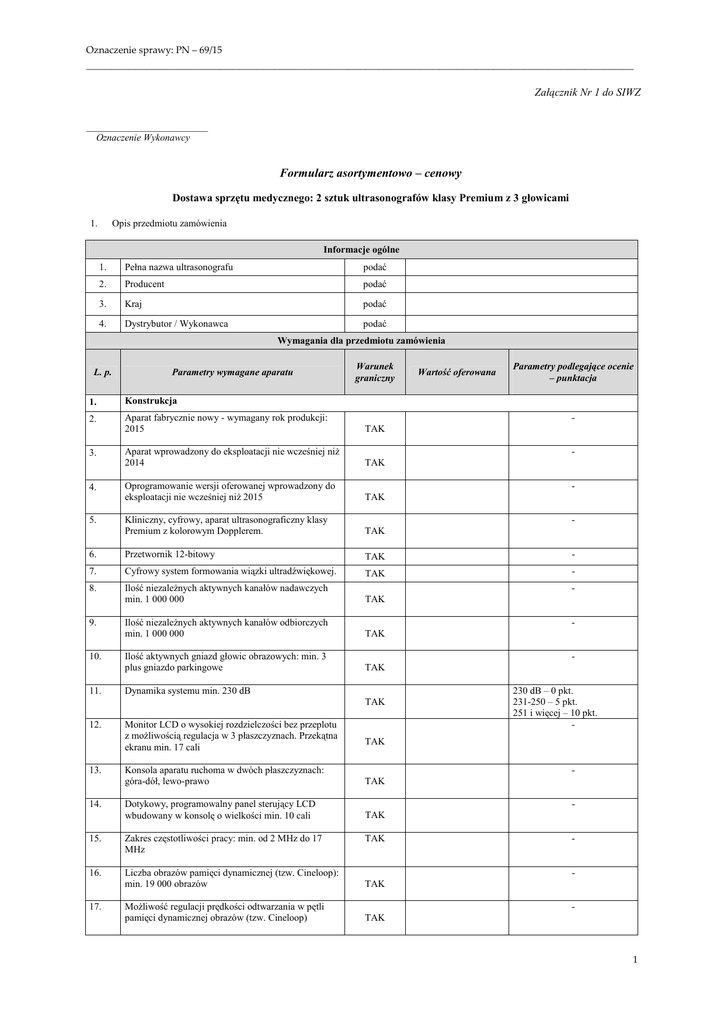 Oznaczenie sprawy: PN – 69/15 __________________________________________________________________________________________ Załącznik Nr 1 do SIWZ _________________________ Oznaczenie Wykonawcy Formularz asortymentowo – cenowy Dostawa sprzętu medycznego: 2 sztuk ultrasonografów klasy Premium z 3 głowicami 1. Opis przedmiotu zamówienia Informacje ogólne 1. Pełna nazwa ultrasonografu podać 2. Producent podać 3. Kraj podać 4. Dystrybutor / Wykonawca podać Wymagania dla przedmiotu zamówienia L. p. Parametry wymagane aparatu Warunek graniczny 1. Konstrukcja 2. Aparat fabrycznie nowy - wymagany rok produkcji: 2015 TAK Aparat wprowadzony do eksploatacji nie wcześniej niż 2014 TAK Oprogramowanie wersji oferowanej wprowadzony do eksploatacji nie wcześniej niż 2015 TAK Kliniczny, cyfrowy, aparat ultrasonograficzny klasy Premium z kolorowym Dopplerem. TAK 6. Przetwornik 12-bitowy TAK 7. Cyfrowy system formowania wiązki ultradźwiękowej. TAK 8. Ilość niezależnych aktywnych kanałów nadawczych min. 1 000 000 TAK Ilość niezależnych aktywnych kanałów odbiorczych min. 1 000 000 TAK Ilość aktywnych gniazd głowic obrazowych: min. 3 plus gniazdo parkingowe TAK 3. 4. 5. 9. 10. 11. - - - 13. 14. - - - 230 dB – 0 pkt. 231-250 – 5 pkt. 251 i więcej – 10 pkt. - TAK Konsola aparatu ruchoma w dwóch płaszczyznach: góra-dół, lewo-prawo TAK - Dotykowy, programowalny panel sterujący LCD wbudowany w konsolę o wielkości min. 10 cali TAK - 15. Zakres częstotliwości pracy: min. od 2 MHz do 17 MHz 16. Liczba obrazów pamięci dynamicznej (tzw. Cineloop): min. 19 000 obrazów TAK Możliwość regulacji prędkości odtwarzania w pętli pamięci dynamicznej obrazów (tzw. Cineloop) TAK 17. - - Dynamika systemu min. 230 dB Monitor LCD o wysokiej rozdzielczości bez przeplotu z możliwością regulacja w 3 płaszczyznach. Przekątna ekranu min. 17 cali Parametry podlegające ocenie – punktacja - TAK 12. Wartość oferowana TAK - - - 1 Oznaczenie sprawy: PN – 69/15 __________________________________________________________________________________________ 18. Możliwość uzyskania sekwencji Cineloop w trybie 4B tj. 4 niezależnych sekwencji Cineloop jednocześnie na jednym obrazie TAK 19. Pamięć dynamiczna dla trybu M-mode lub D-mode min. 150 sek. 20. Regulacja głębokości pola obrazowania min. 1 - 35 cm TAK Ilość ustawień wstępnych (tzw. Presetów) programowanych przez użytkownika: minimum 70 TAK 21. 22. Podstawa jezdna z czterema obrotowymi kołami z możliwością blokowania każdego z kół oraz blokadą kierunku jazdy 23. Obrazowanie i prezentacja obrazu 24. Kombinacje prezentowanych jednocześnie obrazów. Min. • B, B + B, 4 B • M • B+M • D • B+D • B + C (Color Doppler) • B + PD (Power Doppler) • 4 B (Color Doppler) • 4 B (Power Doppler) • B + Color + M 25. Odświeżanie obrazu (Frame Rate) dla trybu B: min. 500 obrazów/sek. TAK TAK - TAK TAK Odświeżanie obrazu (Frame Rate) B + kolor (CD): min. 200 obrazów/sek. 27. Szerokopasmowe obrazowanie harmoniczne min. 4 pasma częstotliwości TAK 28. Obrazowanie w trybie Doppler Kolorowy (CD) TAK 29. Zakres prędkości Dopplera Kolorowego (CD) min.: +/- 4,0 m/sek TAK Obrazowanie w trybie Power Doppler (PD) i Power Doppler Kierunkowy 31. Obrazowanie w rozszerzonym trybie Color Doppler o bardzo wysokiej czułości i rozdzielczości z możliwością wizualizacji bardzo wolnych przepływów w małych naczyniach 32. 33. 34. 35. 36. 37. Obrazowanie w trybie Dopplera Pulsacyjnego PWD oraz HPRF PWD (o wysokiej częstotliwości powtarzania) TAK - 4 pasma – 0 pkt. 5 pasm – 5 pkt. 6 pasm i powyżej – 10 pkt. - TAK - TAK TAK Zakres prędkości Dopplera pulsacyjnego (PWD) min.: +/- 6,0 m/sek (przy zerowym kącie bramki) TAK Regulacja bramki dopplerowskiej w zakresie: min. od 1 mm do 20 mm TAK Możliwość odchylenia wiązki Dopplerowskiej w zakresie: min. +/- 30 stopni TAK Możliwość korekcji kąta bramki dopplerowskiej w zakresie: min. +/- 80 stopni TAK Automatyczna korekcja kąta bramki dopplerowskiej za pomocą jednego przycisku w zakresie min. +/- 80 stopni 1-35 cm – 0 pkt. 1-40 cm – 5 pkt. 0,5-40 cm i więcej – 10 pkt. - - 26. 30. - - 1-20 mm – 0 pkt. Powyżej – 10 pkt. - - TAK/NIE Nie – 0 pkt Tak – 10 pkt. 2 Oznaczenie sprawy: PN – 69/15 __________________________________________________________________________________________ 38. 39. 40. 41. 42. 43. Możliwość jednoczesnego (w czasie rzeczywistym) uzyskania spectrum przepływu z dwóch niezależnych bramek dopplerowskich TAK Obrazowanie w trybie M-mode anatomiczny w czasie rzeczywistym Min. 2 kursory (linie proste) TAK 2 kursory – 0 pkt. 3 kursory – 10 pkt. Obrazowanie w trybie M-mode anatomiczny z pamięci Cineloop Min. 2 kursory (linie proste) TAK 2 kursory – 0 pkt. 3 kursory – 10 pkt. Obrazowanie typu „Compound” w układzie wiązek ultradźwięków wysyłanych pod wieloma kątami i z różnymi częstotliwościami (tzw. skrzyżowane ultradźwięki) Liczba wiązek tworzących obraz w obrazowaniu typu „Compound” min. 5 System obrazowania wyostrzający kontury i redukujący artefakty szumowe – dostępny na wszystkich głowicach TAK TAK TAK 44. Obrazowanie w trybie Triplex – (B+CD/PD +PWD) TAK 45. Jednoczesne obrazowanie B + B/CD (Color/Power Doppler) w czasie rzeczywistym TAK Obrazowanie trapezowe i rombowe na głowicach liniowych TAK Automatyczna optymalizacja obrazu B i spektrum dopplerowskiego za pomocą jednego przycisku TAK Zasięgowa regulacja wzmocnienia (TGC lub STC) min. w 8 strefach TAK Możliwość zmian map koloru w Color Dopplerze min. 20 map TAK Możliwość regulacji wzmocnienia GAIN w czasie rzeczywistym i po zamrożeniu TAK 51. Oprogramowanie do badań z kontrastem TAK 52. Tkankowe obrazowanie elastograficzne w czasie rzeczywistym umożliwiające zobrazowanie różnic sztywności tkanki 46. 47. 48. 49. 50. 53. 54. 55. 56. Prezentacja elastyczności tkanki w skali kodowanej kolorem. Praca w tr