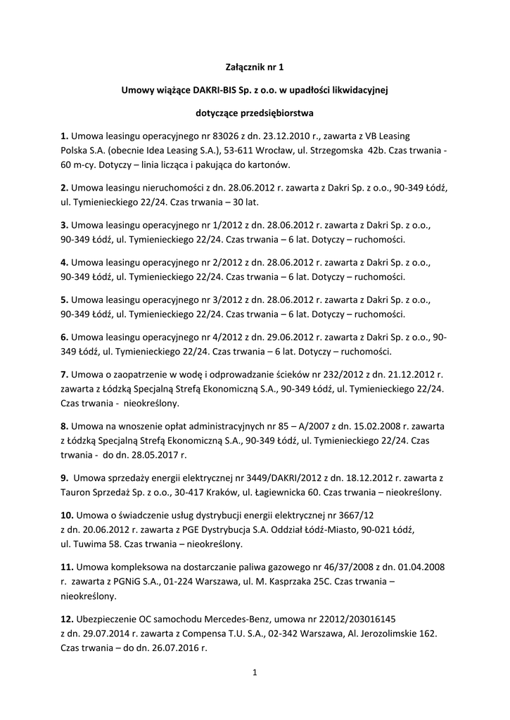 Załącznik nr 1 Umowy wiążące DAKRI-BIS Sp. z o.o. w upadłości likwidacyjnej dotyczące przedsiębiorstwa 1. Umowa leasingu operacyjnego nr 83026 z dn. 23.12.2010 r., zawarta z VB Leasing Polska S.A. (obecnie Idea Leasing S.A.), 53-611 Wrocław, ul. Strzegomska 42b. Czas trwania 60 m-cy. Dotyczy – linia licząca i pakująca do kartonów. 2. Umowa leasingu nieruchomości z dn. 28.06.2012 r. zawarta z Dakri Sp. z o.o., 90-349 Łódź, ul. Tymienieckiego 22/24. Czas trwania – 30 lat. 3. Umowa leasingu operacyjnego nr 1/2012 z dn. 28.06.2012 r. zawarta z Dakri Sp. z o.o., 90-349 Łódź, ul. Tymienieckiego 22/24. Czas trwania – 6 lat. Dotyczy – ruchomości. 4. Umowa leasingu operacyjnego nr 2/2012 z dn. 28.06.2012 r. zawarta z Dakri Sp. z o.o., 90-349 Łódź, ul. Tymienieckiego 22/24. Czas trwania – 6 lat. Dotyczy – ruchomości. 5. Umowa leasingu operacyjnego nr 3/2012 z dn. 28.06.2012 r. zawarta z Dakri Sp. z o.o., 90-349 Łódź, ul. Tymienieckiego 22/24. Czas trwania – 6 lat. Dotyczy – ruchomości. 6. Umowa leasingu operacyjnego nr 4/2012 z dn. 29.06.2012 r. zawarta z Dakri Sp. z o.o., 90349 Łódź, ul. Tymienieckiego 22/24. Czas trwania – 6 lat. Dotyczy – ruchomości. 7. Umowa o zaopatrzenie w wodę i odprowadzanie ścieków nr 232/2012 z dn. 21.12.2012 r. zawarta z Łódzką Specjalną Strefą Ekonomiczną S.A., 90-349 Łódź, ul. Tymienieckiego 22/24. Czas trwania - nieokreślony. 8. Umowa na wnoszenie opłat administracyjnych nr 85 – A/2007 z dn. 15.02.2008 r. zawarta z Łódzką Specjalną Strefą Ekonomiczną S.A., 90-349 Łódź, ul. Tymienieckiego 22/24. Czas trwania - do dn. 28.05.2017 r. 9. Umowa sprzedaży energii elektrycznej nr 3449/DAKRI/2012 z dn. 18.12.2012 r. zawarta z Tauron Sprzedaż Sp. z o.o., 30-417 Kraków, ul. Łagiewnicka 60. Czas trwania – nieokreślony. 10. Umowa o świadczenie usług dystrybucji energii elektrycznej nr 3667/12 z dn. 20.06.2012 r. zawarta z PGE Dystrybucja S.A. Oddział Łódź-Miasto, 90-021 Łódź, ul. Tuwima 58. Czas trwania – nieokreślony. 11. Umowa kompleksowa na dostarczanie paliwa gazowego nr 46/37/2008 z dn. 01.04.2008 r. zawarta z PGNiG S.A., 01-224 Warszawa, ul. M. Kasprzaka 25C. Czas trwania – nieokreślony. 12. Ubezpieczenie OC samochodu Mercedes-Benz, umowa nr 22012/203016145 z dn. 29.07.2014 r. zawarta z Compensa T.U. S.A., 02-342 Warszawa, Al. Jerozolimskie 162. Czas trwania – do dn. 26.07.2016 r. 1 13. Ubezpieczenie odpowiedzialności cywilnej, polisa nr 908538020822 z dn. 13.06.2015r. zawarta z TUiR WARTA S.A. 00-805 Warszawa, ul. Chmielna 85/87. Czas trwania – do dn. 12.06.2016r. 14. Ubezpieczenie mienia od ognia i innych zdarzeń losowych, polisa typ 8001 nr 000017998 z dn. 28.05.2015 r. zawarta z Compensa T.U. S.A., 02-342 Warszawa, Al. Jerozolimskie 162. Czas trwania – do dn. 28.05.2016 r. 15. Umowa o ochronę mienia nr 1/06/2013 z dn. 01.06.2013 r. zawarta między ARJAN M. Rojewski i Wspólnicy sp. k., 91-328 Łódź, ul. Polna 15A, a Dakri Dystrybucja Sp. z o.o. przy udziale Syndyka Masy Upadłości Dakri-Bis Sp. z o.o. w upadłości likwidacyjnej. Czas trwania – nieokreślony. 16. Umowa najmu BTS (powierzchni dachu) nr 29798 z dn. 30.04.2014 r. zawarta z T-Mobile Polska S.A., 02-674 Warszawa, ul. Marynarska 12. Czas trwania – nieokreślony. 2