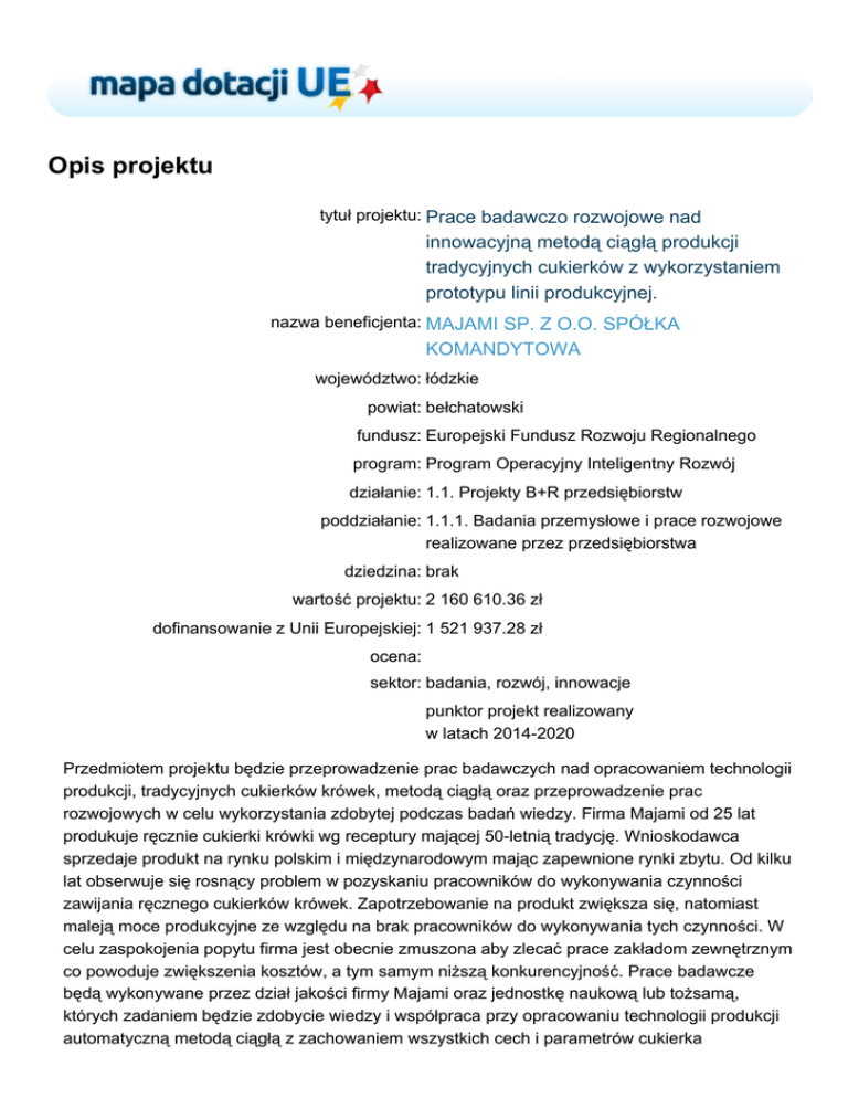 Opis projektu tytuł projektu: Prace badawczo rozwojowe nad innowacyjną metodą ciągłą produkcji tradycyjnych cukierków z wykorzystaniem prototypu linii produkcyjnej. nazwa beneficjenta: MAJAMI SP. Z O.O. SPÓŁKA KOMANDYTOWA województwo: łódzkie powiat: bełchatowski fundusz: Europejski Fundusz Rozwoju Regionalnego program: Program Operacyjny Inteligentny Rozwój działanie: 1.1. Projekty B+R przedsiębiorstw poddziałanie: 1.1.1. Badania przemysłowe i prace rozwojowe realizowane przez przedsiębiorstwa dziedzina: brak wartość projektu: 2 160 610.36 zł dofinansowanie z Unii Europejskiej: 1 521 937.28 zł ocena: sektor: badania, rozwój, innowacje punktor projekt realizowany w latach 2014-2020 Przedmiotem projektu będzie przeprowadzenie prac badawczych nad opracowaniem technologii produkcji, tradycyjnych cukierków krówek, metodą ciągłą oraz przeprowadzenie prac rozwojowych w celu wykorzystania zdobytej podczas badań wiedzy. Firma Majami od 25 lat produkuje ręcznie cukierki krówki wg receptury mającej 50-letnią tradycję. Wnioskodawca sprzedaje produkt na rynku polskim i międzynarodowym mając zapewnione rynki zbytu. Od kilku lat obserwuje się rosnący problem w pozyskaniu pracowników do wykonywania czynności zawijania ręcznego cukierków krówek. Zapotrzebowanie na produkt zwiększa się, natomiast maleją moce produkcyjne ze względu na brak pracowników do wykonywania tych czynności. W celu zaspokojenia popytu firma jest obecnie zmuszona aby zlecać prace zakładom zewnętrznym co powoduje zwiększenia kosztów, a tym samym niższą konkurencyjność. Prace badawcze będą wykonywane przez dział jakości firmy Majami oraz jednostkę naukową lub tożsamą, których zadaniem będzie zdobycie wiedzy i współpraca przy opracowaniu technologii produkcji automatyczną metodą ciągłą z zachowaniem wszystkich cech i parametrów cukierka produkowanego ręcznie. Metoda ciągła produkcji zastępowałaby pracę ręczną produkcji cukierków pracą zmechanizowaną. Do zachowania tożsamej charakterystyki cukierka niezbędne jest opracowanie technologii produkcji, która przy eliminacji pracy ludzkiej ale przy wykorzystaniu tej samej receptury pozwoli uzyskać produkt identyczny. Na podstawie posiadanej koncepcji dział infrastruktury firmy Majami zbuduje prototyp kompletnej linii produkcyjnej, na którym będą wykonywane próby. Prace rozwojowe będą polegały na testowaniu produkcji oraz potwierdzeniu wyników zdobytej wiedzy poprzez demonstrację innowacyjnej technologii produkcji metodą ciągłą w warunkach rzeczywistego funkcjonowania. Na etapie prac rozwojowych zostanie opracowania kompletna dokumentacja systemowa niezbędna do wdrożenia wyników prac badawczo-rozwojowych we własnych przedsiębiorstwie.