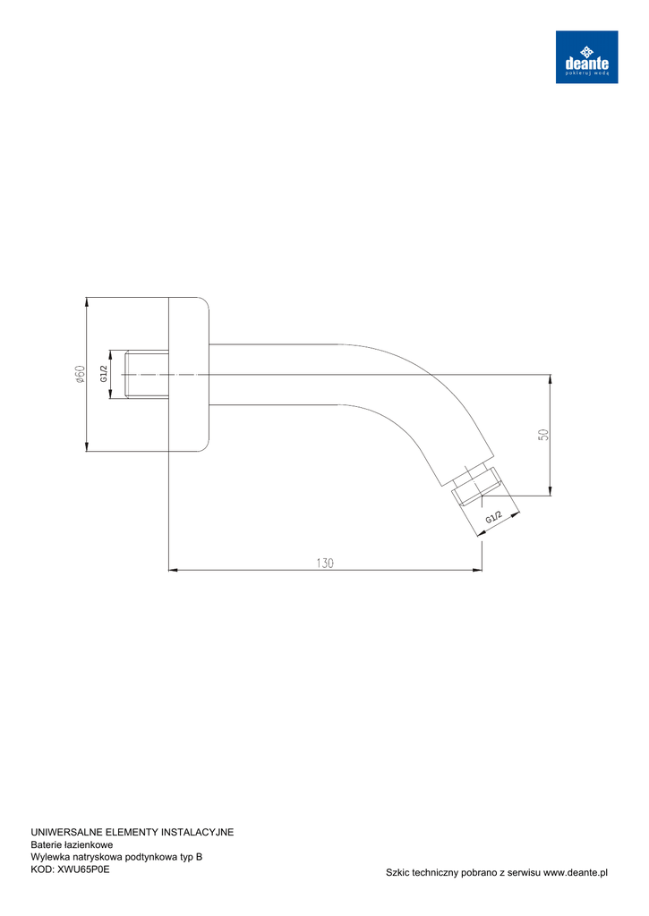 G1/2 /2 G1 UNIWERSALNE ELEMENTY INSTALACYJNE Baterie łazienkowe Wylewka natryskowa podtynkowa typ B KOD: XWU65P0E Szkic techniczny pobrano z serwisu www.deante.pl