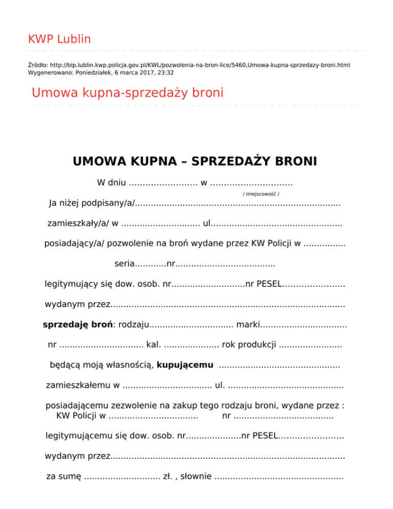 KWP Lublin Źródło: http://bip.lublin.kwp.policja.gov.pl/KWL/pozwolenia-na-bron-lice/5460,Umowa-kupna-sprzedazy-broni.html Wygenerowano: Poniedziałek, 6 marca 2017, 23:32 Umowa kupna-sprzedaży broni UMOWA KUPNA – SPRZEDAŻY BRONI W dniu ……………………. w ………………………… / miejscowość / Ja niżej podpisany/a/.............................................................................. zamieszkały/a/ w .............................. ul.................................................. posiadający/a/ pozwolenie na broń wydane przez KW Policji w ................ seria............nr...................................... legitymujący się dow. osob. nr............................nr PESEL………………….. wydanym przez......................................................................................... sprzedaję broń: rodzaju................................ marki................................. nr ................................ kal. ..................... rok produkcji ........................ będącą moją własnością, kupującemu .............................................. zamieszkałemu w .................................. ul. ............................................ posiadającemu zezwolenie na zakup tego rodzaju broni, wydane przez : KW Policji w .................................. nr ...................................... legitymującemu się dow. osob. nr.....................nr PESEL…………………… wydanym przez......................................................................................... za sumę ............................. zł. , słownie ................................................. Kupujący ponosi koszty opłaty skarbowej związanej z zakupem. Umowa jest sporządzona w dwóch jednakowych egzemplarzach. SPRZEDAJĄCY ............................................... / podpis / KUPUJĄCY ................................................ / podpis / Metryczka Data publikacji 29.10.2008 Rejestr zmian Podmiot udostępniający informację: Biuletyn Informacji Publicznej Osoba wytwarzająca/odpowiadająca za informację: mł. insp. Włodziemierz Kowalczyk - Naczelnik Wydziału Postępowań Administracyjnych KWP w Lublinie Osoba udostępniająca informację: Agnieszka Wojciechowska - Z-ca Redaktora BIP KWP w Lublinie Wydział Postępowań Administracyjnych KWP w Lublinie Osoba modyfikująca informację: