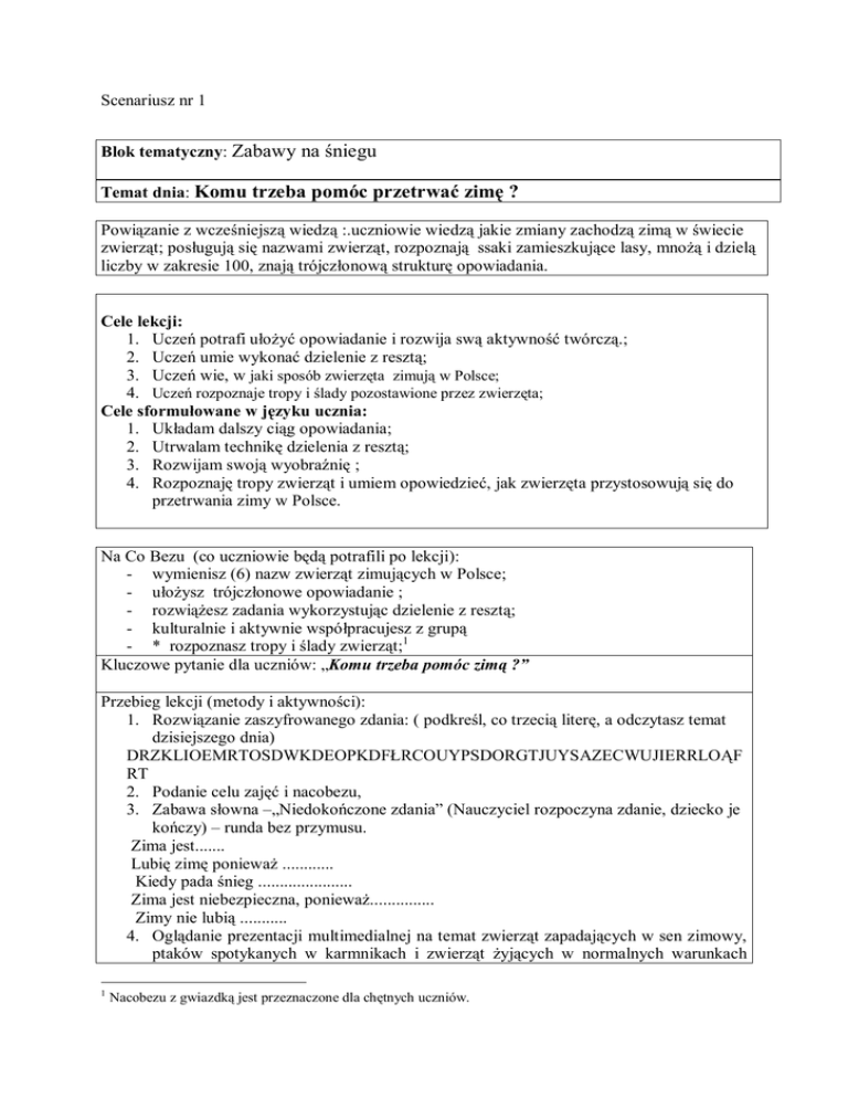 Scenariusz nr 1 Blok tematyczny: Zabawy na śniegu Temat dnia: Komu trzeba pomóc przetrwać zimę ? Powiązanie z wcześniejszą wiedzą :.uczniowie wiedzą jakie zmiany zachodzą zimą w świecie zwierząt; posługują się nazwami zwierząt, rozpoznają ssaki zamieszkujące lasy, mnożą i dzielą liczby w zakresie 100, znają trójczłonową strukturę opowiadania. Cele lekcji: 1. Uczeń potrafi ułożyć opowiadanie i rozwija swą aktywność twórczą.; 2. Uczeń umie wykonać dzielenie z resztą; 3. Uczeń wie, w jaki sposób zwierzęta zimują w Polsce; 4. Uczeń rozpoznaje tropy i ślady pozostawione przez zwierzęta; Cele sformułowane w języku ucznia: 1. Układam dalszy ciąg opowiadania; 2. Utrwalam technikę dzielenia z resztą; 3. Rozwijam swoją wyobraźnię ; 4. Rozpoznaję tropy zwierząt i umiem opowiedzieć, jak zwierzęta przystosowują się do przetrwania zimy w Polsce. Na Co Bezu (co uczniowie będą potrafili po lekcji): - wymienisz (6) nazw zwierząt zimujących w Polsce; - ułożysz trójczłonowe opowiadanie ; - rozwiążesz zadania wykorzystując dzielenie z resztą; - kulturalnie i aktywnie współpracujesz z grupą - * rozpoznasz tropy i ślady zwierząt;1 Kluczowe pytanie dla uczniów: „Komu trzeba pomóc zimą ?” Przebieg lekcji (metody i aktywności): 1. Rozwiązanie zaszyfrowanego zdania: ( podkreśl, co trzecią literę, a odczytasz temat dzisiejszego dnia) DRZKLIOEMRTOSDWKDEOPKDFŁRCOUYPSDORGTJUYSAZECWUJIERRLOĄF RT 2. Podanie celu zajęć i nacobezu, 3. Zabawa słowna –„Niedokończone zdania” (Nauczyciel rozpoczyna zdanie, dziecko je kończy) – runda bez przymusu. Zima jest....... Lubię zimę ponieważ ............ Kiedy pada śnieg ...................... Zima jest niebezpieczna, ponieważ............... Zimy nie lubią ........... 4. Oglądanie prezentacji multimedialnej na temat zwierząt zapadających w sen zimowy, ptaków spotykanych w karmnikach i zwierząt żyjących w normalnych warunkach 1 Nacobezu z gwiazdką jest przeznaczone dla chętnych uczniów. naturalnych. 5. Samodzielne uzupełnieni niedokończonych zdań. Dokonanie oceny koleżeńskiej – w parach. W długi zimowy sen zapadają:........................................ Do ciepłych krajów nie odleciały wszystkie ptaki, w Polsce pozostały:......................... Te zwierzęta prowadzą aktywny tryb życia zimą, ale niekiedy trzeb im pomagać: ................................... 6. Ustalenie i pokaz: W jaki sposób ludzie tacy jak myśliwi, leśnicy, ornitolodzy, czy badający życie zwierząt wiedzą, gdzie znaleźć zwierzęta,? Prezentacja tablic z tropami, śladami odchodów i śladami żerowania. - dzieci opisują ustnie kolejne ślady, - starają się wskazać kształty, przedmioty, do których są podobne - porównują je między sobą - nauczyciel podaje i wyjaśnia nowe terminy: trop 7. Zabawa ruchowa: nauczyciel podnosi kartonik z narysowanym tropem wybranego zwierzęcia, a dzieci samodzielnie rozpoznają, jakie zwierzę mogło pozostawić ten ślad i naśladują je ruchem. 8. Zabawa dramowa „Zgadnij kim jestem ?” – wykorzystanie wiadomości zdobytych na zajęciach. Próba odpowiedzi na pytanie kluczowe. 9. Podział uczniów na zespoły wg podziału wyrazu „opiekujemy”. Każdy zespól dostaje początek (wstęp) opowiadania ich zdaniem jest wymyślenie dalszego ciągu opowiadania, i zaprezentowanie go w formie historyjki obrazkowej lub krótkiej scenki dramowej z dialogami lub narratorem. Prezentacja prac zespołów. Informacja zwrotna nauczyciela.. „Pewnej zimowej nocy wiewiórka przebudziła się i wzięła latarkę z różową szybką. Obudziła ze snu różne zwierzęta. Mimo, że byli na nią źli wyszli ze sowich nor, gawr i schowanych w suchych liściach legowisk. Wszyscy podziwiali o północy las w zimowej szacie. Weszli na pagórek i ....”. 10. Rachunek pamięciowy „szybkie dzielenie całkowite” z jednoczesną samokontrolą 11. Rozwiązywanie grupowe zadań matematycznych utrwalających umiejętność dzielnie z resztą w zakresie 100. ( załącznik 1 – karta pracy). Dobór grup „metoda świateł”. Praca zróżnicowana. 12. Zdanie pracy domowej: wymyśl 2 zadania tekstowe dla kolegi związane z dzisiejszym tematem zajęć. 13. Podsumowanie zajęć- rudna pytań podsumowujących ( samoocena) Dziś na lekcji dowiedziałem się .............. Chciałbym zapamiętać ........................... Trudne było dla mnie............................................. Notatki i dodatkowe ćwiczenia: Praca domowa: wg pomysłu uczniów Materiały i pomoce dydaktyczne: Prezentacja multimedialna , komputer, rzutnik multimedialny, ilustracje dzieci, szary papier, karty pracy do matematyki, plansze z tropami zwierząt, śladami żerowania, rodzajami odchodów zwierząt,