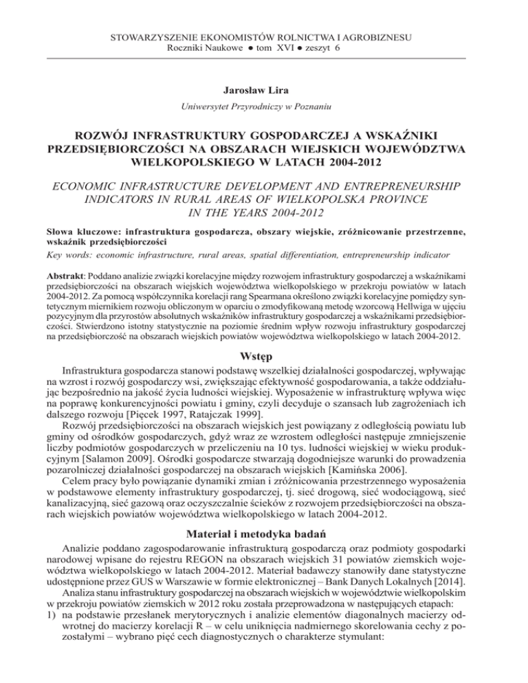 320 EKONOMISTÓW ROLNICTWA I AGROBIZNESU Jarosław STOWARZYSZENIE Lira Roczniki Naukowe ● tom XVI ● zeszyt 6 Jarosław Lira Uniwersytet Przyrodniczy w Poznaniu ROZWÓJ INFRASTRUKTURY GOSPODARCZEJ A WSKAŹNIKI PRZEDSIĘBIORCZOŚCI NA OBSZARACH WIEJSKICH WOJEWÓDZTWA WIELKOPOLSKIEGO W LATACH 2004-2012 ECONOMIC INFRASTRUCTURE DEVELOPMENT AND ENTREPRENEURSHIP INDICATORS IN RURAL AREAS OF WIELKOPOLSKA PROVINCE IN THE YEARS 2004-2012 Słowa kluczowe: infrastruktura gospodarcza, obszary wiejskie, zróżnicowanie przestrzenne, wskaźnik przedsiębiorczości Key words: economic infrastructure, rural areas, spatial differentiation, entrepreneurship indicator Abstrakt: Poddano analizie związki korelacyjne między rozwojem infrastruktury gospodarczej a wskaźnikami przedsiębiorczości na obszarach wiejskich województwa wielkopolskiego w przekroju powiatów w latach 2004-2012. Za pomocą współczynnika korelacji rang Spearmana określono związki korelacyjne pomiędzy syntetycznym miernikiem rozwoju obliczonym w oparciu o zmodyfikowaną metodę wzorcową Hellwiga w ujęciu pozycyjnym dla przyrostów absolutnych wskaźników infrastruktury gospodarczej a wskaźnikami przedsiębiorczości. Stwierdzono istotny statystycznie na poziomie średnim wpływ rozwoju infrastruktury gospodarczej na przedsiębiorczość na obszarach wiejskich powiatów województwa wielkopolskiego w latach 2004-2012. Wstęp Infrastruktura gospodarcza stanowi podstawę wszelkiej działalności gospodarczej, wpływając na wzrost i rozwój gospodarczy wsi, zwiększając efektywność gospodarowania, a także oddziałując bezpośrednio na jakość życia ludności wiejskiej. Wyposażenie w infrastrukturę wpływa więc na poprawę konkurencyjności powiatu i gminy, czyli decyduje o szansach lub zagrożeniach ich dalszego rozwoju [Pięcek 1997, Ratajczak 1999]. Rozwój przedsiębiorczości na obszarach wiejskich jest powiązany z odległością powiatu lub gminy od ośrodków gospodarczych, gdyż wraz ze wzrostem odległości następuje zmniejszenie liczby podmiotów gospodarczych w przeliczeniu na 10 tys. ludności wiejskiej w wieku produkcyjnym [Salamon 2009]. Ośrodki gospodarcze stwarzają dogodniejsze warunki do prowadzenia pozarolniczej działalności gospodarczej na obszarach wiejskich [Kamińska 2006]. Celem pracy było powiązanie dynamiki zmian i zróżnicowania przestrzennego wyposażenia w podstawowe elementy infrastruktury gospodarczej, tj. sieć drogową, sieć wodociągową, sieć kanalizacyjną, sieć gazową oraz oczyszczalnie ścieków z rozwojem przedsiębiorczości na obszarach wiejskich powiatów województwa wielkopolskiego w latach 2004-2012. Materiał i metodyka badań Analizie poddano zagospodarowanie infrastrukturą gospodarczą oraz podmioty gospodarki narodowej wpisane do rejestru REGON na obszarach wiejskich 31 powiatów ziemskich województwa wielkopolskiego w latach 2004-2012. Materiał badawczy stanowiły dane statystyczne udostępnione przez GUS w Warszawie w formie elektronicznej – Bank Danych Lokalnych [2014]. Analiza stanu infrastruktury gospodarczej na obszarach wiejskich w województwie wielkopolskim w przekroju powiatów ziemskich w 2012 roku została przeprowadzona w następujących etapach: 1) na podstawie przesłanek merytorycznych i analizie elementów diagonalnych macierzy odwrotnej do macierzy korelacji R – w celu uniknięcia nadmiernego skorelowania cechy z pozostałymi – wybrano pięć cech diagnostycznych o charakterze stymulant: Rozwój infrastruktury gospodarczej a wskaźniki przedsiębiorczości na obszarach wiejskich... 321 –– długość publicznych dróg gminnych o twardej nawierzchni w km na 100 km2 powierzchni obszarów wiejskich województwa (gęstość sieci drogowej), –– liczbę ludności korzystającej z sieci wodociągowej w % ogółu ludności wiejskiej1, –– liczbę ludności korzystającej z sieci kanalizacyjnej w % ogółu ludności wiejskiej, –– liczbę ludności korzystającej z sieci gazowej w % ogółu ludności wiejskiej, –– liczbę ludności obsługiwanej przez oczyszczalnie ścieków w % ogółu ludności wiejskiej, 2) cechy diagnostyczne poddano normalizacji z wykorzystaniem standaryzacji medianowej, 3) skonstruowano syntetyczny miernik rozwoju w oparciu o zmodyfikowaną metodę wzorcową Hellwiga w ujęciu pozycyjnym [Lira i in. 2002], 4) liniowo uporządkowano powiaty według wartości syntetycznego miernika, 5) wyodrębniono klasy typologiczne powiatów opierając się na analizie różnic w poziomie wartości miernika uporządkowanego malejąco, obliczonych dla sąsiadujących ze sobą powiatów [Lira, Wysocki 2004], 6) dla każdej klasy typologicznej wyznaczono przeciętne wartości za pomocą średniej harmonicznej, a w przypadku syntetycznego miernika – za pomocą średniej ważonej, przyjmując jako wagi liczbę ludności wiejskiej faktycznie zamieszkałej. Rozwój infrastruktury gospodarczej w latach 2004-2012 określono na podstawie przyrostów absolutnych poszczególnych cech diagnostycznych dla obszarów wiejskich powiatów wojewodztwa wielkopolskiego w 2012 roku w stosunku do 2004 roku, następnie przeprowadzono standaryzację medianową cech o wartościach wyrażonych w postaci przyrostów absolutnych i skonstruowano syntetyczny miernik rozwoju w ujęciu pozycyjnym. Badanie wpływu dynamiki zmian w zakresie rozwoju infrastruktury obszarów wiejskich powiatów województwa wielkopolskiego w latach 2004-2012 na rozwój przedsiębiorczości na tych obszarach przeprowadzono w kolejnych krokach: 1) wybrano cztery wskaźniki określające przedsiębiorczość: –– nowo zarejestrowane w rejestrze REGON podmioty gospodarki narodowej ogółem na 10 tys. ludności w wieku produkcyjnym, –– nowo zarejestrowane w rejestrze REGON podmioty gospodarki narodowej w sektorze prywatnym na 10 tys. ludności w wieku produkcyjnym, –– podmioty gospodarki narodowej wpisane do rejestru REGON ogółem na 10 tys. ludności w wieku