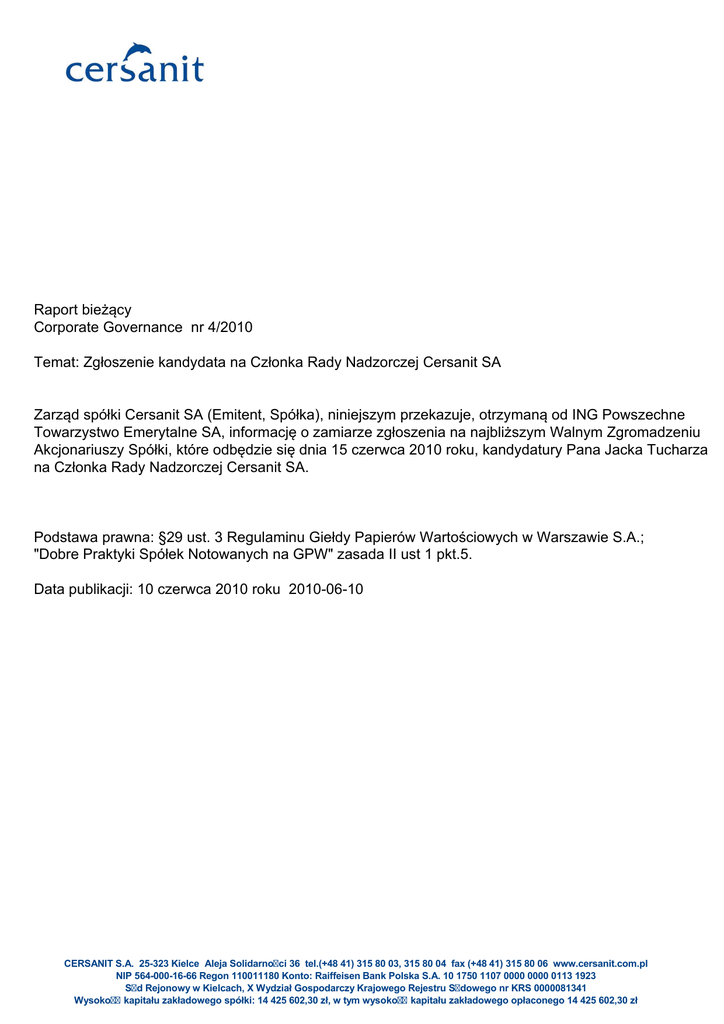 Raport bieżący Corporate Governance nr 4/2010 Temat: Zgłoszenie kandydata na Członka Rady Nadzorczej Cersanit SA Zarząd spółki Cersanit SA (Emitent, Spółka), niniejszym przekazuje, otrzymaną od ING Powszechne Towarzystwo Emerytalne SA, informację o zamiarze zgłoszenia na najbliższym Walnym Zgromadzeniu Akcjonariuszy Spółki, które odbędzie się dnia 15 czerwca 2010 roku, kandydatury Pana Jacka Tucharza na Członka Rady Nadzorczej Cersanit SA. Podstawa prawna: §29 ust. 3 Regulaminu Giełdy Papierów Wartościowych w Warszawie S.A.; "Dobre Praktyki Spółek Notowanych na GPW" zasada II ust 1 pkt.5. Data publikacji: 10 czerwca 2010 roku 2010-06-10 CERSANIT S.A. 25-323 Kielce Aleja Solidarno ci 36 tel.(+48 41) 315 80 03, 315 80 04 fax (+48 41) 315 80 06 www.cersanit.com.pl NIP 564-000-16-66 Regon 110011180 Konto: Raiffeisen Bank Polska S.A. 10 1750 1107 0000 0000 0113 1923 S d Rejonowy w Kielcach, X Wydział Gospodarczy Krajowego Rejestru S dowego nr KRS 0000081341 Wysoko kapitału zakładowego spółki: 14 425 602,30 zł, w tym wysoko kapitału zakładowego opłaconego 14 425 602,30 zł