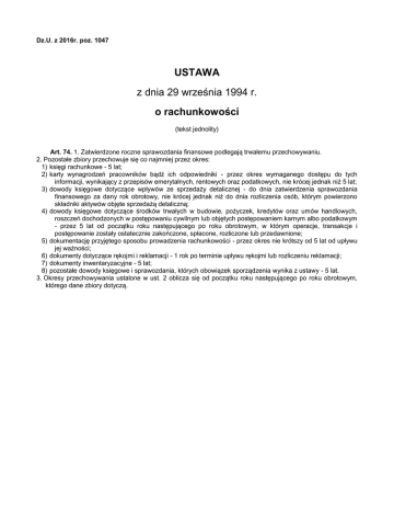 Dz.U. z 2016r. poz. 1047 USTAWA z dnia 29 września 1994 r. o rachunkowości (tekst jednolity) Art. 74. 1. Zatwierdzone roczne sprawozdania finansowe podlegają trwałemu przechowywaniu. 2. Pozostałe zbiory przechowuje się co najmniej przez okres: 1) księgi rachunkowe - 5 lat; 2) karty wynagrodzeń pracowników bądź ich odpowiedniki - przez okres wymaganego dostępu do tych informacji, wynikający z przepisów emerytalnych, rentowych oraz podatkowych, nie krócej jednak niż 5 lat; 3) dowody księgowe dotyczące wpływów ze sprzedaży detalicznej - do dnia zatwierdzenia sprawozdania finansowego za dany rok obrotowy, nie krócej jednak niż do dnia rozliczenia osób, którym powierzono składniki aktywów objęte sprzedażą detaliczną; 4) dowody księgowe dotyczące środków trwałych w budowie, pożyczek, kredytów oraz umów handlowych, roszczeń dochodzonych w postępowaniu cywilnym lub objętych postępowaniem karnym albo podatkowym - przez 5 lat od początku roku następującego po roku obrotowym, w którym operacje, transakcje i postępowanie zostały ostatecznie zakończone, spłacone, rozliczone lub przedawnione; 5) dokumentację przyjętego sposobu prowadzenia rachunkowości - przez okres nie krótszy od 5 lat od upływu jej ważności; 6) dokumenty dotyczące rękojmi i reklamacji - 1 rok po terminie upływu rękojmi lub rozliczeniu reklamacji; 7) dokumenty inwentaryzacyjne - 5 lat; 8) pozostałe dowody księgowe i sprawozdania, których obowiązek sporządzenia wynika z ustawy - 5 lat. 3. Okresy przechowywania ustalone w ust. 2 oblicza się od początku roku następującego po roku obrotowym, którego dane zbiory dotyczą.