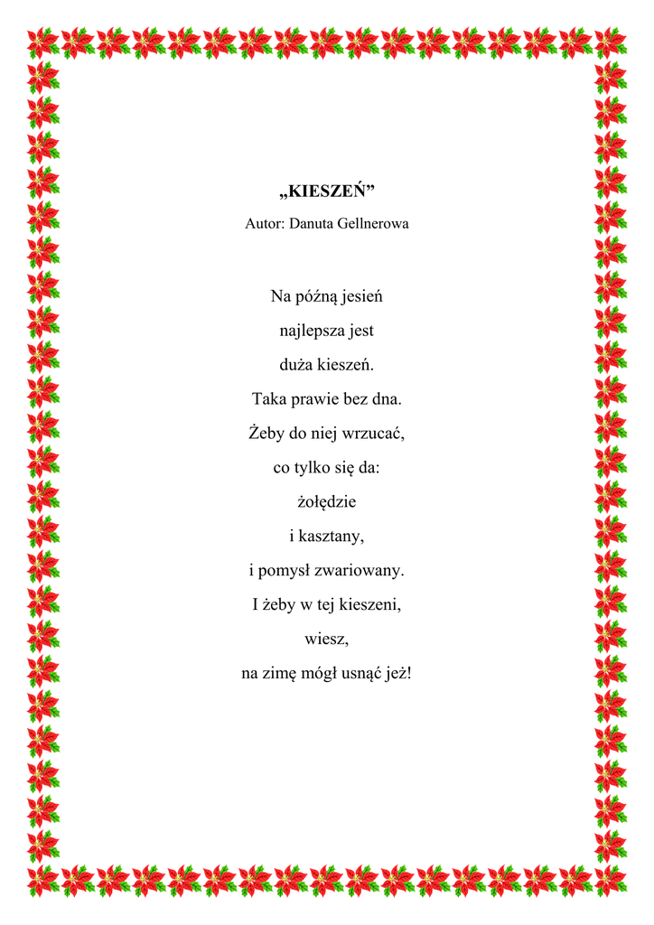 „KIESZEŃ” Autor: Danuta Gellnerowa Na późną jesień najlepsza jest duża kieszeń. Taka prawie bez dna. Żeby do niej wrzucać, co tylko się da: żołędzie i kasztany, i pomysł zwariowany. I żeby w tej kieszeni, wiesz, na zimę mógł usnąć jeż!