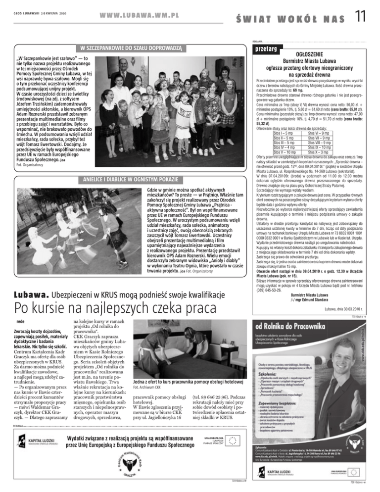 W W W. L U B A W A . W M . P L G Ł O S L U B A W S K I 2-8 KWIENIA 2010 11 ŚWIAT WOKÓŁ NAS REKLAMA przetarg W SZCZEPANKOWIE DO SZAŁU DOPROWADZĄ OGŁOSZENIE Burmistrz Miasta Lubawa ogłasza przetarg ofertowy nieograniczony na sprzedaż drewna „W Szczepankowie jest szałowo” — to nie tylko nazwa projektu realizowanego w tej miejscowości przez Ośrodek Pomocy Społecznej Gminy Lubawa, w tej wsi naprawdę bywa szałowo. Mogli się o tym przekonać uczestnicy konferencji podsumowującej unijny projekt. W czasie uroczystości dzieci ze świetlicy środowiskowej (na zdj. z sołtysem Józefem Trzcińskim) zademonstrowały umiejętności aktorskie, a kierownik OPS Adam Roznerski przedstawił zebranym prezentacje multimedialne oraz filmy z przebiegu zajęć i warsztatów. Było co wspominać, nie brakowało powodów do śmiechu. W podsumowaniu wzięli udział mieszkańcy, rada sołecka, przybył też wójt Tomasz Ewertowski. Dodajmy, że przedsięwzięcie były współfinansowane przez UE w ramach Europejskiego Funduszu Społecznego. joa Fot. Organizatorzy ANIELICE I DIABLICE W OGNISTYM POKAZIE Gdzie w gminie można spotkać aktywnych mieszkańców? To proste — w Prątnicy. Właśnie tam zakończył się projekt realizowany przez Ośrodek Pomocy Społecznej Gminy Lubawa „Prątnica aktywna społeczność”. Był on współfinansowane przez UE w ramach Europejskiego Funduszu Społecznego. W uroczystym podsumowaniu wzięli udział mieszkańcy, rada sołecka, animatorzy i uczestnicy zajęć, swoją obecnością zebranych zaszczycił wójt Tomasz Ewertowski. Uczestnicy obejrzeli prezentację multimedialną i film upamiętniający najważniejsze wydarzenia z realizowanego projektu. Prezentację przedstawił kierownik OPS Adam Roznerski. Wielu emocji dostarczyło zebranym widowisko „Anioły i diabły” w wykonaniu Teatru Ognia, które powstało w czasie trwania projektu. joa Fot. Organizatorzy Lubawa. Ubezpieczeni w KRUS mogą podnieść swoje kwalifikacje Po kursie na najlepszych czeka praca rede Zwracają koszty dojazdów, zapewniają posiłek, materiały dydaktyczne i badania lekarskie. Nic tylko się szkolić. Centrum Kształcenia Kadr Graczyk ma ofertę dla osób ubezpieczonych w KRUS. Za darmo można podnieść kwalifikacje zawodowe, a najlepsi mogą zdobyć zatrudnienie. — Po organizowanym przez nas kursie w Iławie czterdzieści procent kursantów otrzymało propozycje pracy — mówi Waldemar Graczyk, dyrektor CKK Graczyk. — Dlatego zapraszamy na kolejne kursy w ramach projektu „Od rolnika do pracownika“. CKK Graczyk zaprasza mieszkańców gminy Lubawa objętych ubezpieczeniem w Kasie Rolniczego Ubezpieczenia Społecznego. Seria szkoleń objętych projektem „Od rolnika do pracownika“ realizowana jest m.in. na terenie powiatu iławskiego. Trwa właśnie rekrutacja na kolejne kursy na kierunkach: pracownik przetwórstwa mięsnego, opiekunka osób starszych i niepełnosprawnych, operator maszyn drogowych, sprzedawca, Przedmiotem przetargu jest sprzedaż drewna pozyskanego w wyniku wycinki drzew z terenów należących do Gminy Miejskiej Lubawa. Ilość drewna przeznaczona do sprzedaży to: 69 mp. Przedmiotowe drewno stanowi drewno różnego gatunku i nie jest posegregowane wg gatunku drzew. Cena minimalna za 1mp (stosy V, VI) drewna wynosi: cena netto: 56,00 zł. + minimalne postąpienie 10%, tj. 5,60 zł = 61,60 zł netto (cena brutto: 65,91 zł). Cena minimalna (pozostałe stosy) za 1mp drewna wynosi: cena netto: 47,00 zł + minimalne postąpienie 10%, tj. 4,70 zł = 51,70 zł netto (cena brutto: 55,32 zł). Oferowane stosy oraz ilości drewna do sprzedaży: Stos I – 5 mp Stos VI – 9 mp Stos II – 5 mp Stos VII – 9 mp Stos III – 5 mp Stos VIII – 9 mp Stos IV – 4 mp Stos IX – 10 mp Stos V – 10 mp Stos X – 3 mp Oferty pisemne uwzględniające nr stosu drewna do zakupu oraz cenę za 1mp należy składać w zamkniętych kopertach oznaczonych: „Sprzedaż drewna – nie otwierać przed godz. 1200, dnia 09.04.2010r.” (piątek) w siedzibie Urzędu Miasta Lubawa, ul. Rzepnikowskiego 9a, 14-260 Lubawa (sekretariat). W dniu 07.04.20109r. (środa) w godzinach od 11.00 do 12.00 można dokonać oględzin oferowanego drewna przeznaczonego do sprzedaży. Drewno znajduje się na placu przy Ochotniczej Straży Pożarnej. Sprzedający nie wymaga wpłaty wadium. Kryterium rozstrzygającym o zakupie drewna jest cena. W przypadku równych ofert cenowych na poszczególne stosy decydującym kryterium wyboru oferty będzie data i godzina wpływu oferty. Niezwłocznie po wyborze najkorzystniejszej oferty sprzedający zawiadamia pisemnie kupującego o terminie i miejscu podpisania umowy o zakupie drewna. Ustalony w drodze przetargu kandydat na nabywcę jest zobowiązany do uiszczenia ustalonej kwoty w terminie do 7 dni, licząc od daty podpisania umowy na rachunek bankowy Urzędu Miasta Lubawa nr 73 8832 0001 1001 0000 0332 0001 w Banku Spółdzielczym w Lubawie lub w Kasie tut. Urzędu. Wydanie przedmiotowego drewna nastąpi po uregulowaniu należności. Kupujący na własny koszt dokona załadunku i transportu zakupionego drewna z miejsca jego składowania w terminie 7 dni od dnia dokonania wpłaty. Zastrzega się prawo do odwołania przetargu. Zastrzega się, iż jedna osoba zainteresowana kupnem drewna może dokonać zakupu maksymalnie 15 mp. Otwarcie ofert nastąpi w dniu 09.04.2010 r. o godz. 12.30 w Urzędzie Miasta Lubawa (pok. nr 15). Bliższe informacje w sprawie sprzedaży oferowanego drewna zainteresowani mogą uzyskać w pokoju nr 4 Urzędu Miasta Lubawa bądź pod nr. telefonu (089) 645-53-26. Burmistrz Miasta Lubawa /-/ mgr Edmund Standara Lubawa, dnia 30.03.2010 r. 77510luzl-a -w Jedna z ofert to kurs pracownika pomocy obsługi hotelowej Fot. Archiwum CKK pracownik pomocy obsługi hotelowej. W Iławie zgłoszenia przyjmowane są w biurze CKK przy ul. Jagiellończyka 16 (tel. 89 646 23 96). Podczas rekrutacji należy mieć przy sobie dowód osobisty i p