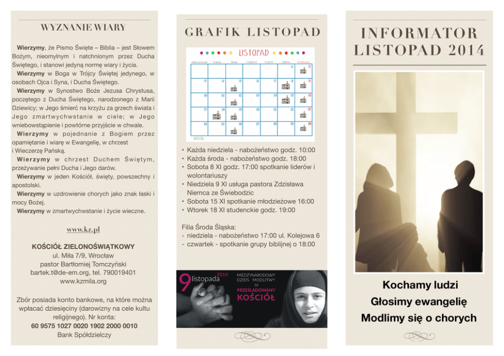 WYZNANIE WIARY Wierzymy, że Pismo Święte – Biblia – jest Słowem Bożym, nieomylnym i natchnionym przez Ducha Świętego, i stanowi jedyną normę wiary i życia. Wierzymy w Boga w Trójcy Świętej jedynego, w osobach Ojca i Syna, i Ducha Świętego. Wierzymy w Synostwo Boże Jezusa Chrystusa, poczętego z Ducha Świętego, narodzonego z Marii Dziewicy; w Jego śmierć na krzyżu za grzech świata i Jego zmartwychwstanie w ciele; w Jego wniebowstąpienie i powtórne przyjście w chwale. Wierzymy w pojednanie z Bogiem przez opamiętanie i wiarę w Ewangelię, w chrzest i Wieczerzę Pańską. Wierzymy w chrzest Duchem Świętym, przeżywanie pełni Ducha i Jego darów. Wierzymy w jeden Kościół, święty, powszechny i apostolski. Wierzymy w uzdrowienie chorych jako znak łaski i mocy Bożej. Wierzymy w zmartwychwstanie i życie wieczne. www.kz.pl KOŚCIÓŁ ZIELONOŚWIĄTKOWY ul. Miła 7/9, Wrocław pastor Bartłomiej Tomczyński [email protected], tel. 790019401 www.kzmila.org Zbór posiada konto bankowe, na które można wpłacać dziesięciny (darowizny na cele kultu religijnego). Nr konta: 60 9575 1027 0020 1902 2000 0010 Bank Spółdzielczy G R A F I K L I S T O PA D INFOR MATOR LISTO PAD 2014 ⛪️ ⛪️ ⛪️ ⛪️ ⛪️ ⛪️ ⛪️ ⛪️ ⛪️ ⛪️ ⛪️ ⛪️ • Każda niedziela - nabożeństwo godz. 10:00 • Każda środa - nabożeństwo godz. 18:00 • Sobota 8 XI godz. 17:00 spotkanie liderów i wolontariuszy • Niedziela 9 XI usługa pastora Zdzisława Niemca ze Świebodzic • Sobota 15 XI spotkanie młodzieżowe 16:00 • Wtorek 18 XI studenckie godz. 19:00 Filia Środa Śląska: - niedziela - nabożeństwo 17:00 ul. Kolejowa 6 - czwartek - spotkanie grupy biblijnej o 18:00 Kochamy ludzi Głosimy ewangelię Modlimy się o chorych SERCE W PACZCE W nowym roku chcemy jako zbór obdarować najbardziej potrzebujące i pokrzywdzone rodziny sercem i miłością wyrażoną w drobnych upominkach. W związku z tym chcielibyśmy prosić rodziny naszego kościoła o przygotowanie paczek wielkości pudełka po butach (kozakach), które będą wyrazem naszej hojności. Rodziny przygotują upominki, szkółka akcesoria prezentowe, młodzież zapakuje prezenty, służba dla kobiet przygotuje wieczór wręczania upominków. Efektem pracy całego zboru, każdej ze służb kościelnych i każdego z nas z osobna będzie akcja „SERCE W PACZCE”. Osobą koordynującą przedsięwzięcie jest Ewa Głogowska. „Błogosławiony jest człowiek życzliwy, gdyż udziela ze swojego chleba ubogiemu" KOSZT PACZKI TO OKOŁO 50 zł, PONIŻEJ ZNAJDUJE SIĘ LISTA RZECZY NIEZBĘDNYCH, ALE ZAPRASZAMY RÓWNIEŻ DO INWENCJI TWÓRCZEJ I DODANIA CZEGOŚ OD SIEBIE: • KAWA (dobrej jakości) • CZEKOLADA (jak wyżej) • ŻEL POD PRYSZNIC (jak wyżej) • PENDRIVE • RĘKAWICZKI (uniwersalne) WA Ż N E W Y DA R Z E N I A PODZIĘKOWANIA 19 października na rzecz prześladowanych chrześcijan zebraliśmy niemal 2000 złotych. Cała suma została wysłana do organizacji OPEN DOORS, która przekaże je najbardziej potrzebującym kościołom w Iraku i Koreii. Wszystkim ofiarodawcom bardzo dziękujemy za wsparcie prześladowanego kościoła. 2 List do Koryntian 9:7 Każdy, tak jak sobie postanowił w sercu, nie z żalem albo z przymusu; gdyż ochotnego dawcę Bóg miłuje. SEMINARIUM DLA OSÓB ZAANGAŻOWANYCH W SŁUŻBĘ W sobotę 8 listopada o godzinie 17:00 odbędzie się spotkanie z pastorstwem Zdzisławem i Lucyną Niemiec ze Świebodzic. Na spotkanie zapraszamy liderów i wolontariuszy, ludzi zaangażowanych w jakąkolwiek służbę kościoła. RAZEM MOŻEMY WIĘCEJ - to hasło przewodnie naszego seminarium. Pragniemy rozwijać się w służbie i w ten sposób podnosić jakość pracy całego kościoła. POPOŁUDNIE MŁODZIEŻOWE W sobotę 15 listopada o godzinie 16:00 zapraszamy młodzież do mieszkania pastora (ul. Stopnicka 18/8) na wspólne spędzenie popołudnia. Planujemy oglądanie ciekawego chrześcijańskiego filmu przy popcornie i coli. Szczególnie zapraszamy gimnazjalistów i licealistów. Będziemy budować relacje i spędzać miło czas! Więcej informacji u pastorowej Danusi Tomczyńskiej, tel. 792977251 STUDENCKIE EXTRA We wtorek 18 listopada o 19:00 odbędzie się specjalne spotkanie studenckie. Zaproś znajomych na ten wyjątkowy wieczór. Mamy dla was niespodziankę! Nasze spotkania mają otwarty charakter. Każdy może na nie przyjść bez względu na światopogląd, wyznanie czy narodowość. ZAPRASZAMY 😀