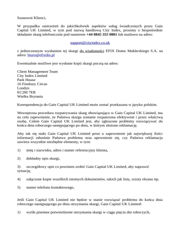 Szanowni Klienci, W przypadku zastrzeżeń do jakichkolwiek aspektów usług świadczonych przez Gain Capital UK Limited, w tym pod nazwą handlową City Index, prosimy o bezpośrednie składanie skarg telefonicznie pod numerem +44 0845 355 0801 lub mailowo na adres: [email protected] z jednoczesnym wysłaniem tej skargi do wiadomości EFIX Domu Maklerskiego S.A. na adres: [email protected] Ewentualnie możliwe jest wysłanie kopii skargi pocztą na adres: Client Management Team City Index Limited Park House 16 Finsbury Circus Londyn EC2M 7EB Wielka Brytania Korespondencja do Gain Capital UK Limited może zostać przekazana w języku polskim. Wewnętrzna procedura rozpatrywania skarg obowiązująca w Gain Capital UK Limited, ma na celu zapewnienie, że Państwa skarga zostanie rozpatrzona efektywnie i przez właściwą osobę. Celem Gain Capital UK Limited jest, aby zgłoszone problemy rozwiązywać do końca dnia roboczego następującego po dniu, w którym złożono reklamację. Aby tak się stało Gain Capital UK Limited prosi o zapewnienie jak największej ilości informacji odnośnie Państwa problemu oraz upewnienie się, czy Państwa reklamacja zawiera wszystkie niezbędne elementy, w tym: 1) imię i nazwisko, adres i numer referencyjny klienta, 2) dokładny opis skargi, 3) szczegółowy opis co powinien zrobić Gain Capital UK Limited, aby naprawić sytuację, 4) załączone kopie wszelkich istotnych dokumentów, takich jak listy, zrzuty ekranu itp. 5) numer telefonu kontaktowego, Jeśli Gain Capital UK Limited nie będzie w stanie rozwiązać problemu do końca dnia roboczego następującego po dniu otrzymania skargi, Gain Capital UK Limited: 1) wyśle pisemne potwierdzenie otrzymania skargi w ciągu pięciu dni roboczych, 2) potwierdzi, kto będzie zajmował się skargą, i jak można się z tą osobą skontaktować. Kolejnym krokiem będzie udzielenie przez Gain Capital UK Limited ostatecznej, pisemnej odpowiedzi na reklamację, w ciągu ośmiu tygodni od jej otrzymania, zawierającej stanowisko Gain Capital UK Limited. Jeśli klient nie będzie zadowolony ze sposobu rozpatrzenia reklamacji, może domagać się jego weryfikacji przez Financial Ombudsman Service. W ostatecznej odpowiedzi Gain Capital UK Limited potwierdzi uprawnienie do skierowania skargi do Financial Ombudsman Service, co musi nastąpić w ciągu sześciu miesięcy od reklamacji. Dane kontaktowe do Financial Ombudsman Service: Financial Ombudsman Service Exchange Tower Londyn E14 9SR Wielka Brytania Telefon: +44 0300 123 9 123 lub +44 0800 023 4567 E-mail: [email protected] www.financial-ombudsman.org.uk Powyższa informacja dotyczy tylko i wyłącznie procedury reklamacyjnej obowiązującej w Gain Capital UK Limited (nazwa handlowa City Index). Oryginalna informacja w języku angielskim dostępna jest pod adresem http://www.cityindex.co.uk/support/complaints.aspx. EFIX Dom Maklerski S.A. nie bierze żadnej odpowiedzialności za poprawność i aktualność powyższych danych. Osoby korzystające z tych informacji czynią to na własne ryzyko. EFIX Dom Maklerski S.A. zwraca uwagę, iż jedynym wiarygodnym źródłem informacji o składaniu reklamacji na usługi świadczone przez Gain Capital UK Limited, jest tylko ten podmiot i udostępniane bezpośrednio przez niego dokumenty i informacje.