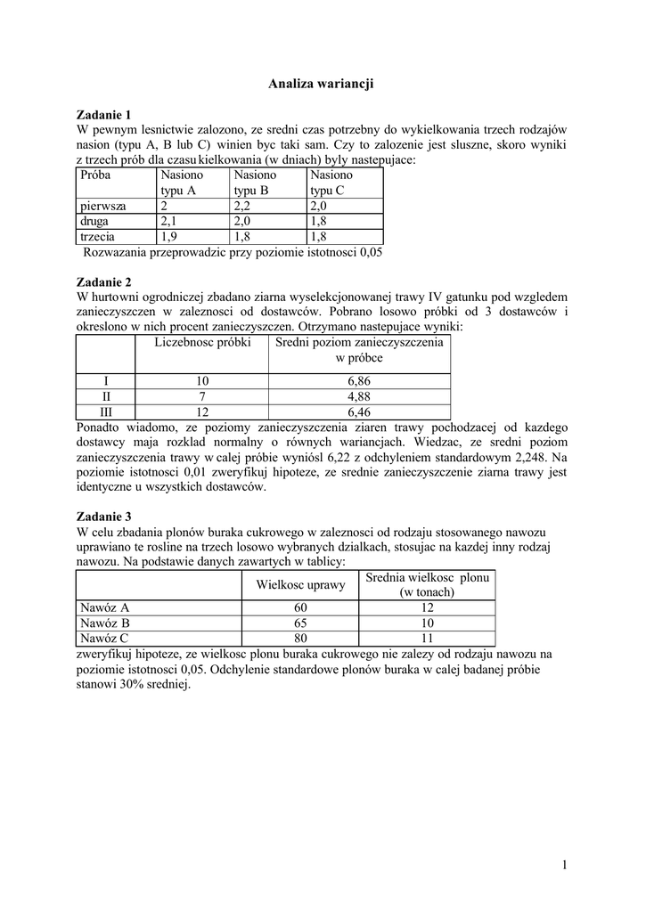 Analiza wariancji Zadanie 1 W pewnym lesnictwie zalozono, ze sredni czas potrzebny do wykielkowania trzech rodzajów nasion (typu A, B lub C) winien byc taki sam. Czy to zalozenie jest sluszne, skoro wyniki z trzech prób dla czasu kielkowania (w dniach) byly nastepujace: Próba Nasiono Nasiono Nasiono typu A typu B typu C pierwsza 2 2,2 2,0 druga 2,1 2,0 1,8 trzecia 1,9 1,8 1,8 Rozwazania przeprowadzic przy poziomie istotnosci 0,05 Zadanie 2 W hurtowni ogrodniczej zbadano ziarna wyselekcjonowanej trawy IV gatunku pod wzgledem zanieczyszczen w zaleznosci od dostawców. Pobrano losowo próbki od 3 dostawców i okreslono w nich procent zanieczyszczen. Otrzymano nastepujace wyniki: Liczebnosc próbki Sredni poziom zanieczyszczenia w próbce I 10 6,86 II 7 4,88 III 12 6,46 Ponadto wiadomo, ze poziomy zanieczyszczenia ziaren trawy pochodzacej od kazdego dostawcy maja rozklad normalny o równych wariancjach. Wiedzac, ze sredni poziom zanieczyszczenia trawy w calej próbie wyniósl 6,22 z odchyleniem standardowym 2,248. Na poziomie istotnosci 0,01 zweryfikuj hipoteze, ze srednie zanieczyszczenie ziarna trawy jest identyczne u wszystkich dostawców. Zadanie 3 W celu zbadania plonów buraka cukrowego w zaleznosci od rodzaju stosowanego nawozu uprawiano te rosline na trzech losowo wybranych dzialkach, stosujac na kazdej inny rodzaj nawozu. Na podstawie danych zawartych w tablicy: Srednia wielkosc plonu Wielkosc uprawy (w tonach) Nawóz A 60 12 Nawóz B 65 10 Nawóz C 80 11 zweryfikuj hipoteze, ze wielkosc plonu buraka cukrowego nie zalezy od rodzaju nawozu na poziomie istotnosci 0,05. Odchylenie standardowe plonów buraka w calej badanej próbie stanowi 30% sredniej. 1 Zadanie 4 Zbadano czas otwierania rachunku inwestycyjnego 35 losowo wybranych osób w 3 biurach maklerskich. Przecietny czas otwierania rachunku wsród wszystkich zbadanych osób wyniósl 10,4 min. Na podstawie wyników badania przedstawionych w tabeli zweryfikuj przy poziomie istotnosci 0,01 hipoteze, ze sredni czas na otwierania rachunku jest taki sam w kazdym z biur. Nr biura Liczba Przecietny czas Nieobciazona wariancja maklerskiego zbadanych otwierania rachunku czasu otwierania osób (w min) rachunku 1 12 9 4,2 2 10 10 3,6 3 13 12 3,8 Zadanie 5 Pewna firma farmaceutyczna testuje czas dzialania trzech, o podobnym przeznaczeniu, nowych leków przeciwbólowych (A,B,C). Czasy dzialania tych leków, zaobserwowane w losowo wybranych próbach pacjentów, byly nastepujace (w godz.): Lek A: 8,11,12, 9; Lek B: 8, 6, 4, 7, 5; Lek C: 3, 3, 2, Wiedzac, ze suma kwadratów odchylen wartosci cechy od sredniej grupowej wyniosla 22 (godz.)2 , zas suma kwadratów odchylen srednich grupowych od sredniej ogólnej wyniosla 38,92 (godz.)2 nalezy podajac konieczne zalozenia sprawdzic, czy rodzaj leku jest czynnikiem róznicujacym sredni czas dzialania (przyjac poziom istotnosci 0,05)? Zadanie 6 W celu ustalenia czy marka samochodu istotnie róznicuje srednia miesieczna liczbe sprzedawanych samochodów zebrano informacje od 23 losowo wybranych salonów sprzedazy. Uzyskano nastepujace informacje dotyc zace liczby sprzedanych samochodów 3 marek: suma kwadratów róznic miedzy srednimi liczbami sprzedawanych samochodów róznych marek a ogólna srednia liczba sprzedanych samochodów wyniosla 46 a suma kwadratów róznic pomiedzy liczbami sprzedanych samochodów a srednia ogólna wyniosla 66. Zweryfikuj odpowiednia hipoteze na poziomie istotnosci 0,05. Zadanie 7 Zbadano wydatki na zywnosc dwuosobowych gospodarstw domowych ze wzgledu na miejsce zamieszkania (wies, miasto ponizej 500 tys. mieszkanców, miasto powyzej 500 tys. mieszkanców). Korzystajac z ponizszego wydruku, prosze ocenic, czy wielkosc miejsca zamieszkania róznicuje istotnie wysokosc wydatków na zywnosc. Wydruk nalezy takze uzupelnic o brakujace dane. Analysis of variance --------------------------------------------------------------------------------------------------------Source of variation Sum of Squares d.f. Mean square F-ratio Sig. leve l --------------------------------------------------------------------------------------------------------Between groups ………… … 52288.889 ……… .0000 Within groups 27533.33 … ……… --------------------------------------------------------------------------------------------------------Total (corrected) 132111.11 17 Dodatkowe zadania do rozwiazania w domu: Zbiór zadan: 9.2.6 pkt 1.2.; 9.2.8 pkt 1.2. Zestaw dr Wieczorek: 1-8. 2 Analiza wariancji - odpowiedzi Zadanie 1: F=0,803 ∉ <5,14; 8 ) – brak podstaw do odrzucenia hipotezy zerowej. Zadanie 2: F=0,839 ∉ <5,53; 8 ) – brak podstaw do odrzucenia hipotezy zerowej. Zadanie 3: F=6,02 ∈ <3; 8 ). Zadanie 4: F=7,53 ∈ <5,39; 8 ). Zadanie 5: F=7,96 ∈ <4,26; 8 ). Zadanie 6: F=23 ∈ <3,49; 8 ). Zadanie 7: SSB=104577,78; MSE=1835,56; F=28,45. 3