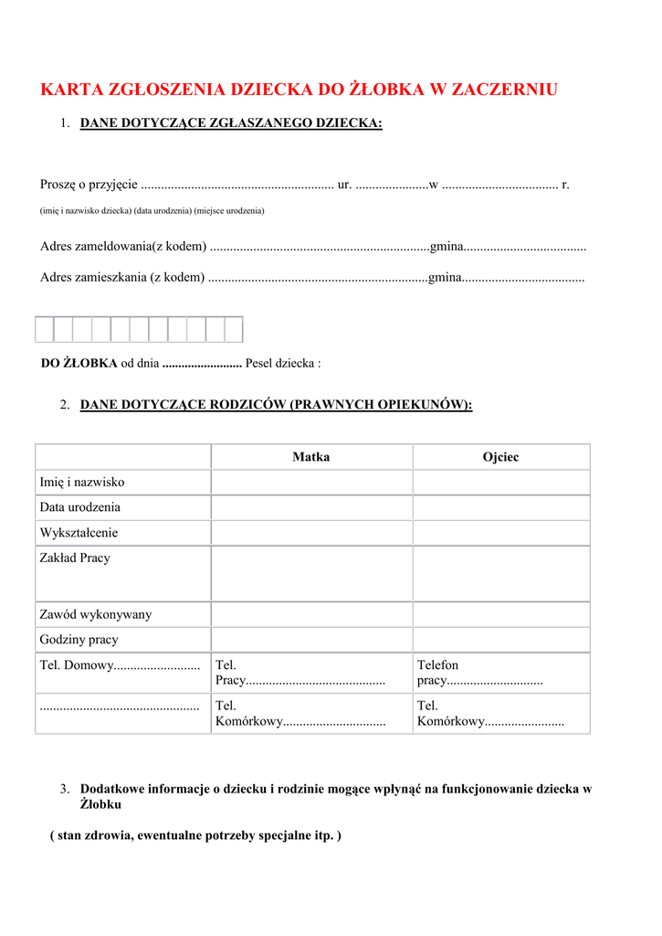 KARTA ZGŁOSZENIA DZIECKA DO ŻŁOBKA W ZACZERNIU 1. DANE DOTYCZĄCE ZGŁASZANEGO DZIECKA: Proszę o przyjęcie .......................................................... ur. ......................w ................................... r. (imię i nazwisko dziecka) (data urodzenia) (miejsce urodzenia) Adres zameldowania(z kodem) ..................................................................gmina..................................... Adres zamieszkania (z kodem) ..................................................................gmina..................................... DO ŻŁOBKA od dnia ......................... Pesel dziecka : 2. DANE DOTYCZĄCE RODZICÓW (PRAWNYCH OPIEKUNÓW): Matka Ojciec Imię i nazwisko Data urodzenia Wykształcenie Zakład Pracy Zawód wykonywany Godziny pracy Tel. Domowy.......................... Tel. Pracy.......................................... Telefon pracy............................. ................................................ Tel. Komórkowy............................... Tel. Komórkowy........................ 3. Dodatkowe informacje o dziecku i rodzinie mogące wpłynąć na funkcjonowanie dziecka w Żłobku ( stan zdrowia, ewentualne potrzeby specjalne itp. ) ………………………………………………………………………………………………… ………………………………………………………………………………………………… 4. Oświadczenia rodziców/prawnych opiekunów dziecka: Oświadczam, ze znane mi są regulacje prawne dotyczące odpłatności oraz zasad korzystania z Żłobka oraz zobowiązuję się do ich przestrzegania i regularnego ponoszenia kosztów za żywienie oraz pobyt dziecka w Żłobku zgodnie z obowiązującym w tym zakresie prawem. Zaczernie, dnia …………………………………… …………………………………...... ( podpis matki/opiekuna prawnego ) ( podpis ojca/opiekuna prawnego ) 5. Informacje dotyczące ochrony danych osobowych. W związku z ustawą z dnia 29 sierpnia 1997 roku o ochronie danych osobowych ( DZ. U.z 2002r. nr 101 poz. 926 z późn. zm. ) wyrażam zgodę na przetwarzanie moich danych osobowych oraz danych osobowych mojego dziecka w sprawach związanych z opieką nad dzieckiem w Żłobku. Oraz na wykorzystywaniu wizerunku mojego dziecka w gazetkach, tablicach żłobkowych, wystawach, folderach, oraz na stronie internetowej Żłobka. Świadomy/a odpowiedzialności karnej oświadczam, że podane przeze mnie dane są zgodne ze stanem faktycznym. Zaczernie, dnia……………. …………………………….. ………………………………. ( podpis matki/opiekuna prawnego ) ( podpis ojca/opiekuna prawnego ) 6. Termin złożenia karty zgłoszenia dziecka do Żłobka………………………………………… Decyzja o przyjęciu/nie przyjęciu dziecka z dniem…………………………………………...