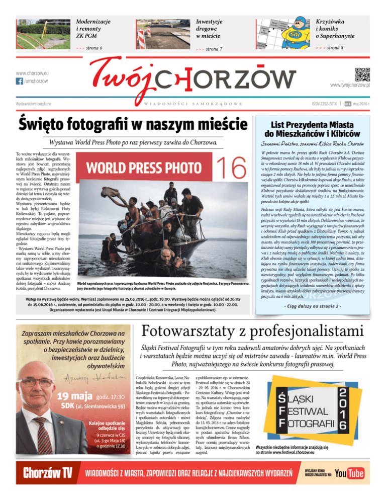 Modernizacje i remonty ZK PGM >>> Inwestycje drogowe w mieście strona 6 >>> Krzyżówka i komiks o Superhanysie > > > strona 8 strona 7 www.chorzow.eu /umchorzow www.twojchorzow.pl wiadomości samorządowe Wydawnictwo bezpłatne Święto fotografii w naszym mieście Wystawa World Press Photo po raz pierwszy zawita do Chorzowa. To ważne wydarzenie dla wszystkich miłośników fotografii. Wystawa jest bowiem prezentacją najlepszych zdjęć nagrodzonych w World Press Photo, najważniejszym konkursie fotografii prasowej na świecie. Ostatnim razem w regionie wystawa gościła ponad dziesięć lat temu i cieszyła się wtedy dużą popularnością. Wystawa prezentowana będzie w hali byłej Elektrowni Huty Królewskiej. To piękne, poprzemysłowe miejsce jest wpisane do rejestru zabytków województwa śląskiego. Mieszkańcy regionu będą mogli oglądać fotografie przez trzy tygodnie. - Wystawa World Press Photo jest marką samą w sobie, a my chcemy zaproponować mieszkańcom coś unikatowego. Zaplanowaliśmy także wiele wydarzeń towarzyszących, by to wydarzenie było okazją spotkania wszystkich miłośników dobrej fotografii – mówi Andrzej Kotala, prezydent Chorzowa. List Prezydenta Miasta do Mieszkańców i Kibiców Szanowni Państwo, szanowni Kibice Ruchu Chorzów W połowie marca br. prezes spółki Ruch Chorzów S.A. Dariusz Smagorowicz zwrócił się do miasta o wypłacenie Klubowi pożyczki w rekordowej sumie 18 mln zł. W przeszłości Chorzów udzielał w tej formie pomocy Ruchowi, ale były to jednak sumy nieprzekraczające 2 mln złotych. Nie była to jedyna forma pomocy finansowej dla spółki. Chorzów kilkukrotnie kupował akcje Ruchu, a także organizował przetargi na promocję poprzez sport, co umożliwiało Klubowi pozyskanie dodatkowych środków na funkcjonowanie. Wartość tych umów wahała się między 1 a 1,5 mln zł. Miasto kupowało też kolejne akcje spółki. Wśród nagrodzonych prac tegorocznego konkursu World Press Photo znalazło się zdjęcie Rosjanina, Sergeya Ponomareva. Jury doceniło jego fotografię ilustrującą dramat uchodźców w Europie. Wstęp na wystawę będzie wolny. Wernisaż zaplanowano na 25.05.2016 r., godz. 18.00. Wystawę będzie można oglądać od 26.05 do 15.06.2016 r., codziennie, od poniedziałku do piątku w godz. 10.00 - 20.00, a w weekendy i święta w godz. 10.00 - 22.00. Organizatorem wydarzenia jest Urząd Miasta w Chorzowie i Centrum Integracji Międzypokoleniowej. Zapraszam mieszkańców Chorzowa na spotkanie. Przy kawie porozmawiamy o bezpieczeństwie w dzielnicy, inwestycjach oraz budżecie obywatelskim 19 maja godz. 17:30 SDK (ul. Siemianowicka 59) Kolejne spotkanie odbędzie się: 9 czerwca w CIS (ul. 3-go Maja 18) o godzinie 17.30 Chorzów TV ISSN 2392-201X | nr 4 maj 2016 r. Podczas sesji Rady Miasta, która odbyła się pod koniec marca, radni w uchwale zgodzili się na umożliwienie udzielenia Ruchowi pożyczki w wysokości 18 mln złotych. Deklarowałem wówczas, że uczynię wszystko, aby Ruch wyciągnąć z tarapatów finansowych i ochronić Klub przed spadkiem z Ekstraklasy. Pomoc tę jednak uzależniłem od odpowiedniego zabezpieczenia pożyczki, tak aby miasto, aby mieszkańcy mieli 100 procentową pewność, że przekazanie takiej sumy pieniędzy odbywa się z poszanowaniem prawa i z należytą troską o publiczne środki. Nadmienić należy, że Klub obecnie znajduje się w sytuacji, w której żadna inna, działająca na rynku finansowym instytucja, żaden bank czy firma prywatna nie chcą udzielić takiej pomocy. Uznają tę spółkę za niewiarygodny, pod względem finansowym, podmiot. Po kilku tygodniach rozmów, licznych spotkaniach i wielogodzinnych negocjacjach dotyczących ustalenia warunków udzielenia i spłaty kredytu, miasto uzyskało dobre zabezpieczenie pierwszej transzy pożyczki na 6 mln złotych. - Ciąg dalszy na stronie 2 - Fotowarsztaty z profesjonalistami Śląski Festiwal Fotografii w tym roku zadowoli amatorów dobrych ujęć. Na spotkaniach i warsztatach będzie można uczyć się od mistrzów zawodu - laureatów m.in. World Press Photo, najważniejszego na świecie konkursu fotografii prasowej. Grzędziński, Koszowska, Lazar, Nabrdalik, Sobolewski - to oni w tym roku będą gośćmi drugiej edycji Śląskiego Festiwalu Fotografii. - Postawiliśmy na topowych fotoreporterów, znanych w kraju i za granicą. Będzie można wziąć udział w ciekawych warsztatach fotograficznych i spotkaniach autorskich - mówi Magdalena Sekuła, pełnomocnik prezydenta ds. aktywizacji społecznej. Uczestnicy będą mieli okazję nauczyć się fotografii ulicznej, wykorzystania telefonów komórkowych w robieniu dobrych zdjęć, poznać tajniki prawa związane z publikowaniem np. w internecie. Festiwal odbędzie się w dniach 28 - 29. 05. 2016 r. w Chorzowskim Centrum Kultury. Wstęp jest wolny. Na warsztaty obowiązują zapisy, spotkania autorskie są otwarte. To jednak nie koniec: trwa konkurs fotograficzny „Chorzów z radością”. Zdjęcia można nadsyłać do 15. 05. 2016 r. na adres [email protected]. Cenne nagrody w postaci aparatów fotograficznych ufundowała firma Nikon. Prace ocenią prowadzący warsztaty, laureaci międzynarodowych nagród. Wszystkie niezbędne informacje znajdują się na stronie www.festiwal.chorzow.eu WIADOMOŚCI Z MIASTA, ZAPOWIEDZI ORAZ RELACJE Z NAJCIEKAWSZYCH WYDARZEŃ OFICJALNY KANAŁ MIASTA ZNAJDZIESZ NA: Aktualności 2 wiadomości samorządowe Galeria w bramie Czy bramę można zamienić w galerię sztuki? W Chorzowie w przejściu między kamienicami przy ul. Sienkiewicza pojawiła się już pierwsza wystawa. - Chcemy, żeby sztuka była dostępna dla jak największej liczby osób, żeby dosłownie „wyszła na ulicę”. Sprawdziliśmy, że z tego skrótu korzysta średnio jedna osoba na minutę. Z taką frekwencją Galeria w Bramie może zostać najczęściej odwiedzaną galerią w Polsce - mówi Tomasz Ignalski, dyrektor Chorzowskiego Centrum Kult