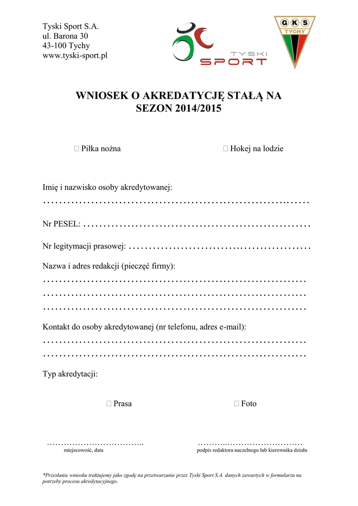Tyski Sport S.A. ul. Barona 30 43-100 Tychy www.tyski-sport.pl WNIOSEK O AKREDATYCJĘ STAŁĄ NA SEZON 2014/2015 Piłka nożna Hokej na lodzie Imię i nazwisko osoby akredytowanej: …………………………………………………….…… Nr PESEL: ………………………………………………… Nr legitymacji prasowej: ……………………….……………… Nazwa i adres redakcji (pieczęć firmy): ………………………………………………………… ………………………………………………………… ………………………………………………………… Kontakt do osoby akredytowanej (nr telefonu, adres e-mail): ………………………………………………………… ………………………………………………………… Typ akredytacji: Prasa …………………………….. miejscowość, data Foto ………..……………………… podpis redaktora naczelnego lub kierownika działu *Przesłanie wniosku traktujemy jako zgodę na przetwarzanie przez Tyski Sport S.A. danych zawartych w formularzu na potrzeby procesu akredytacyjnego.