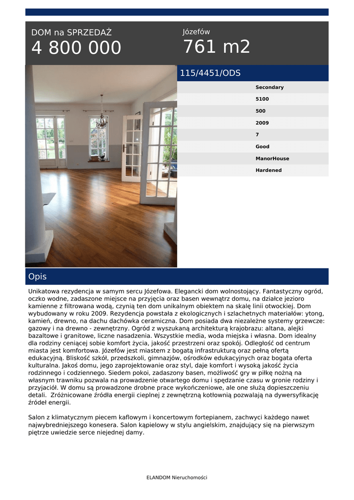 DOM na SPRZEDAŻ 4 800 000 Józefów 761 m2 115/4451/ODS Secondary 5100 500 2009 7 Good ManorHouse Hardened Opis Unikatowa rezydencja w samym sercu Józefowa. Elegancki dom wolnostojący. Fantastyczny ogród, oczko wodne, zadaszone miejsce na przyjęcia oraz basen wewnątrz domu, na działce jezioro kamienne z filtrowana wodą, czynią ten dom unikalnym obiektem na skalę linii otwockiej. Dom wybudowany w roku 2009. Rezydencja powstała z ekologicznych i szlachetnych materiałów: ytong, kamień, drewno, na dachu dachówka ceramiczna. Dom posiada dwa niezależne systemy grzewcze: gazowy i na drewno - zewnętrzny. Ogród z wyszukaną architekturą krajobrazu: altana, alejki bazaltowe i granitowe, liczne nasadzenia. Wszystkie media, woda miejska i własna. Dom idealny dla rodziny ceniącej sobie komfort życia, jakość przestrzeni oraz spokój. Odległość od centrum miasta jest komfortowa. Józefów jest miastem z bogatą infrastrukturą oraz pełną ofertą edukacyjną. Bliskość szkół, przedszkoli, gimnazjów, ośrodków edukacyjnych oraz bogata oferta kulturalna. Jakoś domu, jego zaprojektowanie oraz styl, daje komfort i wysoką jakość życia rodzinnego i codziennego. Siedem pokoi, zadaszony basen, możliwość gry w piłkę nożną na własnym trawniku pozwala na prowadzenie otwartego domu i spędzanie czasu w gronie rodziny i przyjaciół. W domu są prowadzone drobne prace wykończeniowe, ale one służą dopieszczeniu detali. Zróżnicowane źródła energii cieplnej z zewnętrzną kotłownią pozwalają na dywersyfikację źródeł energii. Salon z klimatycznym piecem kaflowym i koncertowym fortepianem, zachwyci każdego nawet najwybredniejszego konesera. Salon kąpielowy w stylu angielskim, znajdujący się na pierwszym piętrze uwiedzie serce niejednej damy. ELANDOM Nieruchomości Serdecznie zapraszam i polecam Anna Betnarska kom: 660 101 000 mail: [email protected] Anna Betnarska tel. 660 101 000 email: [email protected] ELANDOM Nieruchomości Powered by TCPDF (www.tcpdf.org)