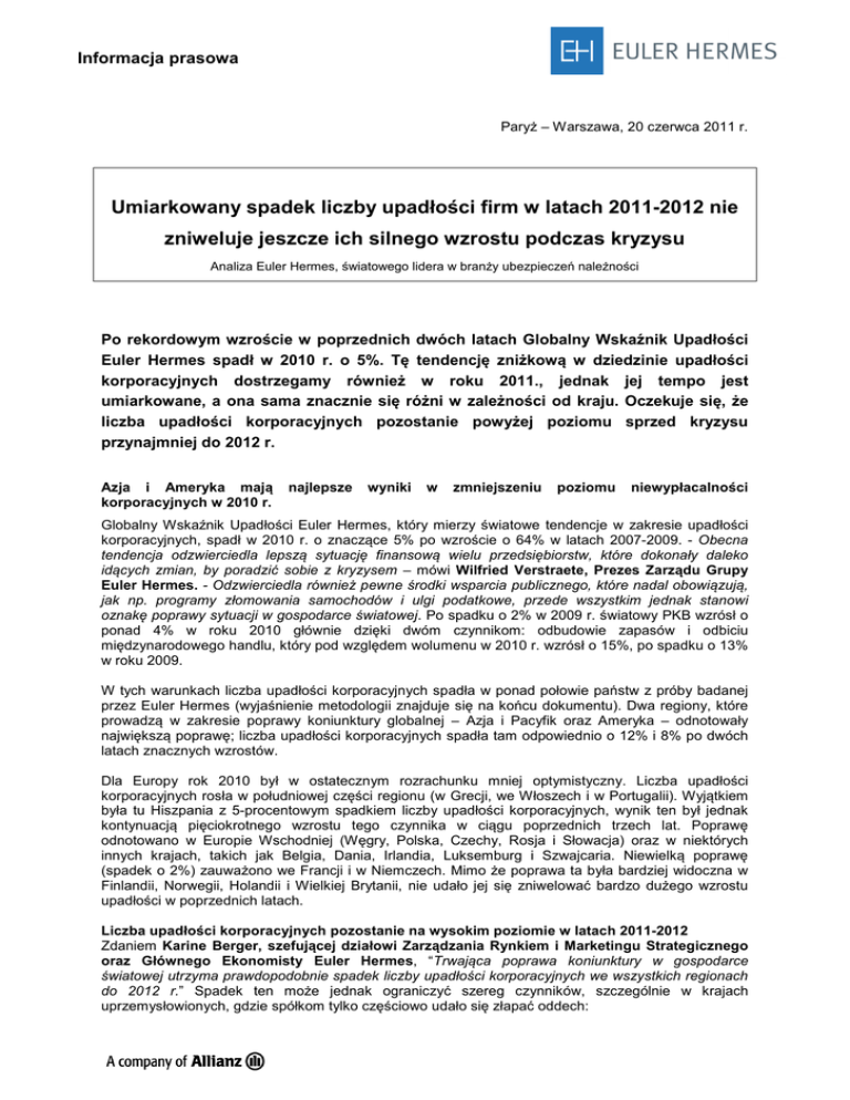 Informacja prasowa Paryż – Warszawa, 20 czerwca 2011 r. Umiarkowany spadek liczby upadłości firm w latach 2011-2012 nie zniweluje jeszcze ich silnego wzrostu podczas kryzysu Analiza Euler Hermes, światowego lidera w branży ubezpieczeń należności Po rekordowym wzroście w poprzednich dwóch latach Globalny Wskaźnik Upadłości Euler Hermes spadł w 2010 r. o 5%. Tę tendencję zniżkową w dziedzinie upadłości korporacyjnych dostrzegamy również w roku 2011., jednak jej tempo jest umiarkowane, a ona sama znacznie się różni w zależności od kraju. Oczekuje się, że liczba upadłości korporacyjnych pozostanie powyżej poziomu sprzed kryzysu przynajmniej do 2012 r. Azja i Ameryka mają korporacyjnych w 2010 r. najlepsze wyniki w zmniejszeniu poziomu niewypłacalności Globalny Wskaźnik Upadłości Euler Hermes, który mierzy światowe tendencje w zakresie upadłości korporacyjnych, spadł w 2010 r. o znaczące 5% po wzroście o 64% w latach 2007-2009. - Obecna tendencja odzwierciedla lepszą sytuację finansową wielu przedsiębiorstw, które dokonały daleko idących zmian, by poradzić sobie z kryzysem – mówi Wilfried Verstraete, Prezes Zarządu Grupy Euler Hermes. - Odzwierciedla również pewne środki wsparcia publicznego, które nadal obowiązują, jak np. programy złomowania samochodów i ulgi podatkowe, przede wszystkim jednak stanowi oznakę poprawy sytuacji w gospodarce światowej. Po spadku o 2% w 2009 r. światowy PKB wzrósł o ponad 4% w roku 2010 głównie dzięki dwóm czynnikom: odbudowie zapasów i odbiciu międzynarodowego handlu, który pod względem wolumenu w 2010 r. wzrósł o 15%, po spadku o 13% w roku 2009. W tych warunkach liczba upadłości korporacyjnych spadła w ponad połowie państw z próby badanej przez Euler Hermes (wyjaśnienie metodologii znajduje się na końcu dokumentu). Dwa regiony, które prowadzą w zakresie poprawy koniunktury globalnej – Azja i Pacyfik oraz Ameryka – odnotowały największą poprawę; liczba upadłości korporacyjnych spadła tam odpowiednio o 12% i 8% po dwóch latach znacznych wzrostów. Dla Europy rok 2010 był w ostatecznym rozrachunku mniej optymistyczny. Liczba upadłości korporacyjnych rosła w południowej części regionu (w Grecji, we Włoszech i w Portugalii). Wyjątkiem była tu Hiszpania z 5-procentowym spadkiem liczby upadłości korporacyjnych, wynik ten był jednak kontynuacją pięciokrotnego wzrostu tego czynnika w ciągu poprzednich trzech lat. Poprawę odnotowano w Europie Wschodniej (Węgry, Polska, Czechy, Rosja i Słowacja) oraz w niektórych innych krajach, takich jak Belgia, Dania, Irlandia, Luksemburg i Szwajcaria. Niewielką poprawę (spadek o 2%) zauważono we Francji i w Niemczech. Mimo że poprawa ta była bardziej widoczna w Finlandii, Norwegii, Holandii i Wielkiej Brytanii, nie udało jej się zniwelować bardzo dużego wzrostu upadłości w poprzednich latach. Liczba upadłości korporacyjnych pozostanie na wysokim poziomie w latach 2011-2012 Zdaniem Karine Berger, szefującej działowi Zarządzania Rynkiem i Marketingu Strategicznego oraz Głównego Ekonomisty Euler Hermes, “Trwająca poprawa koniunktury w gospodarce światowej utrzyma prawdopodobnie spadek liczby upadłości korporacyjnych we wszystkich regionach do 2012 r.” Spadek ten może jednak ograniczyć szereg czynników, szczególnie w krajach uprzemysłowionych, gdzie spółkom tylko częściowo udało się złapać oddech: Wolniejsze tempo rozwoju światowej gospodarki – oczekuje się, iż spadnie ono do ok. 3% w 2011 i 2012 r. – a w szczególności niskie tempo rozwoju państw europejskich jako całości; Rosnące koszty produkcji (surowce, koszty pracy itp.); oraz Zacieśniana polityka monetarna, przy znacznej stracie konkurencyjności powiązanej w niektórych krajach z kursami wymiany walut. Z uwagi na powyższe czynniki spadek globalnego indeksu upadłości będzie w 2011 r. najpewniej umiarkowany (-7%) i 2012 r. (-5%), a przypadki wyjątkowe wiążą się ze specyficznymi warunkami gospodarczymi (Grecja i Portugalia) oraz wydarzeniami nadzwyczajnymi (Japonia). “W ogólnym rozrachunku spadek globalnego wskaźnika w latach 2010-2012 nie wystarczy, by zrównoważyć rekordowe wzrosty z lat 2008-2009. Innymi słowy, poziom upadłości korporacyjnych w roku 2012 będzie w wielu krajach nadal wyższy niż w 2007 r.” mówi Wilfried Verstraete. Polska nie jest wyjątkiem Widać już poprawę, której wyznacznikiem jest wskaźnik upadłości, ale nadal w skali całego kraju nie jest to jeszcze powrót do stanu sprzed światowego kryzysu. Znaczne różnice w podziale na województwa. Po przejściu przez światowy kryzys bez prawdziwej recesji (1,7% wzrost PKB w 2009), dzięki m.in. stabilności popytu wewnętrznego, Polska odnotowała solidny wzrost w 2010 r (3,8%), dynamizowany dodatkowo ożywieniem eksportu i odnawianiem zapasów, co przyczyniło się do prawie do ustabilizowania liczby bankructw (+3% w 2010). Jak mówi Tomasz Starus, dyrektor Biura Oceny Ryzyka w Euler Hermes: „Prognozy pozostają w miarę korzystne na obecny i 2012 rok, m.in. dzięki inwestycjom publicznym w infrastrukturę, co powinno równoważyć negatywne skutki z oczekiwanego wzrostu inflacji. Przed większym optymizmem powstrzymuje z kolei m.in. to, iż stopa bezrobocia zapewne nie zmniejszy się z wysokiego poziomu odnotowanego w 2009 r.” Dalszy wzrost gospodarczy w tempie ok. 3,5% w latach 2011-2012, powinien przynieść efekt w postaci zmniejszającej się liczy upadłości w 2011r. (-10% r/r), pozostając jednak do 2012 r na poziomie wyższym niż przed kryzysem w 2008r. Znajduje to potwierdzenie także w aktualnych statystykach upadłości: skupiając się dla większej pewności na danych za pierwsze 4 miesiące br. (dane za maj są dopiero są w trakcie publikacji) w porównaniu do analogicznego okresu 2008 roku liczba upadłości jest obecnie większa w skali całego kraju o 45%. Przy czym mamy do czynienia z