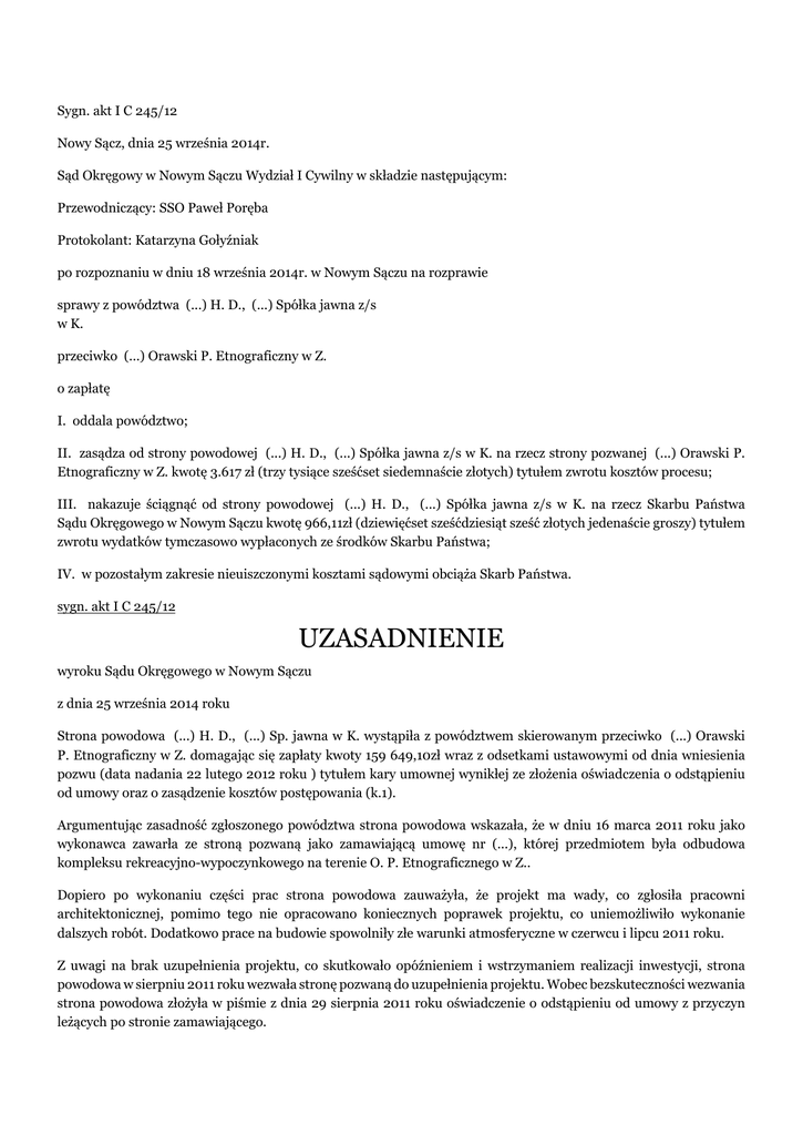 Sygn. akt I C 245/12 Nowy Sącz, dnia 25 września 2014r. Sąd Okręgowy w Nowym Sączu Wydział I Cywilny w składzie następującym: Przewodniczący: SSO Paweł Poręba Protokolant: Katarzyna Gołyźniak po rozpoznaniu w dniu 18 września 2014r. w Nowym Sączu na rozprawie sprawy z powództwa (...) H. D., (...) Spółka jawna z/s w K. przeciwko (...) Orawski P. Etnograficzny w Z. o zapłatę I. oddala powództwo; II. zasądza od strony powodowej (...) H. D., (...) Spółka jawna z/s w K. na rzecz strony pozwanej (...) Orawski P. Etnograficzny w Z. kwotę 3.617 zł (trzy tysiące sześćset siedemnaście złotych) tytułem zwrotu kosztów procesu; III. nakazuje ściągnąć od strony powodowej (...) H. D., (...) Spółka jawna z/s w K. na rzecz Skarbu Państwa Sądu Okręgowego w Nowym Sączu kwotę 966,11zł (dziewięćset sześćdziesiąt sześć złotych jedenaście groszy) tytułem zwrotu wydatków tymczasowo wypłaconych ze środków Skarbu Państwa; IV. w pozostałym zakresie nieuiszczonymi kosztami sądowymi obciąża Skarb Państwa. sygn. akt I C 245/12 UZASADNIENIE wyroku Sądu Okręgowego w Nowym Sączu z dnia 25 września 2014 roku Strona powodowa (...) H. D., (...) Sp. jawna w K. wystąpiła z powództwem skierowanym przeciwko (...) Orawski P. Etnograficzny w Z. domagając się zapłaty kwoty 159 649,10zł wraz z odsetkami ustawowymi od dnia wniesienia pozwu (data nadania 22 lutego 2012 roku ) tytułem kary umownej wynikłej ze złożenia oświadczenia o odstąpieniu od umowy oraz o zasądzenie kosztów postępowania (k.1). Argumentując zasadność zgłoszonego powództwa strona powodowa wskazała, że w dniu 16 marca 2011 roku jako wykonawca zawarła ze stroną pozwaną jako zamawiającą umowę nr (...), której przedmiotem była odbudowa kompleksu rekreacyjno-wypoczynkowego na terenie O. P. Etnograficznego w Z.. Dopiero po wykonaniu części prac strona powodowa zauważyła, że projekt ma wady, co zgłosiła pracowni architektonicznej, pomimo tego nie opracowano koniecznych poprawek projektu, co uniemożliwiło wykonanie dalszych robót. Dodatkowo prace na budowie spowolniły złe warunki atmosferyczne w czerwcu i lipcu 2011 roku. Z uwagi na brak uzupełnienia projektu, co skutkowało opóźnieniem i wstrzymaniem realizacji inwestycji, strona powodowa w sierpniu 2011 roku wezwała stronę pozwaną do uzupełnienia projektu. Wobec bezskuteczności wezwania strona powodowa złożyła w piśmie z dnia 29 sierpnia 2011 roku oświadczenie o odstąpieniu od umowy z przyczyn leżących po stronie zamawiającego. Na podstawie postanowień umowy w związku z odstąpieniem z winy zamawiającego przysługuje roszczenie o wypłatę kary umownej w wysokości 10 % brutto wynagrodzenia przewidzianego w umowie. Strona powodowa jako wykonawca zobligowana była na mocy przepisów prawa do zgłoszenia pozwanemu braków występujących w dokumentacji projektowej, czemu uczyniła zadość. Uprawniona była do złożenia oświadczenia o odstąpieniu od umowy z przyczyn leżących po stronie pozwanego, albowiem braki w projekcie jak i późniejsza odmowa pozwanego ich uzupełnienia uniemożliwiły kontynuowanie prac i realizację inwestycji. Za przygotowanie projektu odpowiedzialny był pozwany. Stanowisko pozwanego, iż strona powodowa powinna skontrolować projekt i zgłosić ewentualne braki na etapie kompletowania dokumentacji nie jest zasadne. Istotne braki projektu ujawniły się wraz z postępem prowadzonych prac i ich zaawansowaniem, a więc nastąpiło to w ścisłym związku z przechodzeniem przez wykonawcę do kolejnych etapów robót (k.90, k. 98). Strona pozwana (...)O. P. Etnograficzny w Z. wniosła o oddalenie powództwa oraz zasądzenie na jej kosztów postępowania (k.76). Strona pozwana zaprzeczyła, by projekt dostarczony przez nią wykonawcy miał wady i by była ona zobowiązana do dostarczania dalszych dokumentów. Projekt został wykonany w sposób kompletny. Co do zarzutu dotyczącego braku określenia w projekcie sposobu mocowania i napinania przekrycia membrany przykrywającej amfiteatr i wykonania fundamentów do kotew lin, które miały utrzymywać membranę projektant kilkukrotnie wyjaśniał, że na etapie projektowania nie było możliwe określenie kwestionowanych parametrów, ponieważ do tego konieczna była znajomość parametrów membrany, zatem i jej producenta, a wskazanie tych elementów przez projektanta byłoby równoznaczne ze złamaniem ustawy o zamówieniach publicznych, ponieważ nazwa producenta znalazłaby się w SIWZ nie dając możliwości wyboru producenta. Zdaniem strony pozwanej obowiązkiem wykonawcy, czyli strony powodowej było wskazanie producenta membrany jaką zastosuje. W opisie technicznym projektu wykonawczego zawarty był zapis, wedle którego w momencie wyboru dostawcy zadaszenia, po podaniu przez niego sił naciągowych brezentu, należało skontaktować się z autorem projektu w celu ponownego przeanalizowania sił w konstrukcji stalowej i ewentualnego skorygowania konstrukcji. Przed realizacją fundamentów wykonawca miał obowiązek wykonać badania geologiczne i przedstawić wyniki autorowi projektu. Przed wykonaniem konstrukcji stalowej zadaszenia wykonawca miał wybrać wykonawcę przekrycia zadaszenia i przekazać autorowi projektu siły naciągu, które musiały być zweryfikowane z siłami przyjętymi wstępnie do obliczeń. Strona pozwana zarzuciła, iż badania geologiczne zostały wykonane dopiero w sierpniu 2011 roku. Dane dotyczące producenta membrany zostały przedstawione dopiero we wrześniu 2011 roku, pomimo iż już w połowie sierpnia projektant przekazał wykonawcy dane trzech producentów. Z powyższego wynika, że zarzuty dotyczące braku współpracy ze strony zamawiającego są bezzasadne, a prace były znacznie opóźnione. Nie widząc szans na wykonanie prac w terminie, wykonawca wniósł o przedłużenie, a następnie złożył oświadczenie o odstąpieniu, które strona pozwana uznała za nieskuteczn