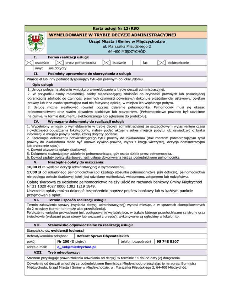 Karta usługi Nr 13/RSO WYMELDOWANIE W TRYBIE DECYZJI ADMINISTRACYJNEJ Urząd Miasta i Gminy w Międzychodzie ul. Marszałka Piłsudskiego 2 64-400 MIĘDZYCHÓD I. Forma realizacji usługi: osobiście inny: II. przez pełnomocnika listownie fax elektronicznie nie dotyczy Podmioty uprawnione do skorzystania z usługi: Właściciel lub inny podmiot dysponujący tytułem prawnym do lokalu/domu. III. Opis usługi: 1. Usługa polega na złożeniu wniosku o wymeldowanie w trybie decyzji administracyjnej. 2. W przypadku osoby małoletniej, osoby nieposiadającej zdolności do czynności prawnych lub posiadającej ograniczoną zdolność do czynności prawnych czynności powyższych dokonuje przedstawiciel ustawowy, opiekun prawny lub inna osoba sprawująca nad nią faktyczną opiekę, w miejscu ich wspólnego pobytu. 3. Usługę można zrealizować również poprzez działanie pełnomocnika. Pełnomocnik musi się okazać pełnomocnictwem oraz swoim dowodem osobistym lub paszportem. (Pełnomocnictwo powinno być udzielone na piśmie, w formie dokumentu elektronicznego lub zgłoszone do protokołu). IV. Wymagane dokumenty do realizacji usługi: 1. Wypełniony wniosek o wymeldowanie w trybie decyzji administracyjnej ze szczegółowym wyjaśnieniem czasu i okoliczności opuszczenia lokalu/domu, należy podać aktualny adres miejsca pobytu lub oświadczyć o braku informacji o miejscu pobytu osoby, której dotyczy podanie. 2. Kserokopia dokumentu potwierdzającego tytuł prawny do lokalu/domu (dokumentem potwierdzającym tytuł prawny do lokalu/domu może być umowa cywilno-prawna, wypis z księgi wieczystej, decyzja administracyjna lub orzeczenie sądu). 4. Dowód uiszczenia opłaty skarbowej. 5. Dokument stwierdzający udzielenie pełnomocnictwa, gdy osoba działa przez pełnomocnika. 6. Dowód zapłaty opłaty skarbowej, jeśli usługa dokonywana jest za pośrednictwem pełnomocnika. V. Niezbędne opłaty do uiszczenia: 10,00 zł za wydanie decyzji administracyjnej o wymeldowaniu. 17,00 zł od udzielonego pełnomocnictwa (od każdego stosunku pełnomocnictwa jeśli dotyczy), pełnomocnictwo nie podlega opłacie skarbowej jeżeli jest udzielane małżonkowi, wstępnemu, zstępnemu lub rodzeństwu. Opłatę skarbową za udzielone pełnomocnictwo należy uiścić na rachunek bankowy Gminy Międzychód Nr 31 1020 4027 0000 1302 1219 1849. Uiszczenia opłaty można dokonać bezpośrednio poprzez przelew bankowy lub w każdym punkcie przyjmowania opłat. VI. Termin i sposób realizacji usługi: Termin załatwienia sprawy (wydania decyzji administracyjnej) wynosi miesiąc, a w sprawach skomplikowanych do 2 miesięcy (termin ten może ulec przedłużeniu). Po złożeniu wniosku prowadzone jest postępowanie wyjaśniające, w trakcie którego przesłuchiwane są strony oraz świadkowie (wskazani przez strony lub wezwani z urzędu), wykonywane są oględziny w lokalu, itp. VII. Stanowisko odpowiedzialne za realizację usługi: Stanowisko ds. ewidencji ludności Referat/komórka odrębna: Referat Spraw Obywatelskich pokój: Nr 200 (II piętro) adres e-mail: [email protected] VIII. telefon bezpośredni 95 748 8107 Tryb odwoławczy: Stronom przysługuje prawo złożenia odwołania od decyzji w terminie 14 dni od daty jej doręczenia. Odwołanie od decyzji wnosi się za pośrednictwem Burmistrza Międzychodu przesyłając je na adres: Burmistrz Międzychodu, Urząd Miasta i Gminy w Międzychodzie, ul. Marszałka Piłsudskiego 2, 64-400 Międzychód. IX. Podstawa prawna realizacji usługi: ustawa z 24 września 2010 r. o ewidencji ludności ustawa z 14 czerwca 1960 r. Kodeks postępowania administracyjnego 1. 2. X. Dodatkowe informacje/uwagi: 1. Osoba, która opuszcza miejsce pobytu stałego lub czasowego (przed upływem deklarowanego okresu pobytu) obowiązana jest wymeldować się. 2. Wymeldowania z miejsca pobytu stałego/czasowego dokonuje się: - w formie pisemnej na formularzu w organie gminy właściwym dla dotychczasowego miejsca pobytu, - w formie dokumentu elektronicznego na formularzu umożliwiającym wprowadzenie danych do systemu teleinformatycznego organu gminy, pod warunkiem otrzymania przez osobę urzędowego poświadczenia odbioru. Wyłącznie osoba posiadająca ważny kwalifikowany certyfikat lub certyfikat podpisu osobistego, lub podpis potwierdzony profilem zaufanym ePUAP. W przypadku dokonania zgłoszenia wymeldowania z miejsca pobytu stałego/czasowego przy wykorzystaniu dokumentu elektronicznego należy wskazać adres elektroniczny służący do doręczeń. 3. Można wymeldować się z miejsca pobytu stałego/czasowego dokonując zameldowania w nowym miejscu pobytu. 4. Organ gminy wydaje z urzędu lub na wniosek właściciela decyzję w sprawie wymeldowania obywatela polskiego, który opuścił miejsce pobytu stałego albo opuścił miejsce pobytu czasowego przed upływem deklarowanego okresu pobytu i nie dopełnił obowiązku wymeldowania się. XI. 1. 3. Formularze i wnioski do usługi: Wniosek o wymeldowanie w trybie decyzji administracyjnej. Pełnomocnictwo do czynności. Niniejsza karta zawiera opis podstawowej procedury i może nie uwzględniać szczególnych przypadków związanych z załatwieniem danej sprawy, wynikających z obowiązujących przepisów prawa. Treść karty nie może być źródłem praw lub obowiązków wnioskodawcy, organu lub osób trzecich.