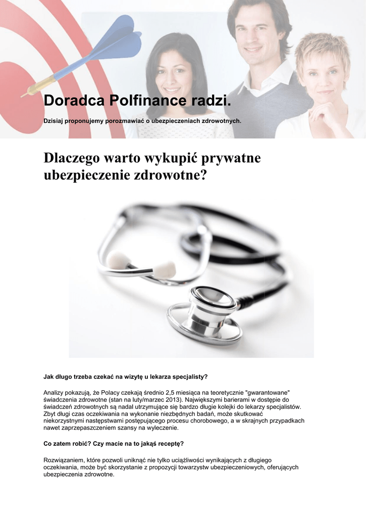 Doradca Polfinance radzi. Dzisiaj proponujemy porozmawiać o ubezpieczeniach zdrowotnych. Dlaczego warto wykupić prywatne ubezpieczenie zdrowotne? Jak długo trzeba czekać na wizytę u lekarza specjalisty? Analizy pokazują, że Polacy czekają średnio 2,5 miesiąca na teoretycznie "gwarantowane" świadczenia zdrowotne (stan na luty/marzec 2013). Największymi barierami w dostępie do świadczeń zdrowotnych są nadal utrzymujące się bardzo długie kolejki do lekarzy specjalistów. Zbyt długi czas oczekiwania na wykonanie niezbędnych badań, może skutkować niekorzystnymi następstwami postępującego procesu chorobowego, a w skrajnych przypadkach nawet zaprzepaszczeniem szansy na wyleczenie. Co zatem robić? Czy macie na to jakąś receptę? Rozwiązaniem, które pozwoli uniknąć nie tylko uciążliwości wynikających z długiego oczekiwania, może być skorzystanie z propozycji towarzystw ubezpieczeniowych, oferujących ubezpieczenia zdrowotne. Dlaczego to ma sens? Decydując się na wykupienie prywatnej polisy zdrowotnej zyskuje się gwarancję pokrycia kosztów specjalistycznych wizyt i badań. Przykładowo, w sytuacji wystąpienia poważnego schorzenia: nowotworu, zawału serca, udaru mózgu - decydując się na zostanie Klientem towarzystwa ubezpieczeniowego, otrzymuje On nie tylko zwrot bieżących kosztów leczenia, ale również pokrycie późniejszych konsekwencji choroby (brak zdolności do pracy, potrzeba dalszej rehabilitacji). Prywatne ubezpieczenie zdrowotne może być oferowane jedynie jako ubezpieczenie dodatkowe. A więc co możemy zyskać dzięki prywatnej polisie medycznej? 1. Szeroki zakres bezpłatnych badań diagnostycznych 2. Bezgotówkowa realizacja świadczeń medycznych 3. Możliwość korzystania z prawie 1000 placówek medycznych w całej Polsce nie tylko w miejscu zamieszkania 4. Bardzo krótkie terminy realizacji wizyt u lekarzy specjalistów - bez skierowania 5. Nielimitowany dostęp do lekarzy specjalistów nawet kilkunastu specjalności; m.in. chirurg, ginekolog, kardiolog, okulista, laryngolog, dermatolog, urolog 6. Rozszerzony zakres badań diagnostycznych w tym miedzy innymi tomografia komputerowa, rezonans magnetyczny, mammografia 7. Infolinia czynna 24h/ 7 dni w tygodniu która umówi wizytę u lekarza Ubezpieczenie w zależności od wariantu może obejmować także: 8. 9. 10. 11. 12. 13. 14. 15. 16. 17. Prowadzenie ciąży Rehabilitację Wizyty domowe Szczepienie przeciw grypie Wysokość składki nie jest uzależniona od stanu zdrowia czy wieku osoby ubezpieczonej Wysoki standard obsługi osoby ubezpieczonej - usługi medyczne realizowane są w placówkach o wysokim standardzie, nowoczesnym wyposażeniu gabinetów specjalistycznych i gabinetów zabiegowych Znany i ceniony partner medyczny LUX-MED Sp. z o.o. W samym Wieluniu są trzy placówki w których można wykonywać badania objęte ubezpieczeniem: Brak konieczności wypełniania ankiety medycznej o stanie zdrowia Minimum formalności przy zawieraniu ubezpieczenia Natychmiastowa decyzja o możliwości zawarcia umowy ubezpieczenia Ile to kosztuje? Czy stać nas na wykupienie takiej polisy? Ubezpieczenie dostępne jest w trzech wariantach, przyjazne dla naszej kieszeni zaczynają się już od 55 zł miesięcznie, kiedy jedna wizyta prywatna u lekarza specjalisty to wydatek rzędu 60-70 zł. W tym miejscu każdy z nas musi sobie odpowiedzieć czy to dużo? Ubezpieczenie dostępne jest również w wariancie rodzinnym .O jej cenie decyduje wybrany wariant, bez względu na ilość osób w rodzinie. System publicznej opieki zdrowotnej nie zaspokaja w całości społecznych potrzeb. Dlatego aby zadbać o swoje zdrowie w możliwie najlepszy sposób, powinno się zakupić prywatne ubezpieczenie. Warto o nim pomyśleć kiedy jeszcze jesteśmy zdrowi i młodzi - wówczas jego koszt jest niższy. W zamian uzyskujemy możliwość leczenia w renomowanych prywatnych placówkach medycznych oraz gwarancję, że gdy będziemy potrzebowali profesjonalnej pomocy lekarskiej w nagłym wypadku, nie będziemy musieli martwić się o pieniądze. Gdzie takie ubezpieczenie można kupić? Zapraszamy do siedziby naszej Firmy: Polfinance Wieluń, ul. Krakowskie Przedmieście 46 Przygotował: Departament Ubezpieczeń Osobowych i Zdrowotnych Polfinance Sp. z o.o.