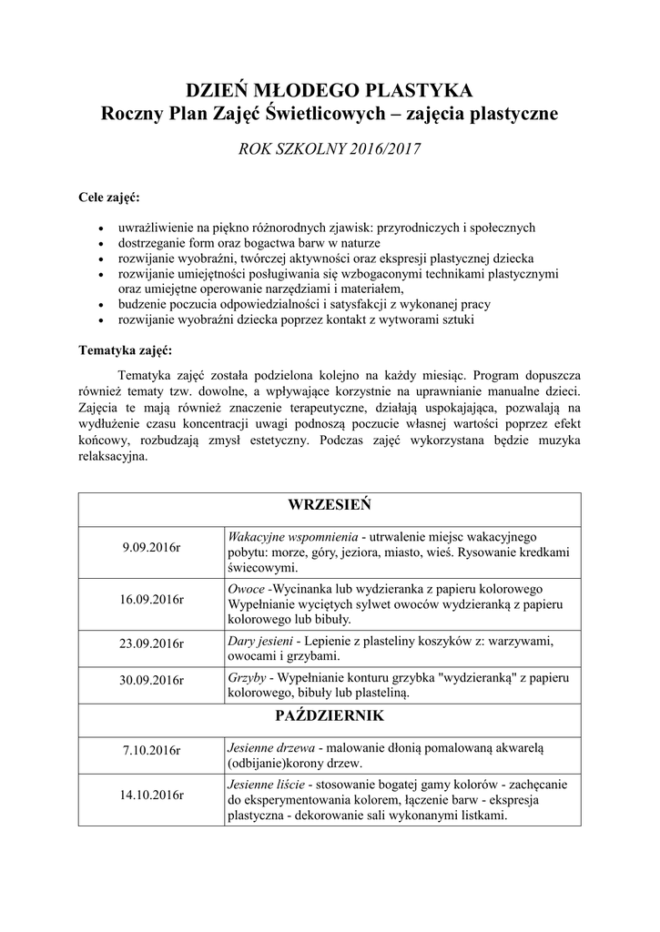 DZIEŃ MŁODEGO PLASTYKA Roczny Plan Zajęć Świetlicowych – zajęcia plastyczne ROK SZKOLNY 2016/2017 Cele zajęć: uwrażliwienie na piękno różnorodnych zjawisk: przyrodniczych i społecznych dostrzeganie form oraz bogactwa barw w naturze rozwijanie wyobraźni, twórczej aktywności oraz ekspresji plastycznej dziecka rozwijanie umiejętności posługiwania się wzbogaconymi technikami plastycznymi oraz umiejętne operowanie narzędziami i materiałem, budzenie poczucia odpowiedzialności i satysfakcji z wykonanej pracy rozwijanie wyobraźni dziecka poprzez kontakt z wytworami sztuki Tematyka zajęć: Tematyka zajęć została podzielona kolejno na każdy miesiąc. Program dopuszcza również tematy tzw. dowolne, a wpływające korzystnie na uprawnianie manualne dzieci. Zajęcia te mają również znaczenie terapeutyczne, działają uspokajająca, pozwalają na wydłużenie czasu koncentracji uwagi podnoszą poczucie własnej wartości poprzez efekt końcowy, rozbudzają zmysł estetyczny. Podczas zajęć wykorzystana będzie muzyka relaksacyjna. WRZESIEŃ 9.09.2016r Wakacyjne wspomnienia - utrwalenie miejsc wakacyjnego pobytu: morze, góry, jeziora, miasto, wieś. Rysowanie kredkami świecowymi. 16.09.2016r Owoce -Wycinanka lub wydzieranka z papieru kolorowego Wypełnianie wyciętych sylwet owoców wydzieranką z papieru kolorowego lub bibuły. 23.09.2016r Dary jesieni - Lepienie z plasteliny koszyków z: warzywami, owocami i grzybami. 30.09.2016r Grzyby - Wypełnianie konturu grzybka "wydzieranką" z papieru kolorowego, bibuły lub plasteliną. PAŹDZIERNIK 7.10.2016r Jesienne drzewa - malowanie dłonią pomalowaną akwarelą (odbijanie)korony drzew. 14.10.2016r Jesienne liście - stosowanie bogatej gamy kolorów - zachęcanie do eksperymentowania kolorem, łączenie barw - ekspresja plastyczna - dekorowanie sali wykonanymi listkami. 21.10.2016r Korale jarzębinowe - wykonanie jarzębinowych korali porównywanie długości sznurków korali. 28.10.2016r Kasztaniaki - zabawki z kasztanów i żołędzi - bezpieczne posługiwanie się narzędziami pracy. LISTOPAD 4.11.2016r Orzeł biały - wypełnianie konturu kredkami, farbami, plasteliną, wydzieranką. 11.11.2016r Dzień wolny od zajęć dydaktyczno - wychowawczych (święta państwowe i kościelne) 18.11.2016r Parasolki kolorowe - wycinanie konturu , zamalowywanie farbkami, kredkami, mazakami. 25.11.2016r Jeż - wycinanie sylwety jeża z kartonu, zamalowywanie pastelami. GRUDZIEŃ 2.12.2016r Gwiazdki - wycinanie i składanie gwiazdek przestrzennych metoda orgiami. 9.12.2016r Bombki choinkowe – origami. 16.12.2016r Kartka świąteczna - wykonanie techniką collage. STYCZEŃ 6.01.2017r Dzień wolny od zajęć dydaktyczno - wychowawczych (święta państwowe i kościelne) 13.01.2017r Bezpieczne ferie zimowe - Malowanie farbą plakatową . LUTY 3.02.2017r Mieszkańcy innej planety – rysowanie ołówkiem 10.02.2017r Walentynkowe serca - laurki z sercem wypełnionym wydzieranką 17.02.2017r Niedźwiedź polarny - wyklejanie wyciętej sylwety watą 24.02.2017r Bałwan - wyklejanie płatkami kosmetycznymi bałwana MARZEC 3.03.2017r Kobiety w mojej rodzinie – rysowanie kobiet w trakcie wykonywania różnych prac domowych, technika dowolna 10.03.2017r Krokus - wypełnianie konturu kwiatka bibułowymi kulkami lub papierem kolorowym 17.03.2017r Wiosna wokół nas - malowanie farbami 24.03.2017r Bocian - Wyklejanie konturu boćka watą lub czarno – białą gazetą i doklejanie wyciętego dzioba i nóg 31.03.2017r Moja ulubiona bajka, baśń – rysowanie kredkami. KWIECIEŃ 7.04.2017r Wiosenne kwiaty chronione – rysowanie pastelami. 21.04.2017r Różowe okulary – witraż 28.04.2017r Statek, samolot – składanie papieru w/g wzoru. MAJ 5.05.2017r Zakładka do książki – wykonywanie dowolną metodą 12.05.2017r Kolorowe mozaiki – kolorowanie i ozdabianie mandali 19.05.2017r Portret mamy - malowanie farbami plakatowymi 26.05.2017r Moje ulubione zwierzątko – lepienie z plasteliny CZERWIEC 2.06.2017r Dzień wolny od zajęć dydaktycznych zgodnie z Rozporządzeniem Ministra Edukacji Narodowej z dnia 5 października 2010r 9.06.2017r Twarze dzieci - wykonywanie portretów dzieci metodą wydzieranki, lub wyklejanie z plasteliny twarzy: Murzynka, Chińczyka i Europejczyka - zapoznanie się z przedstawicielami różnych narodowości i ras ludzkich. 16.06.2017r Dzień wolny od zajęć dydaktycznych zgodnie z Rozporządzeniem Ministra Edukacji Narodowej z dnia 5 października 2010r Opracowała mgr Wioletta Mech