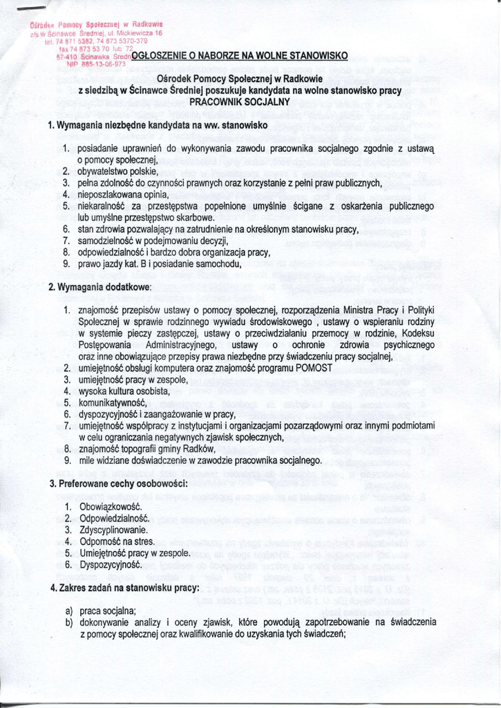 Ómfez Parmscy Społecznej w Radkowie z/s w Śćifi§wg§ Średniej, ul. Mickiewicza 16 tel. 74 171 S382, 74 873 5370-379 5M(oSrSwka średnOGŁOSZENIE O NABORZE NA WOLNE STANOWISKO H\P 885-13-06-973 Ośrodek Pomocy Społecznej w Radkowie z siedzibą w Ścinawce Średniej poszukuje kandydata na wolne stanowisko pracy PRACOWNIK SOCJALNY 1. Wymagania niezbędne kandydata na ww. stanowisko 1. posiadanie uprawnień do wykonywania zawodu pracownika socjalnego zgodnie z ustawą o pomocy społecznej, 2. obywatelstwo polskie, 3. pełna zdolność do czynności prawnych oraz korzystanie z pełni praw publicznych, 4. nieposzlakowana opinia, 5. niekaralność za przestępstwa popełnione umyślnie ścigane z oskarżenia publicznego lub umyślne przestępstwo skarbowe. 6. stan zdrowia pozwalający na zatrudnienie na określonym stanowisku pracy, 7. samodzielność w podejmowaniu decyzji, 8. odpowiedzialność i bardzo dobra organizacja pracy, 9. prawo jazdy kat. B i posiadanie samochodu, 2. Wymagania dodatkowe: 1. znajomość przepisów ustawy o pomocy społecznej, rozporządzenia Ministra Pracy i Polityki Społecznej w sprawie rodzinnego wywiadu środowiskowego , ustawy o wspieraniu rodziny w systemie pieczy zastępczej, ustawy o przeciwdziałaniu przemocy w rodzinie, Kodeksu Postępowania Administracyjnego, ustawy o ochronie zdrowia psychicznego oraz inne obowiązujące przepisy prawa niezbędne przy świadczeniu pracy socjalnej, 2. umiejętność obsługi komputera oraz znajomość programu POMOST 3. umiejętność pracy w zespole, 4. wysoka kultura osobista, 5. komunikatywność, 6. dyspozycyjność i zaangażowanie w pracy, 7. umiejętność współpracy z instytucjami i organizacjami pozarządowymi oraz innymi podmiotami w celu ograniczania negatywnych zjawisk społecznych, 8. znajomość topografii gminy Radków, 9. mile widziane doświadczenie w zawodzie pracownika socjalnego. 3. Preferowane cechy osobowości: 1. 2. 3. 4. 5. 6. Obowiązkowość. Odpowiedzialność. Zdyscyplinowanie. Odporność na stres. Umiejętność pracy w zespole. Dyspozycyjność. 4. Zakres zadań na stanowisku pracy: a) praca socjalna; b) dokonywanie analizy i oceny zjawisk, które powodują zapotrzebowanie na świadczenia z pomocy społecznej oraz kwalifikowanie do uzyskania tych świadczeń; c) udzielanie informacji, wskazówek i pomocy w zakresie rozwiązywania spraw życiowych osobom, które dzięki tej pomocy będą zdolne samodzielnie rozwiązywać problemy będące przyczyną trudnej sytuacji życiowej; skuteczne posługiwanie się przepisami prawa w realizacji tych zadań; d) pomoc w uzyskaniu dla osób będących w trudnej sytuacji życiowej poradnictwa dotyczącego możliwości rozwiązywania problemów i udzielania pomocy przez właściwe instytucje państwowe, samorządowe i organizacje pozarządowe oraz wspieranie w uzyskiwaniu pomocy; e) udzielanie pomocy zgodnie z zasadami etyki zawodowej; f) pobudzenie społecznej aktywności i inspirowanie działań samopomocowych w zaspokajaniu niezbędnych potrzeb życiowych osób, rodzin, grup i środowisk społecznych; g) współpraca i współdziałanie z innymi specjalistami w celu przeciwdziałania i ograniczania patologii i skutków negatywnych zjawisk społecznych, łagodzenie skutków ubóstwa; h) inicjowanie nowych form pomocy osobom i rodzinom mającym trudną sytuację życiową oraz inspirowanie powołania instytucji świadczących usługi służące poprawie sytuacji takich osób i rodzin; i) przygotowywanie wymaganej dokumentacji w celu ustalenia planu pomocy; j) diagnozowanie podległego rejonu. 5. Warunki pracy: 1) wymiar czasu pracy: pełny - 1 etat; 2) podstawowy system czasu pracy; 3) praca w terenie; 4) przewidywany termin rozpoczęcia pracy 22.02.2016 r. 6. Wymagane dokumenty: 1. list motywacyjny z podaniem numeru kontaktowego; 2. oryginał kwestionariusza osobowego dla osoby ubiegającej się o zatrudnienie - do pobrania na stronach: www.opsradkow.pl: www.ops-radkow.biuletvn.net 3. życiorys (CV); 4. potwierdzone przez kandydata za zgodność z oryginałem kserokopie dokumentów potwierdzających posiadane wykształcenie; 5. potwierdzone przez kandydata za zgodność z oryginałem kserokopie dokumentów potwierdzających ukończone szkolenia (referencje) jeżeli kandydat takie posiada; 6. potwierdzone przez kandydata za zgodność z oryginałem kserokopie dokumentów potwierdzających doświadczenie zawodowe, jeżeli kandydat takie posiada; 7. oświadczenie o pełnej zdolności do czynności prawnych oraz korzystaniu z pełni praw publicznych; 8. oświadczenie o niekaralności za przestępstwa popełnione umyślnie lub umyślne przestępstwo skarbowe 9. oświadczenie o stanie zdrowia umożliwiającym wykonywanie pracy na stanowisku pracownika socjalnego; 10. oświadczenie kandydata o wyrażeniu zgody na przetwarzanie danych osobowych do celów rekrutacji następującej treści: „Wyrażam zgodę na przetwarzanie moich danych osobowych zawartych w ofercie pracy dla potrzeb niezbędnych do realizacji procesu rekrutacji zgodnie z ustawą z dnia 29 sierpnia 1997 roku o ochronie danych osobowych (Dz. U. z 2015 poz. 2135 z późn. zm.) oraz ustawą z 21 listopada 2008 roku o pracownikach samorządowych (Dz. U. z 2014 r., poz. 1202 z późn. zm.)" 11. Kserokopia prawa jazdy. 7. Dodatkowe informacje: Dokumenty aplikacyjne należy składać osobiście w siedzibie Ośrodka Pomocy Społecznej w Radkowie z siedzibą w Ścinawce Średniej w godzinach 7.30 - 15.30 lub przesyłać na adres Ośrodka Pomocy Społecznej w Radkowie z siedzibą w Ścinawce Średniej, ul Mickiewicza 16, 57-410 Ścinawka Średnia w terminie do dnia 11 lutego 2016 roku do godz. 15.00 w zamkniętej kopercie z opisem: „Dotyczy naboru na stanowisko Pracownik socjalny w Ośrodka Pomocy Społecznej w Radkowie z siedzibą w Ścinawce Średniej" (decyduje data faktycznego wpływu doOPS). ' Aplikacje, które wpłyną do Ośrodka Pomocy Społecznej po wyżej określonym terminie nie będą 