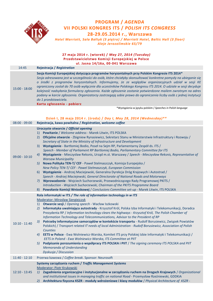 PROGRAM / AGENDA VII POLSKI KONGRES ITS / POLISH ITS CONGRESS 28-29.05.2014 r., Warszawa Hotel Marriott, Sala Bałtyk (3 piętro) / Marriott Hotel, Baltic Hall (3 floor) Aleje Jerozolimskie 65/79 14:45 15:00 - 18:00 27 maja 2014 r. (wtorek) / May 27, 2014 (Tuesday) Przedstawicielstwo Komisji Europejskiej w Polsce ul. Jasna 14/16a, 00-041 Warszawa Rejestracja / Registration Sesja Komisji Europejskiej dotycząca programów horyzontalnych przy Polskim Kongresie ITS 2014* Sesja adresowana jest w szczególności do osób, które chciałyby skonsultować konkretne pomysły na ubieganie się o środki z programów horyzontalnych. Informujemy, że ze względów organizacyjnych udział w sesji KE ograniczony został do 70 osób wyłącznie dla uczestników Polskiego Kongresu ITS 2014. O udziale w sesji decyduje kolejność nadsyłania formularzy zgłoszenia. Każde zgłoszenie zostanie potwierdzone mailem zwrotnym na adres podany w karcie zgłoszenia. Organizatorzy zastrzegają sobie prawo do ograniczenia liczby osób z jednej instytucji do 1 przedstawiciela. Karta zgłoszenia - pobierz *Wystąpienia w języku polskim / Speeches in Polish language 08:00 - 09:00 09:00 - 10:10 Dzień I, 28 maja 2014 r. (środa) / Day I, May 28, 2014 (Wednesday)** Rejestracja, kawa powitalna / Registration, welcome coffee Uroczyste otwarcie / Official opening 1) Powitanie / Welcome address - Marek Litwin, ITS POLSKA 2) Oficjalne otwarcie - Zbigniew Rynasiewicz, Sekretarz Stanu w Ministerstwie Infrastruktury i Rozwoju / Secretary of State in the Ministry of Infrastructure and Development 3) Wystąpienie - Bartłomiej Bodio, Poseł na Sejm RP, Parlamentarny Zespół ds. ITS / Speech - Member of Parliament RP Bartlomiej Bodio, Parliamentary Committee for ITS 4) Wystąpienie - Mieczysław Reksnis, Urząd m.st. Warszawy / Speech - Mieczysław Reksnis, Representative of Warsaw Municipality 5) Nowa Polityka TEN-T/ CEF - Paweł Stelmaszczyk, Komisja Europejska / New Policy TEN-T/ CEF - Pawel Stelmaszczyk, European Commission 6) Wystąpienie - Andrzej Maciejewski, Generalna Dyrekcja Dróg Krajowych i Autostrad / Speech - Andrzej Maciejewski, General Directorate of National Roads and Motorways 7) Wprowadzenie - Wojciech Suchorzewski, Przewodniczącego Rady Programowej PKITS / Introduction - Wojciech Suchorzewski, Chairman of the PKITS Programme Board 8) Powołanie Komisji Wnioskowej / Conclusions Committee set-up - Marek Litwin, ITS POLSKA 10:10 - 11:40 Rola informatyki w ITS / The role of information technology in w ITS Moderator: Mirosław Siergiejczyk 1) Otwarcie sesji / Opening speech - Wacław Iszkowski 2) Informatyka uwalniająca autostrady - Krzysztof Król, Polska Izba Informatyki i Telekomunikacji, Doradca Prezydenta RP / Information technology clears the highways - Krzysztof Król, The Polish Chamber of Information Technology and Telecommunications, Advisor to the President of RP 3) Potrzeby informatyczne samorządów w kontekście transportu - Rudolf Borusiewicz, Związek Powiatów Polskich) / Transport related IT needs of local Administration - Rudolf Borusiewicz, Association of Polish Counties 4) EETS w Polsce - Ewa Wolniewicz-Warska, Komitet ITS przy Polskiej Izbie Informatyki i Telekomunikacji / EETS in Poland - Ewa Wolniewicz-Warska, ITS Committee at PIIT 5) Podpisanie porozumienia o współpracy ITS POLSKA i PIIT / The signing ceremony ITS POLSKA and PIIT Memoranda of Understanding Dyskusja / Discussion 11:40 - 12:10 Przerwa kawowa / Coffee break. Sponsor: Neurosoft 12:10 - 13:45 Systemy zarządzania ruchem / Traffic Management Systems Moderator: Piotr Krukowski 1) Zagadnienia organizacyjne i instytucjonalne w zarządzaniu ruchem na Drogach Krajowych / Organizational and institutional issues in managing traffic on national Road - Przemysław Rzeźniewski, GDDKiA 2) Architektura fizyczna KSZR - moduły wdrożeniowe i klasy modułów / Physical Architecture of KSZR - implementation modules and classes of implementation modules - Andrzej Kobuszewski, GDDKIA 3) Problematyka realizacji projektów ITS na przykładzie projektu Zintegrowany System Sterowania Ruchem w Małopolsce realizowanego przez ZDW w Krakowie / The issue of implementation of ITS projects by example of Integrated Traffic Control System in Malopolska region - implemented by District Road Management in Krakow - Patryk Zakrzewski, ZDW Kraków 4) System Zarządzania Ruchem pozamiejskim / Non urban traffic management systems - Przemyslaw Staśkowiak, Kapsch 5) Wdrożenie działań priorytetowych określonych w Dyrektywie 2010/40/UE / Implementation of priority actions set out in Directive 2010/40/UE - Robert Trojanek vel Trojanowski, Krzysztof Modelewski, GDDKIA 6) Realizacja Krajowego Centrum Zarządzania Ruchem i Informacji w Republice Czeskiej / Implementation of the National Traffic Management and Information Center in the Czech Republic - Josef Havaš, VARS Brno Dyskusja / Discussion 13:45 - 14:45 Lunch. Sponsor: Kapsch 14:45 - 15:45 Technologie ITS - ochrona infrastruktury i środowiska naturalnego / ITS in infrastructure and environment protection Moderator: Tomasz Kamiński 1) Zastosowanie sieci sensorycznych, opartych na skanerach Bluetooth&WiFi w ITS / Application of sensor networks based on Bluetooth&WiFi scanners - Piotr Krukowski, Qumak 2) Kontrola ruchu pojazdów ponadnormatywnych redukcją kosztów utrzymania dróg / Strict control of oversized vehicles influencing road maintenance costs - Radosław Borcon, Neurosoft 3) Wykorzystanie technologii ITS zarządzania ruchem w ochronie środowiska / ITS Traffic Management and Environmental Impacts - Karsten McFarland, PTV Dyskusja / Discussion 15:45 - 16:45 Wspólne Europejskie Niebo - nowe wyzwania dla zarządzania ruchem lotniczym / Single European Sky - new challenges for air traffic management Moderator: Tomasz Balcerzak 1) Program SESAR jako akcelerator rozwoju technologicznego w zarządzaniu ruchem lotniczym / The SESAR program as an accelerator of technological development in air traffi