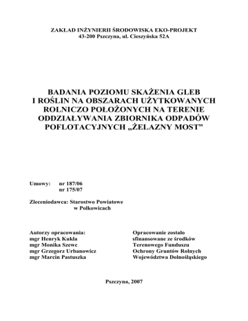 ZAKŁAD INśYNIERII ŚRODOWISKA EKO-PROJEKT 43-200 Pszczyna, ul. Cieszyńska 52A BADANIA POZIOMU SKAśENIA GLEB I ROŚLIN NA OBSZARACH UśYTKOWANYCH ROLNICZO POŁOśONYCH NA TERENIE ODDZIAŁYWANIA ZBIORNIKA ODPADÓW POFLOTACYJNYCH „śELAZNY MOST” Umowy: nr 187/06 nr 175/07 Zleceniodawca: Starostwo Powiatowe w Polkowicach Autorzy opracowania: mgr Henryk Kukla mgr Monika Szewc mgr Grzegorz Urbanowicz mgr Marcin Pastuszka Opracowanie zostało sfinansowane ze środków Terenowego Funduszu Ochrony Gruntów Rolnych Województwa Dolnośląskiego Pszczyna, 2007 SPIS TREŚCI 1. 2. 3. 4. 5. WSTĘP...........................................................................................................3 CEL I ZAKRES OPRACOWANIA...............................................................4 WARUNKI KLIMATYCZNE.......................................................................6 CHARAKTERYSTYKA GLEB....................................................................7 POBÓR PRÓB DO BADAŃ........................................................................10 5.1. Próby glebowe.....................................................................................10 5.2. Próby roślinne......................................................................................11 6. ZAKRES ANALITYCZNY I METODYKA BADAŃ.................................12 6.1. Metodyka badań gleb...........................................................................12 6.2. Metodyka badań roślin.........................................................................12 7. WYNIKI BADAŃ GLEB..............................................................................13 7.1. Skład granulometryczny......................................................................13 7.2. Odczyn gleb.........................................................................................14 7.3. Metale cięŜkie w glebie........................................................................16 7.3.1. Kryteria oceny zanieczyszczenia gleb metalami cięŜkimi..............16 7.3.2. Miedź całkowita..............................................................................20 7.3.3. Kadm całkowity..............................................................................25 7.3.4. Ołów całkowity...............................................................................29 7.3.5. Cynk całkowity...............................................................................33 7.3.6. Rtęć całkowita.................................................................................37 7.3.7. Arsen całkowity..............................................................................39 7.3.8. Porównanie wyników badań gleb (zawartość Cu, Cd, Pb, Zn) dla dwóch okresów badań – 2002 rok i 2007 rok....................................41 7.4. Zawartość siarki w glebie....................................................................50 7.4.1. Kryteria oceny zawartości siarki siarczanowej...............................50 7.4.2. Zawartość siarki siarczanowej........................................................51 7.5. Wielopierścieniowe węglowodory aromatyczne w glebie...................55 7.6. Radioaktywność gleb...........................................................................58 7.7. Zasolenie gleb......................................................................................61 7.8. Zawartość przyswajalnych form miedzi i cynku.................................64 7.8.1. Kryteria oceny zawartości przyswajalnych form miedzi i cynku...64 7.8.2. Zawartość przyswajalnej miedzi.....................................................65 7.8.3. Zawartość przyswajalnego cynku...................................................70 8. WYNIKI BADAŃ ROŚLIN..........................................................................75 8.1. Kryteria oceny zanieczyszczenia roślin metalami cięŜkimi................75 8.1.1. Zawartość miedzi............................................................................77 8.1.2. Zawartość kadmu............................................................................81 8.1.3. Zawartość ołowiu............................................................................86 8.1.4. Zawartość cynku.............................................................................91 8.1.5. Zawartość rtęci................................................................................96 1 8.1.6. Zawartość arsenu..........................................................................100 8.2. Zawartość siarki w roślinach..............................................................102 8.2.1. Kryteria oceny zawartości siarki w roślinach...............................102 8.2.2. Zawartość siarki............................................................................102 9. OCENA PRZESTRZENNEGO ODDZIAŁYWANIA ZBIORNIKA „śELAZNY MOST” NA GLEBY I ROŚLINY..........................................107 9.1. Analiza występowania metali w glebach w funkcji odległości od zbiornika osadów poflotacyjnych oraz w zaleŜności od właściwości gleb.....................................................................................................107 9.2. Analiza występowania metali w wybranych gatunkach roślin w zaleŜności od właściwości gleb oraz odległości od zbiornika osadów poflotacyjnych....................................................................................112 10.PODSUMOWANIE – WNIOSKI................................................................118 11.LITERATURA.............................................................................................124 12.ZAŁĄCZNIKI 12.1. Zestaw 1 – Lokalizacja poboru prób glebowych i roślinnych 12.2. Zestaw 2 – Wyniki oznaczeń fizyko – chemicznych 12.3. Zestaw 3 – Zawartość przyswajalnych form miedzi, cynku i siarki siarczanowej 12.4. Zestaw 4 – Zawartość metali cięŜ