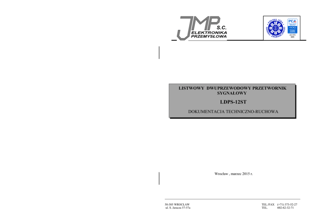 LISTWOWY DWUPRZEWODOWY PRZETWORNIK SYGNAŁOWY LDPS-12ST DOKUMENTACJA TECHNICZNO-RUCHOWA Wrocław , marzec 2015 r. 50-305 WROCŁAW ul. S. Jaracza 57-57a TEL./FAX (+71) 373-52-27 TEL. 602-62-32-71 str.2 SPIS TREŚCI 1.OPIS TECHNICZNY..............................................................................................................3 1.1.PRZEZNACZENIE I FUNKCJA............................................................................................................3 1.2.DANE TECHNICZNE.......................................................................................................................3 1.3.WARUNKI STOSOWANIA. ..............................................................................................................5 1.4.OPIS BUDOWY I DZIAŁANIA............................................................................................................5 2.INSTRUKCJA MONTAŻU I EKSPLOATACJI.................................................................5 2.1.INSTRUKCJA ODBIORU...................................................................................................................5 2.2.ZALECENIA MONTAŻOWE...............................................................................................................6 2.3.NAPRAWY I URUCHOMIENIE...........................................................................................................6 2.4.WARUNKI BEZPIECZEŃSTWA..........................................................................................................6 3.PRZECHOWYWANIE I TRANSPORT...............................................................................6 3.1.PRZECHOWYWANIE......................................................................................................................6 3.2.TRANSPORT................................................................................................................................7 4.WYKAZ RYSUNKÓW...........................................................................................................7 PRODUCENT ZASTRZEGA SOBIE PRAWO WPROWADZANIA ZMIAN (NIE POWODUJĄCYCH POGORSZENIA PARAMETRÓW EKSPLOATACYJNYCH I METROLOGICZNYCH URZĄDZEŃ) BEZ JEDNOCZESNEGO UAKTUALNIANIA TREŚCI DOKUMENTACJI TECHNICZNO-RUCHOWEJ. LDPS-12 str.3 1.OPIS TECHNICZNY. 1.1.Przeznaczenie i funkcja. Listwowy Dwuprzewodowy Przetwornik Sygnałowy (separator) LDPS-12 jest przeznaczony do pracy w układach automatycznej regulacji wszędzie tam, gdzie jest wymagane oddzielenie galwaniczne sygnału wejściowego bez dodatkowego zasilania, w pętli sygnału wejściowego. Przetwornik jest zasilany wejściowym sygnałem prądowym 4...20mA. Separator LDPS-12 posiada oddzielenie galwaniczne WE-WY. Separator LDPS-12 ma możliwość wykonania z wyjściami 0...5mA, lub 4...20mA. Dopuszcza się możliwość wykonania separatora z innymi sygnałami wyjściowymi. Rys.1.Listwowy uniwersalny przetwornik sygnałowy LDPS-12 - wymiary. 1.2.Dane techniczne. 1.2.1.Dane wejściowe: − sygnał wejściowy − napięcie na wejściu - 4...20mA - ≤ 2.5V + Iwy x R (nie mniej niż 4,5V)L 1.2.2.Dane wyjściowe: − sygnał wyjściowy (do wyboru) - 0...5mA, 4...20mA LDPS-12 str.4 − rezystancja obciążenia (odpowiednio) - 0...500Ω (wy prądowe) 1.2.3.Oddzielenie galwaniczne: − − odporność na przebicie (test) - transformator - napięcie 1.5kV AC 50Hz 1min, 1.2.4.Charakterystyka dynamiczna − pasmo przenoszenia - 5Hz (3dB) 1.2.5.Błędy przetwarzania: − − − − − − błąd podstawowy wpływ zmian temperatury wpływ zmian rez. obciążenia wpływ zakłóceń szeregowych 50Hz wpływ zakłóceń równoległych 220V wpływ zmian napięcia zasilania - ≤±0.16% ≤±0.1%/10°C ≤±0.1%/100Ω ≤±0.1% ≤±0.1% ≤±0.1% - 5°C...+60°C, 30...80%, 80...120kPa, 0...400A/m, do 2g, dowolne, dowolna, brak składników agresywnych, 15min, 1.2.6.Warunki normalne użytkowania: − − − − − − − − − temperatura otoczenia wilgotność względna ciśnienie atmosferyczne pole magnetyczne stałe i zmienne wibracje sinusoidalne (w zakresie 5...80Hz) zapylenie pozycja pracy koncentracja składników czynnych w atmosferze czas nagrzewania 1.2.7.Graniczne warunki transportu i przechowywania: − temperatura otoczenia − wilgotność względna − udary - 0...+70°C, - do 95% przy 40°C, - do 10g, 10ms. 1.2.8.Obudowa: − typ − wymiary − stopień ochrony - złączkowa, - zgodnie z rys. 1, - IP 20, 1.2.9. Masa − - 0.1kg. LDPS-12 str.5 1.2.10.Oznaczenia. Oznaczeniem Listwowego Dwuprzewodowego Przetwornika Sygnałowego jest symbol LDPS-12ST-1X LDPS – 12ST - 1X WYJŚCIE 2 – 4...20mA 3 - 0...5mA PRZYKŁAD OZNACZENIA: LDPS-12-12, co oznacza: − Listwowy Dwuprzewodowy Przetwornik Sygnałowy LDPS-12-12, − zasilanie sygnałem 4...20mA (wejściowym), − sygnał wyjściowy 4...20mA, 1.3.Warunki stosowania. Warunki stosowania określa niniejsza DTR. 1.4.Opis budowy i działania. Wszystkie elementy układu elektronicznego Listwowego Dwuprzewodowego Przetwornika Sygnałowego LDPS-12 zmontowane są na płytce drukowanej. Do płytki są również przylutowane zaciski. Całość jest zmontowana w obudowie listwowej z tworzywa sztucznego. Układ elektryczny urządzenia składa się z: − transformatora separującego, − układu wyjściowego , − przetwornicy zasilającej. Dodatkowo przetwornik LDPS-12 posiada trymery umożliwiające strojenie układu dostępne od czoła obudowy. LDPS-12 str.6 2.NSTRUKCJA MONTAŻU I EKSPLOATACJI. 2.1.Instrukcja odbioru. Podstawą odbioru i przekazania wyrobu do eksploatacji są Wymagania techniczne WT-97/JMP-010 "Listwowy Dwuprzewodowy Przetwornik Sygnałowy LDPS-12". 2.2.Zalecenia montażowe. Listwowe Dwuprzewodowe Przetworniki Sygnałowe należy eksploatować określonych w pkt.1.2.6. niniejszej DTR. Układ połączeń zacisków oraz typowy układ pracy przedstawiono na rys.2. Obudowa listwowa separatora LDPS-12 umożliwia montaż na listwach typu: − TS-32 (EN 50 035) − TS-3