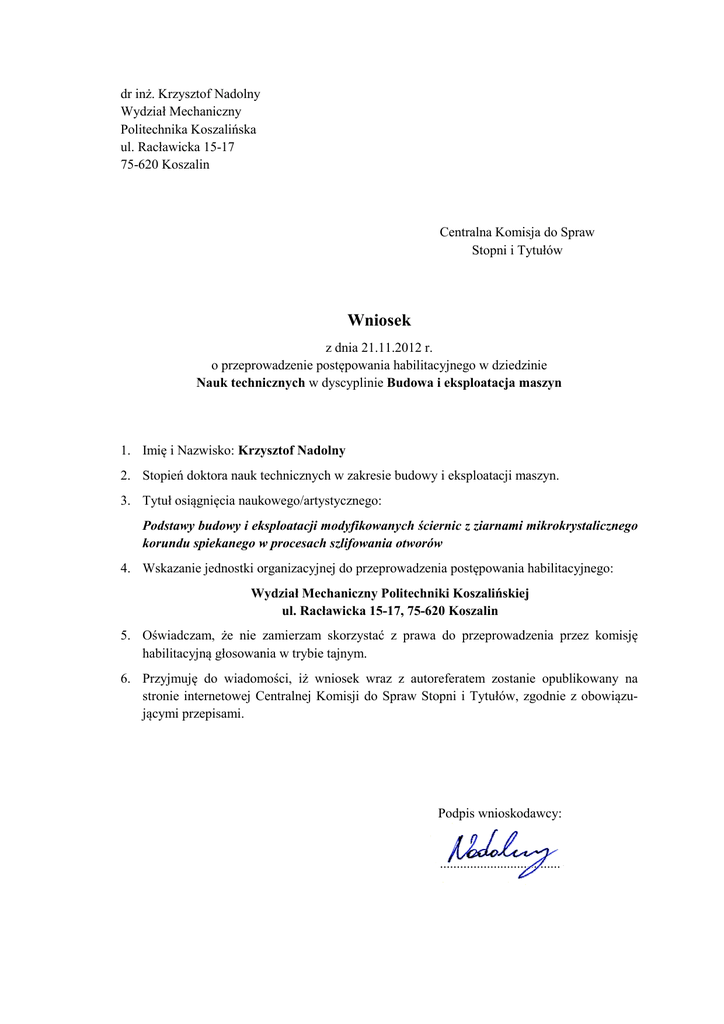 dr inż. Krzysztof Nadolny Wydział Mechaniczny Politechnika Koszalińska ul. Racławicka 15-17 75-620 Koszalin Centralna Komisja do Spraw Stopni i Tytułów Wniosek z dnia 21.11.2012 r. o przeprowadzenie postępowania post powania habilitacyjnego w dziedzinie Nauk technicznych w dyscyplinie Budowa i eksploatacja maszyn 1. Imię i Nazwisko: Krzysztof Nadolny 2. Stopień doktora nauk technicznych w zakresie budowy i eksploatacji maszyn. 3. Tytuł osiągnięcia ęcia naukowego/artystycznego: Podstawy budowy i eksploatacji modyfikowanych ściernic z ziarnami mikrokrystalicznego korundu spiekanego w procesach szlifowania otworów 4. Wskazanie jednostki organizacyjnej do przeprowadzenia postępowania postępowania habilitacyjnego: Wydział Mechaniczny Politechniki Koszalińskiej Koszalińskiej ul. Racławicka 15-17, 75-620 Koszalin 5. Oświadczam, że nie zamierzam skorzysta skorzystać z prawa do przeprowadzenia przez komisj komisję habilitacyjną głosowania w trybie tajnym. 6. Przyjmuję do wiadomoś wiadomości, iż wniosek wraz z autoreferatem zostanie opublikowany na stronie internetowej Centralnej Komisji do Spraw Spraw Stopni i Tytułów, zgodnie z obowiązuobowi jącymi przepisami. Podpis wnioskodawcy: .................................... Załączniki: 1. 2. 3. 4. 5. 6. 7. 8. 9. 10. 11. 12. 13. 14. 15. 16. 17. 18. 19. 20. 21. 22. 23. 24. 25. 26. 27. 28. Dyplom doktora nauk technicznych Autoreferat z wykazem publikacji Autoreferat z wykazem publikacji w wersji angielskiej Wykaz publikacji, patentów i zgłoszeń patentowych z określeniem procentowego wkładu w autorstwo Wykaz publikacji, patentów i zgłoszeń patentowych z określeniem procentowego wkładu w autorstwo w wersji angielskiej Monografia pt.: Podstawy budowy i eksploatacji modyfikowanych ściernic z ziarnami mikrokrystalicznego korundu spiekanego w procesach szlifowania otworów Wykaz cytowań według Thomson Reuters® Web of Knowledge® z dnia 15.11.2012 Wykaz cytowań według Elsevier® Scopus® z dnia 15.11.2012 Wykaz cytowań według Google Scholar® z dnia 15.11.2012 Opis patentowy PL 204902 Opis patentowy PL 209013 Opis patentowy PL 209014 Potwierdzenie powołania na funkcję promotora pomocniczego Zaświadczenie o ukończeniu studiów doktoranckich Świadectwo ukończenia podyplomowego studium pedagogicznego Dyplom magistra inżyniera kierunku Mechanika i Budowa Maszyn Zaświadczenie o wykonywaniu obowiązków asystenta stażysty Opinia dotycząca współpracy z Instytutem Zaawansowanych Technologii Wytwarzania w Krakowie Opinia dotycząca współpracy z Zakładem Wytwarzania Artykułów Ściernych Andre Abrasive Articles Robert Andre w Kole Potwierdzenie stażu naukowego w VSB-Technical University of Ostrava Potwierdzenie stażu naukowego w Technical University of Košice Opinia śp. Prof. dr inż. dr h.c. Kazimierza E. Oczosia Nagroda Komitetu Naukowego XXXIII Naukowej Szkoły Obróbki Ściernej Nagroda indywidualna rektora Nagroda zespołowa Środkowopomorskiej Rady NOT Nagroda Komitetu Naukowego XXXV Naukowej Szkoły Obróbki Ściernej Dane kontaktowe Dwa nośniki CD z elektroniczną wersją wniosku wraz z załącznikami