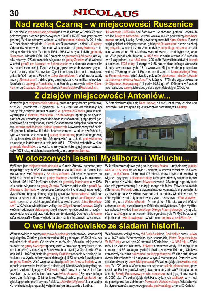 30 Nad rzeką Czarną - w miejscowości Ruszenice Ruszenice są miejscowością sołecką nad rzeką Czarną w Gminie Żarnów, położoną przy drogach powiatowych nr 1504E i 1505E oraz przy drodze gminnej. W skład sołectwa wchodzi wieś Ruszenice-Kolonia. W 2013 roku w Ruszenicach mieszkało 101 osób, a w Ruszenicach - Kolonii - 33 osoby. Od czasów zaborów do 1954 roku, wieś należała do gminy Machory z siedzibą w Marcinkowie. W latach 1954 - 1959 wieś była siedzibą gromady Ruszenice, w latach 1960 - 1972 należała do gromady Skórkowice, a w wyniku reformy 1973 roku została włączona do gminy Żarnów. Wieś wchodzi w skład parafii św. Łukasza w Skórkowicach w dekanacie żarnowskim i w diecezji radomskiej. Dzieje wsi sięgają czasów średniowiecza, gdy należała do kasztelanii żarnowskiej. O jej istnieniu pisał Jan Łaski, arcybiskup gnieźnieński i prymas Polski w „Liber Beneficjorum”. Wieś nosiła wtedy nazwę „Ruschinicze”, a dziesięcinę z niej opłacano kanonii kurzelowskiej. Należała do Jadwigi z Ruschinicz, a później do zamożnych rodów Giżyckich herbu Gozdawa, Drzewieckich oraz Russińskich vel Russieńskich. 16 września 1655 roku pod Żarnowem - w czasach „potopu” - doszło do wielkiej bitwy ze Szwedami, w której wojska polskie pod wodzą Jana Kazimierza poniosły klęskę. Armią szwedzką dowodził Karol Gustaw. Resztki wojsk polskich uciekły na zachód, gdzie pod Ruszenicami doszło do zbrojnej potyczki, w której rozproszono oddziały pospolitego ruszenia, a okoliczne wsie spalono. Mieszkańców wymordowano, a ich dobytek rozgrabiono. Wieś jednak odbudowano, w 1827 roku mieszkało w niej 292 włościan (w 47 zagrodach), a w 1880 roku - 296 osób. We wsi istniał dwór i folwark o obszarze 1725 mórg (1 morga = 0,56 ha), w skład którego wchodziło 5 budynków murowanych i 13 drewnianych. Miejscowi chłopi gospodarowali na 273 morgach ziemi. Ruszenice zaliczano do Staropolskiego Okręgu Przemysłowego. Wieś słynęła z pokładów piaskowca, młynów i „fryszerki żelaznej z dwiema kuźnicami”, w której w 1875 roku wyprodukowano 3400 pudów „żelaza kutego” (1 pud = 16,38 kg). W 1920 roku w Ruszenicach założono szkołę, istniejącą do lat siedemdziesiątych XX wieku. Z dziejów miejscowości Antoniów... Antoniów jest miejscowością sołecką, położoną przy drodze powiatowej W Antoniowie znajduje się Dom Ludowy, od wielu lat służący lokalnej sponr 3125E (Marcinków - Grębenice). W 2013 roku we wsi mieszkały 124 łeczności. Wieś znajduje się w sąsiedztwie parafialnej wsi Chełsty. osoby. Miejscowość została założona w I połowie XIX wieku, jako kolonia, wynikająca z kontraktu wieczysto - dzierżawnego, opartego na czynszu pieniężnym, zawartego przez dziedzica z włościanami, pragnącymi gospodarować na swej własnej ziemi. Gospodarstwa chłopskie założono na tzw. karczunkach leśnych i polach uprawnych. Nowo założoną wieś zasiedlili jednak bardzo światli ludzie, bowiem wkrótce - w latach sześćdziesiątych XIX wieku - założono tutaj szkołę elementarną, przeniesioną później do sąsiedniej wsi Chełsty. Do 1954 roku, wieś należała do gminy Machory z siedzibą w Marcinkowie, a w latach 1954 - 1972 wieś wchodziła w skład gromady Marcinków, a w wyniku reformy administracyjnej, przeprowadzonej w 1973 roku, została ostatecznie włączona do gminy Żarnów. W otoczonych lasami Myśliborzu i Widuchu... Myślibórz jest miejscowością sołecką w Gminie Żarnów, położoną przy drogach gminnych. W 2013 roku we wsi mieszkało 97 osób. W skład sołectwa wchodzi wieś Widuch z 32 mieszkańcami. Od czasów zaborów do 1954 roku, wieś należała do gminy Machory z siedzibą w Marcinkowie. W latach 1954-1972 Myślibórz należał do gromady Marcinków, a w 1973 roku został włączony do gminy Żarnów. Wieś wchodzi w skład parafii św. Mikołaja w Żarnowie w dekanacie żarnowskim i w diecezji radomskiej. Myślibórz ma bogatą historię, sięgającą czasów średniowiecza. Wieś należała do kasztelanii żarnowskiej. O jej istnieniu pisali Jan Długosz i Jan Łaski - prymas i arcybiskup gnieźnieński w swoim dziele „Liber Beneficjorum”. W XV wieku właścicielem wsi był Jan Giżycki herbu Gozdawa. Część włościan oddawała dziesięcinę arcybiskupom gnieźnieńskim, a część prebendzie turebskiej przy katedrze sandomierskiej. Dochody z folwarku trafiały do parafii w Żarnowie i szły na utrzymanie miejscowych wikariuszy. W Myśliborzu znajdowały się pokłady rudy żelaza i kamieniołomy piaskowca. W 1827 roku we wsi było 12 domów, w których mieszkało 163 włościan, a w 1887 roku - 25 domów i 175 mieszkańców. Liczba ludności byłaby większa, gdyby nie epidemie cholery, które powodowały śmierć chłopów. Pod koniec XIX wieku, obszar folwarku wynosił 1253 morgi, a grunty włościan miały powierzchnię 214 mórg (1 morga = 0,56 ha). Folwark należał do dóbr barona Fraenkla z rodu przemysłowców warszawskich pochodzenia żydowskiego, a w XX wieku dwór należał do rodziny Chmielewskich. Do dóbr Myślibórz należały kolonie wieczysto - dzierżawne: Władysławów 310 mórg oraz Widuch (Buhaj) - 74 morgi. W 1918 roku we wsi Widuch założono szkołę, przeniesioną w 1925 roku do Myśliborza. Rejon Myśliborza wchodził w skład Staropolskiego Okręgu Przemysłowego i słynął z lasów oraz złóż glin ceramicznych i iłów ogniotrwałych. W Myśliborzu znajduje się mała świetlica wiejska, a w Widuchu - pomnik ku czci 25 pp AK. O wsi Wierzchowisko ze śladami historii... Wierzchowisko to znana miejscowość sołecka w południowo - wschodniej części gminy Żarnów, położona wzdłuż dróg gminnych. W 2013 roku we wsi mieszkało 96 osób. Od czasów zaborów do 1954 roku, miejscowość należała do gminy Sworzyce (początkowo w powiecie opoczyńskim, a potem koneckim), z siedzibą w Soczówkach, a później w Grabkowie. W latac