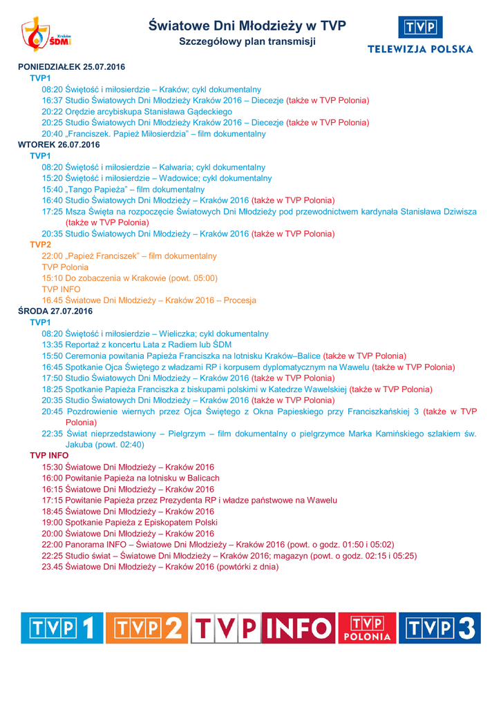 Światowe Dni Młodzieży w TVP Szczegółowy plan transmisji PONIEDZIAŁEK 25.07.2016 TVP1 08:20 Świętość i miłosierdzie – Kraków; cykl dokumentalny 16:37 Studio Światowych Dni Młodzieży Kraków 2016 – Diecezje (także w TVP Polonia) 20:22 Orędzie arcybiskupa Stanisława Gądeckiego 20:25 Studio Światowych Dni Młodzieży Kraków 2016 – Diecezje (także w TVP Polonia) 20:40 „Franciszek. Papież Miłosierdzia” – film dokumentalny WTOREK 26.07.2016 TVP1 08:20 Świętość i miłosierdzie – Kalwaria; cykl dokumentalny 15:20 Świętość i miłosierdzie – Wadowice; cykl dokumentalny 15:40 „Tango Papieża” – film dokumentalny 16:40 Studio Światowych Dni Młodzieży – Kraków 2016 (także w TVP Polonia) 17:25 Msza Święta na rozpoczęcie Światowych Dni Młodzieży pod przewodnictwem kardynała Stanisława Dziwisza (także w TVP Polonia) 20:35 Studio Światowych Dni Młodzieży – Kraków 2016 (także w TVP Polonia) TVP2 22:00 „Papież Franciszek” – film dokumentalny TVP Polonia 15:10 Do zobaczenia w Krakowie (powt. 05:00) TVP INFO 16.45 Światowe Dni Młodzieży – Kraków 2016 – Procesja ŚRODA 27.07.2016 TVP1 08:20 Świętość i miłosierdzie – Wieliczka; cykl dokumentalny 13:35 Reportaż z koncertu Lata z Radiem lub ŚDM 15:50 Ceremonia powitania Papieża Franciszka na lotnisku Kraków–Balice (także w TVP Polonia) 16:45 Spotkanie Ojca Świętego z władzami RP i korpusem dyplomatycznym na Wawelu (także w TVP Polonia) 17:50 Studio Światowych Dni Młodzieży – Kraków 2016 (także w TVP Polonia) 18:25 Spotkanie Papieża Franciszka z biskupami polskimi w Katedrze Wawelskiej (także w TVP Polonia) 20:35 Studio Światowych Dni Młodzieży – Kraków 2016 (także w TVP Polonia) 20:45 Pozdrowienie wiernych przez Ojca Świętego z Okna Papieskiego przy Franciszkańskiej 3 (także w TVP Polonia) 22:35 Świat nieprzedstawiony – Pielgrzym – film dokumentalny o pielgrzymce Marka Kamińskiego szlakiem św. Jakuba (powt. 02:40) TVP INFO 15:30 Światowe Dni Młodzieży – Kraków 2016 16:00 Powitanie Papieża na lotnisku w Balicach 16:15 Światowe Dni Młodzieży – Kraków 2016 17:15 Powitanie Papieża przez Prezydenta RP i władze państwowe na Wawelu 18:45 Światowe Dni Młodzieży – Kraków 2016 19:00 Spotkanie Papieża z Episkopatem Polski 20:00 Światowe Dni Młodzieży – Kraków 2016 22:00 Panorama INFO – Światowe Dni Młodzieży – Kraków 2016 (powt. o godz. 01:50 i 05:02) 22:25 Studio świat – Światowe Dni Młodzieży – Kraków 2016; magazyn (powt. o godz. 02:15 i 05:25) 23.45 Światowe Dni Młodzieży – Kraków 2016 (powtórki z dnia) CZWARTEK 28.07.2016 TVP1 09:25 Wizyta Papieża Franciszka na Jasnej Górze (także w TVP Polonia) 10:25 Msza Święta z udziałem Ojca Świętego z okazji 1050. Rocznicy Chrztu Polski (także w TVP Polonia) 12:30 Świętość i miłosierdzie – Centrum Jana Pawła II 15:25 Kuchnia papieska 16:00 Studio Światowych Dni Młodzieży – Kraków 2016 (także w TVP Polonia) 16:50 Ceremonia Powitania Papieża Franciszka na krakowskich Błoniach (także w TVP Polonia) 20:25 Studio Światowych Dni Młodzieży – Kraków 2016 (także w TVP Polonia) 20:35 Okno Papieskie – pozdrowienie wiernych przez Papieża Franciszka (także w TVP Polonia) TVP INFO 09:15 Światowe Dni Młodzieży – Kraków 2016 10:30 Transmisja Mszy Świętej z Jasnej Góry 12:30 Światowe Dni Młodzieży – Kraków 2016 16:30 Światowe Dni Młodzieży – Kraków 2016 17:30 Ceremonia powitania Papieża na Błoniach przez Kardynała Stanisława Dziwisza 18:00 Światowe Dni Młodzieży – Kraków 2016 22:00 Panorama Info – Światowe Dni Młodzieży – Kraków 2016 (powt. o godz. 01:50 i 05:00) 23:00 Studio świat – Światowe Dni Młodzieży – Kraków 2016; magazyn (powt. o godz. 02:15 i 05:25) 23.45 Światowe Dni Młodzieży – Kraków 2016 (powtórki z dnia) PIĄTEK 29.07.2016 TVP1 09:15 Studio Światowych Dni Młodzieży – Kraków 2016 (także w TVP Polonia) 09:20 Wizyta Papieża Franciszka na terenie Muzeum Auschwitz–Birkenau byłego niemieckiego obozu koncentracyjnego i zagłady (także w TVP Polonia) 11:20 Studio Światowych Dni Młodzieży – Kraków 2016 (także w TVP Polonia) 11:35 Świętość i miłosierdzie – Kraków 15:20 Kuchnia Papieska 15:50 Studio Światowych Dni Młodzieży – Kraków 2016 (także w TVP Polonia) 16:20 Papież Franciszek w Uniwersyteckim Szpitalu Dziecięcym w Prokocimiu (także w TVP Polonia) 17:50 Droga Krzyżowa z młodzieżą pod przewodnictwem Papieża Franciszka (także w TVP Polonia) 20:35 Studio Światowych Dni Młodzieży – Kraków 2016 (także w TVP Polonia) 20:45 Okno Papieskie – pozdrowienie wiernych (także w TVP Polonia) 23:11 „Tajemnice początków Polski – Krzyż i Korona” – dokument fabularyzowany 03:35 „Życie za życie. Maksymilian Kolbe” – film biograficzny TVP2 13:15 „Święta z sąsiedztwa. Joanna Beretta Molla” – film dokumentalny TVP Polonia 08:10 „Tango Papieża” – film dokumentalny Krzysztofa Żurowskiego TVP INFO 08:30 Światowe Dni Młodzieży – Kraków 2016 09:30 Papież w Muzeum Auschwitz–Birkenau 10:15 Światowe Dni Młodzieży – Kraków 2016 10:30 Papież w Muzeum Auschwitz–Birkenau 11:15 Światowe Dni Młodzieży – Kraków 2016 15:30 Światowe Dni Młodzieży – Kraków 2016 16:30 Wizyta Papieża w Uniwersyteckim Szpitalu Dziecięcym 17:00 Światowe Dni Młodzieży – Kraków 2016 18:00 Droga Krzyżowa 19:30 Światowe Dni Młodzieży – Kraków 2016 22:00 Panorama Info – Światowe Dni Młodzieży – Kraków 2016 (powt. o godz. 01:50 i 05:00) 23:00 Studio świat – Światowe Dni Młodzieży – Kraków 2016; magazyn (powt. o godz. 02:15 i 05:25) 23.45 Światowe Dni Młodzieży – Kraków 2016 (powtórki z dnia) SOBOTA 30.07.2016 TVP1 08:05 Wizyta Papieża Franciszka w Sanktuarium Miłosierdzia Bożego i Sanktuarium Jana Pawła II (także w TVP Polonia) 12:35 Studio Światowych Dni Młodzieży