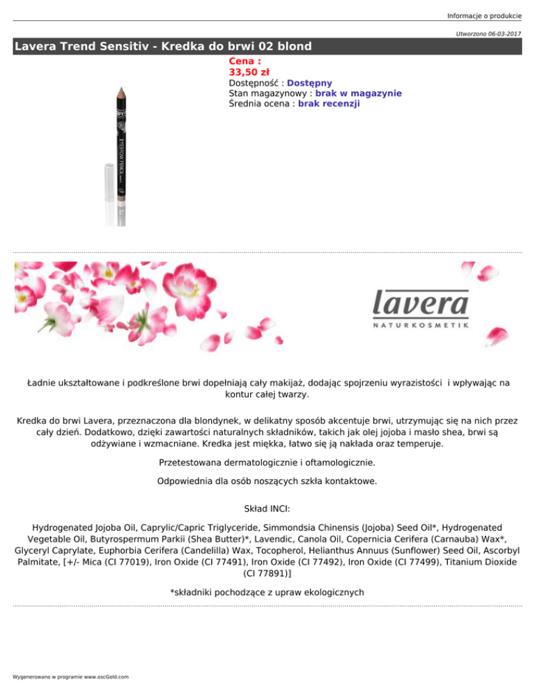 Informacje o produkcie Utworzono 06-03-2017 Lavera Trend Sensitiv - Kredka do brwi 02 blond Cena : 33,50 zł Dostępność : Dostępny Stan magazynowy : brak w magazynie Średnia ocena : brak recenzji Ładnie ukształtowane i podkreślone brwi dopełniają cały makijaż, dodając spojrzeniu wyrazistości i wpływając na kontur całej twarzy. Kredka do brwi Lavera, przeznaczona dla blondynek, w delikatny sposób akcentuje brwi, utrzymując się na nich przez cały dzień. Dodatkowo, dzięki zawartości naturalnych składników, takich jak olej jojoba i masło shea, brwi są odżywiane i wzmacniane. Kredka jest miękka, łatwo się ją nakłada oraz temperuje. Przetestowana dermatologicznie i oftamologicznie. Odpowiednia dla osób noszących szkła kontaktowe. Skład INCI: Hydrogenated Jojoba Oil, Caprylic/Capric Triglyceride, Simmondsia Chinensis (Jojoba) Seed Oil*, Hydrogenated Vegetable Oil, Butyrospermum Parkii (Shea Butter)*, Lavendic, Canola Oil, Copernicia Cerifera (Carnauba) Wax*, Glyceryl Caprylate, Euphorbia Cerifera (Candelilla) Wax, Tocopherol, Helianthus Annuus (Sunflower) Seed Oil, Ascorbyl Palmitate, [+/- Mica (CI 77019), Iron Oxide (CI 77491), Iron Oxide (CI 77492), Iron Oxide (CI 77499), Titanium Dioxide (CI 77891)] *składniki pochodzące z upraw ekologicznych Wygenerowano w programie www.oscGold.com