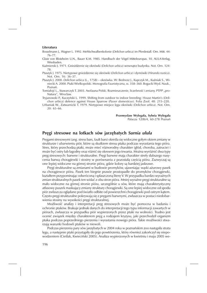 Literatura Bosselmann J., Wagner L. 1992. Mehlschwalbenkolonie (Delichon urbica) im Pferdestall. Orn. Mitt. 44: 76–77. Glutz von Blotzheim U.N., Bauer K.M. 1985. Handbuch der Vögel Mitteleuropas. 10. AULA-Verlag, Wiesbaden. Kaźmierski J. 1971. Gnieżdżenie się oknówki (Delichon urbica) wewnątrz budynku. Not. Orn. 124: 78. Ptaszyk J. 1975. Nietypowe gnieżdżenie się oknówki (Delichon urbica) i dymówki (Hirundo rustica). Not. Orn. 16: 36–37. Ptaszyk J. 2000. Delichon urbica (L., 1758) – oknówka. W: Bednorz J., Kupczyk M., Kuźniak S., Winiecki A. 2000. Ptaki Wielkopolski. Monografia Faunistyczna, ss. 358–360. Bogucki Wyd. Nauk., Poznań. Tomiałojć L., Stawarczyk T. 2003. Awifauna Polski. Rozmieszczenie, liczebność i zmiany. PTPP „proNatura”, Wrocław. Tryjanowski P., Kuczyński L. 1999. Shifting from outdoor to indoor breeding: House Martin’s (Delichon urbica) defence against House Sparrow (Passer domesticus). Folia Zool. 48: 215–220. Urbaniak W., Zatwarnicki T. 1979. Nietypowe miejsce lęgu oknówki (Delichon urbica). Not. Orn. 20: 65–66. Przemysław Wylegała, Sylwia Wylegała Palacza 120b/4, 60-278 Poznań Pręgi stresowe na lotkach sów jarzębatych Surnia ulula Pręgami stresowymi (ang. stress bars, fault bars) określa się widoczne gołym okiem zmiany w strukturze i ubarwieniu piór, które są skutkiem stresu ptaka podczas wyrastania tego pióra. Stres, który przechodzą ptaki, może mieć różnorodny charakter (głód, choroba, zatrucie) i może być ostry lub łagodny oraz różnić się okresem jego trwania. Można wyróżnić dwa typy pręg stresowych: barwne i strukturalne. Pręgi barwne mają charakter strefy słabszego nasycenia barwą chorągiewki i stosiny w porównaniu z pozostałą częścią pióra. Zazwyczaj są one lepiej widoczne na górnej stronie pióra, gdzie kolory są bardziej jaskrawe. Pręgi strukturalne są zmianami w budowie promyków, ujawniając wąski ażurowy pasek na chorągiewce pióra. Pasek ten biegnie prawie prostopadle do promyków chorągiewki, kształtem przypominając odwróconą i spłaszczoną literę V. W przypadku bardzo wyraźnych zmian strukturalnych pasek ten widać z obu stron pióra. Mniej wyraźne pręgi strukturalne są mało widoczne na górnej stronie pióra, szczególnie u sów, które mają charakterystyczny atłasowy puszek maskujący zmiany struktury chorągiewki. Są one lepiej widoczne od spodu piór zwłaszcza oglądane pod światło odbite od powierzchni chorągiewki pod ostrym kątem. Często pręgi strukturalne pokrywają się z pręgami barwnymi, zwłaszcza w postaci niedobarwienia stosiny na wysokości pręgi strukturalnej. Możliwość analizy i interpretacji pręg stresowych może być pomocna w badaniu i ochronie ptaków. Brakuje jednak danych do interpretacji tego typu informacji zawartych w piórach, zwłaszcza w przypadku piór wypierzonych przez ptaki na wolności. Trudno jest ocenić związek między charakterem pręg a rodzajem kryzysu, jaki przechodził organizm ptaka podczas poprzedniego pierzenia i wyrastania nowego pióra. Takie możliwości stwarzają warunki hodowli ptaków w niewoli. Podczas pierzenia pary sów jarzębatych w 2004 roku w poznańskim zoo nastąpiła strata lęgu, a następnie ptaki przystąpiły do jego powtórzenia, który również zakończył się niepowodzeniem (Cieślak, Kwieciński 2005). Analiza wypierzonych w kwietniu i maju 2005 we196 Fot. 1. Lotki pierwszorzędowe z lewego skrzydła samicy wypierzone do 2 czerwca 2005 r. Białymi kreskami obok piór zaznaczono wysokość położenia pręg barwnych na trzech wewnętrznych lotkach Phot. 1. Female left wing primaries moulted on 2 June 2005. White lines beside the feathers indicate the localization of the colour growth bars on three inner primaries wnętrznych lotek pierwszorzędowych (fot. 1) pozwoliła zidentyfikować na tych piórach pręgi stresowe spowodowane krytycznymi wydarzeniami, jakie dotknęły tę parę rok wcześniej. Do 13.05.2004, kiedy doszło do straty pierwszego lęgu, samica wypierzyła 3 wewnętrzne lotki pierwszorzędowe, a kolejne lotki już wyrastały od pewnego czasu: prawa i lewa p1 od 13 dni, p2 lewe od 12 dni, p2 prawe od 10 dni, a p3 od 3 dni. Na tych piórach stwierdzono wąskie strukturalne pręgi stresowe (fot. 2) i poniżej nich około 2 cm szerokości pręgi barwne (fot. 1). Trzy wewnętrzne lotki pierwszorzędowe z lewego skrzydła miały pręgi strukturalne w odległości od wierzchołka: p1 – 4,8 cm, p2 – 5,0 cm, p3 – 1,5 cm. Różnica w wysokości położenia pręg strukturalnych na obu lotkach p2 wynosi 11 mm (fot. 3), co odpowiada dwudniowej różnicy w dacie wypierzenia tych lotek. Występująca poniżej pręgi strukturalnej ok. 2 cm szerokości strefa jaśniejszego ubarwienia chorągiewek (zaznaczona na fot. 1) wskazuje na trwający około 4–5 dni po stracie lęgu okres niedoboru pigmentu we wzrastających piórach. W okresie 25.05–4.06.2004 samica złożyła 6 jaj w drugim powtórzonym lęgu. W tym okresie wyrastały górne połowy lotek pierwszorzędowych p4 i p5. Na tym odcinku tych dwóch lotek (od około połowy długości chorągiewki do wierzchołka) widoczne są po 3–4 pręgi strukturalne na górnej stronie pióra i ponad 10 drobnych pręg od spodu tych lotek (pręgi te były tak delikatne, że nie udało się przedstawić ich wyraźnie na fotografii). Częstotliwość tych pręg i ich położenie wskazują na zbieżność z okresem znoszenia powtórzonego zniesienia. 197 Fot. 2. Strukturalne pręgi stresowe na wewnętrznych lotkach pierwszorzędowych samicy. Białe kreski obok lotek, położone na przedłużeniu tych pręg, pomagają zlokalizować pręgi Phot. 2. The structural growth bars on the inner primaries in the female. The white lines beside the primaries, being an elongation of the bars, help to localize them Analiza lotek zrzuconych przez samca w sezonie 2005 pozwoliła stwierdzić tylko jedną delikatną (widoczną tylko od sp