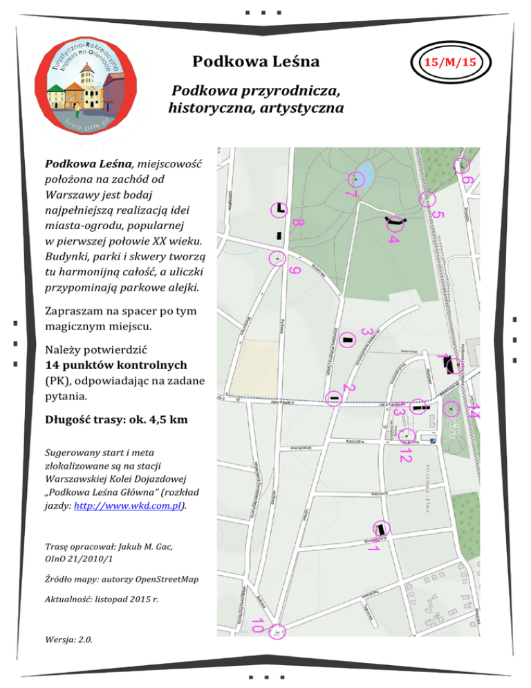 Podkowa'Leśna Podkowa'przyrodnicza,' historyczna,'artystyczna Podkowa'Leśna,"miejscowość" położona"na"zachód"od" Warszawy"jest"bodaj" najpełniejszą"realizacją"idei" miasta=ogrodu,"popularnej" w"pierwszej"połowie"XX"wieku." Budynki,"parki"i"skwery"tworzą" tu"harmonijną"całość,"a"uliczki" przypominają"parkowe"alejki."""""""""""""""""""" Zapraszam(na(spacer(po(tym( magicznym(miejscu.( Należy(potwierdzić((((((((((((((( 14'punktów'kontrolnych( (PK),(odpowiadając(na(zadane( pytania.( Długość'trasy:'ok.'4,5'km' " Sugerowany"start"i"meta" zlokalizowane"są"na"stacji" Warszawskiej"Kolei"Dojazdowej" „Podkowa"Leśna"Główna”"(rozkład" jazdy:"http://www.wkd.com.pl)." " Trasę"opracował:"Jakub"M."Gac,"""""""" OInO"21/2010/1" Źródło"mapy:"autorzy"OpenStreetMap" Aktualność:"listopad"2015"r. Wersja:"2.0." 15/M/15' ! Turystyczno1Rekreacyjna!Impreza!na!Orientację!(15/M/15)! PK#1# Budynek!stacji!WKD!z!pierwszej!połowy!XX!w.!W!dawnej!poczekalni!sympatyczna! kawiarnia!Wu<Cafe! PK#2# „Domek!numer!zero”!<!drewniany!parterowy!budynek!z!lat!70.!XIX!w.,!jeden!z! pierwszych!domów!letniskowych!Stanisławowa,!letniska!założonego!przez!Stanisława! Lilpopa.!Stanisławów!został!w!l.!20.!XX!w.!przekształcony!w!Podkowę!Leśną.! Jaki!jest!napis!z!tabliczki!na!latarni!bezpośrednio!przed!poczekalnią?! Co!obecnie!mieści!się!w!„Domku!numer!zero”?! PK#3# Drewniana,!bogato!dekorowana!willa,!pierwsza!rezydencja!Jarosława!i!Anny! Iwaszkiewiczów!w!Podkowie!Leśnej.!Dom!ten!zamieszkiwali!oni!w!latach!1922<1928,! później!przenieśli!się!do!willi!Stawisko,!gdzie!dziś!mieści!się!ich!muzeum.! Jaki!jest!adres!domu?! PK#4# Pałacyk!Kasyno!z!l.!20.!XX!w.,!siedziba!wielu!organizacji,!m.in.!Centrum!Kultury!! i!Inicjatyw!Obywatelskich.! Ile!słupów!wspiera!dach!nad!tarasem?! PK#5# Dolina!niewielkiego!cieku!Niwka,!droga!do!rezerwatu!„Parów!Sójek”! PK#6# Rezerwat!przyrody!„Parów!Sójek”.! PK#7# Staw!na!Niwce!w!parku!miejskim.! W!jaki!sposób!droga!przekracza!tory!kolejki!WKD?! Jakiego!koloru!są!barierki!mostka!nad!Niwką?! Ile!ławek!znajduje!się!nad!stawem?! PK#8# Zabytkowa!drewniana!willa!z!1928,!zaprojektowana!jako!pensjonat.!Obecnie! niszczejąca.! PK#9# Figura!Matki!Boskiej!u!zbiegu!ulic!Kwiatowej,!Parkowej!i!Bluszczowej,!ustawiona!! w!1925!roku!w!miejscu!pewnego!wydarzenia!istotnego!dla!historii!Podkowy!Leśnej.! Na!jaki!kolor!pomalowane!są!ściany!willi?! Jakie!to!wydarzenie?! PK#10# Obelisk!pamięci!żołnierzy!AK!walczących!w!czasie!drugiej!wojny!światowej!! w!okolicznych!lasach.! PK#11# Budynek,!w!którym!do!jesieni!2013!roku!mieściła!się!popularna!kawiarnia!artystyczna! „Milimoi”! PK#12# Kościół!św.!Krzysztofa!o!unikalnej!bryle!(charakterystyczne!rozwiązanie!„naw! wychodzących!na!zewnątrz”).!Znany!m.in.!z!pierwszych!w!Polsce!mszy!beatowych.! Jak!nazywała!się!kompania!AK!walcząca!w!rejonie!Podkowy?! Ile!ma!kondygnacji?! Jakie!zwierzęta!trzymane!są!w!klatce!na!tyłach!kościoła?! Budynki!usługowe!przy!głównej!ulicy!Podkowy!Leśnej,!ul.!Jana!Pawła!II.! PK#13# Supermarket!jakiej!marki!się!tutaj!znajduje?! PK#14# Park!Przyjaźni!Polsko<Węgierskiej,!w!nim!–!tablica!pamiątkowa,!upamiętniająca! stacjonujących!w!Podkowie!w!czasie!drugiej!wojny!światowej!węgierskich!żołnierzy,! którzy!potajemnie!wspierali!okoliczną!polską!partyzantkę.! W!którym!roku!została!odsłonięta!tablica?! ! ! Odpowiedzi!należy!przesłać!na!e3mail:[email protected]!lub!za!pomocą!formularza.! ! Przesłanie!odpowiedzi!oznacza!zgodę!na!umieszczenie!na!liście!osób,!które!przebyły!trasę!TRInO.! ! trino.pttk.pl! !!