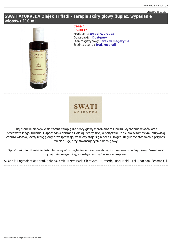 Informacje o produkcie Utworzono 06-03-2017 SWATI AYURVEDA Olejek Trifladi - Terapia skóry głowy (łupież, wypadanie włosów) 210 ml Cena : 35,00 zł Producent : Swati Ayurveda Dostępność : Dostępny Stan magazynowy : brak w magazynie Średnia ocena : brak recenzji Olej stanowi niezwykle skuteczną terapię dla skóry głowy z problemem łupieżu, wypadania włosów oraz przedwczesnego siwienia. Odpowiednio dobrane zioła ajurwedyjskie, w połączeniu z olejem sezamowym, odżywiają cebulki włosów, leczą skórę głowy oraz sprawiają, że włosy stają się mocne i lśniące. Regularne stosowanie przynosi również ulgę przy nawracających bólach głowy. Sposób użycia: Niewielką ilość olejku wylać w zagłębienie dłoni, rozetrzeć i wmasować w skórę głowy. Pozostawić przynajmniej na godzinę, a następnie umyć włosy szamponem. Składniki (Ingredients): Harad, Baheda, Amla, Neem Bark, Chirayata, Turmeric, Daru Haldi, Lal Chandan, Sesame Oil. Wygenerowano w programie www.oscGold.com