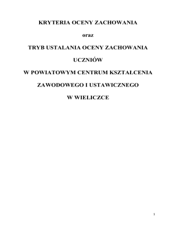 KRYTERIA OCENY ZACHOWANIA oraz TRYB USTALANIA OCENY ZACHOWANIA UCZNIÓW W POWIATOWYM CENTRUM KSZTAŁCENIA ZAWODOWEGO I USTAWICZNEGO W WIELICZCE 1 Ocenianie zachowania ucznia polega na rozpoznawaniu przez wychowawcę klasy, nauczycieli oraz uczniów danej klasy stopnia respektowania przez ucznia zasad współżycia społecznego i norm etycznych oraz obowiązków ucznia określonych w statucie szkoły. §1 Wychowawca klasy na początku każdego roku szkolnego informuje uczniów oraz ich rodziców (prawnych opiekunów) o warunkach i sposobie oraz kryteriach oceniania zachowania oraz o warunkach i trybie uzyskania wyższej niż przewidywana rocznej oceny klasyfikacyjnej zachowania oraz o skutkach ustalenia uczniowi nagannej rocznej oceny klasyfikacyjnej. §2 Oceny klasyfikacyjne z zajęć edukacyjnych nie mają wpływu na ocenę klasyfikacyjną zachowania. §3 Śródroczna i roczna ocena klasyfikacyjna zachowania uwzględnia w szczególności (Rozporządzenie MEN z dnia 30 kwietnia 2007 r.§ 15. 1.) 1. 2. 3. 4. 5. 6. 7. Wywiązywanie się z obowiązków ucznia; Postępowanie zgodne z dobrem społeczności szkolnej; Dbałość o honor i tradycje szkoły; Dbałość o piękno mowy ojczystej; Dbałość o bezpieczeństwo i zdrowie własne oraz innych osób; Godne, kulturalne zachowanie się w szkole i poza nią; Okazywanie szacunku innym osobom. §4 SZCZEGÓŁOWE KRYTERIA OCENY ZACHOWANIA UCZNIÓW Zasady oceniania zachowania ucznia opracowane w oparciu o Rozporządzenie Ministra Edukacji Narodowej z dnia 30 kwietnia 2007 roku w sprawie warunków i sposobu oceniania, klasyfikowania i promowania uczniów i słuchaczy oraz przeprowadzania sprawdzianów i egzaminów w szkołach publicznych i Statut Szkoły. Zachowanie wzorowe otrzymuje uczeń, który spełnia następujące kryteria: 1. Uczeń zawsze, bez zarzutu wypełnia obowiązki szkolne, osiąga wyniki w nauce na miarę swoich możliwości, wykazuje własną aktywność intelektualną w zdobywaniu wiedzy, wytrwałe i systematycznie ją poszerza i nabywa nowe umiejętności Jest pracowity i sumienny. Systematycznie i punktualnie uczęszcza na zajęcia szkolne oraz usprawiedliwia wszystkie nieobecności. 2. Uczeń bierze aktywny udział w zawodach i konkursach szkolnych i pozaszkolnych, udziela się w organizacjach uczniowskich. Uczeń wykazuje się dużą samodzielnością, aktywnością i kreatywnością na każdej płaszczyźnie życia szkoły, wzorowo pełni swoją funkcję w zespole, wspiera działania innych członków zespołu.. Jest 2 3. 4. 5. 6. 7. odpowiedzialny w wywiązywaniu się z powierzonych obowiązków i przyjętych przez siebie zadań. Dba o honor, tradycje i dobre imię szkoły. Godnie reprezentuje szkołę w środowisku. Realizuje zadania na rzecz promocji szkoły. Uczeń jest zawsze taktowny, prezentuje wysoka kulturę osobistą a jego postawa nacechowana jest życzliwością w stosunku do otoczenia. Uczeń zawsze dba o estetykę stroju, nie narusza postanowień zawartych w statucie szkoły. Ma właściwy stosunek do zakazu palenia, picia alkoholu i stosowania środków odurzających W codziennym życiu szkolnym uczeń wykazuje się uczciwością, reaguje na przejawy zła, szanuje godność własną i innych, szanuje pracę swoją i innych osób, szanuje mienie szkoły i własność prywatną. Chętnie i często pomaga innym. Przestrzega zasad bezpieczeństwa. Uczeń okazuje szacunek nauczycielom, pracownikom szkoły oraz koleżankom i kolegom, przejawia umiejętność współżycia z rówieśnikami, koleżeńskość, tolerancję i niekonfliktowość. Zachowanie bardzo dobre otrzymuje uczeń, który spełnia następujące kryteria: 1. Uczeń bez zarzutu wypełnia obowiązki szkolne, osiąga wyniki w nauce na miarę swoich możliwości, wykazuje własną aktywność intelektualną w zdobywaniu wiedzy, wytrwałe i systematycznie ją poszerza i nabywa nowe umiejętności Jest pracowity i sumienny. Systematycznie i punktualnie uczęszcza na zajęcia szkolne oraz usprawiedliwia nieobecności. 2. Uczeń bierze udział w zawodach i konkursach szkolnych i pozaszkolnych, udziela się w organizacjach uczniowskich. Uczeń wykazuje się samodzielnością, aktywnością i kreatywnością w życiu szkoły, bardzo dobrze pełni swoją funkcję w zespole, wspiera działania innych członków zespołu.. Jest odpowiedzialny w wywiązywaniu się z powierzonych obowiązków i przyjętych przez siebie zadań. 3. Dba o honor, tradycje i dobre imię szkoły. Godnie reprezentuje szkołę w środowisku. 4. Uczeń jest taktowny, prezentuje wysoka kulturę osobistą a jego postawa nacechowana jest życzliwością w stosunku do otoczenia. 5. Uczeń dba o estetykę stroju, nie narusza postanowień zawartych w statucie szkoły. Ma właściwy stosunek do zakazu palenia, picia alkoholu i stosowania środków odurzających 6. W codziennym życiu szkolnym uczeń wykazuje się uczciwością, reaguje na przejawy zła, szanuje godność własną i innych, szanuje pracę swoją i innych osób, szanuje zasad mienie szkoły i własność prywatną. Pomaga innym. Przestrzega bezpieczeństwa. 7. Uczeń okazuje szacunek nauczycielom, pracownikom szkoły oraz koleżankom i kolegom. Jest koleżeński i tolerancyjny. Zachowanie dobre otrzymuje uczeń, który spełnia następujące kryteria: 1. Uczeń na ogół wypełnia obowiązki szkolne, osiąga wyniki w nauce na miarę swoich możliwości, wykazuje własną aktywność intelektualną w zdobywaniu wiedzy, wytrwałe i stosunkowo systematycznie ją poszerza i nabywa nowe umiejętności Jest pracowity i sumienny. Stosunkowo systematycznie i punktualnie uczęszcza na zajęcia szkolne oraz stara się usprawiedliwiać nieobecności 3 2. Uczeń wykazuje się samodzielnością, aktywnością i kreatywnością w życiu szkoły, dobrze pełni swoją funkcję w zespole. Na ogół jest odpowiedzialny w wywiązywaniu się z powierzonych obowiązków i przyjętych przez siebie zadań. 3. Zazwyczaj dba o honor, tradycje i dobre imi