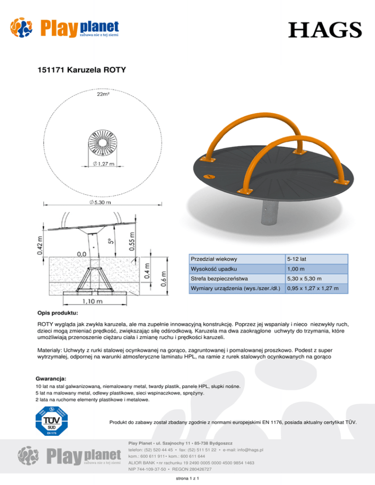 151171 Karuzela ROTY Przedział wiekowy 5-12 lat Wysokość upadku 1,00 m Strefa bezpieczeństwa 5,30 x 5,30 m Wymiary urządzenia (wys./szer./dł.) 0,95 x 1,27 x 1,27 m Opis produktu: ROTY wygląda jak zwykła karuzela, ale ma zupełnie innowacyjną konstrukcję. Poprzez jej wspaniały i nieco niezwykły ruch, dzieci mogą zmieniać prędkość, zwiększając siłę odśrodkową. Karuzela ma dwa zaokrąglone uchwyty do trzymania, które umożliwiają przenoszenie ciężaru ciała i zmianę ruchu i prędkości karuzeli. Materiały: Uchwyty z rurki stalowej ocynkowanej na gorąco, zagruntowanej i pomalowanej proszkowo. Podest z super wytrzymałej, odpornej na warunki atmosferyczne laminatu HPL, na ramie z rurek stalowych ocynkowanych na gorąco Gwarancja: 10 lat na stal galwanizowaną, niemalowany metal, twardy plastik, panele HPL, słupki nośne. 5 lat na malowany metal, odlewy plastikowe, sieci wspinaczkowe, sprężyny. 2 lata na ruchome elementy plastikowe i metalowe. Produkt do zabawy został zbadany zgodnie z normami europejskimi EN 1176, posiada aktualny certyfikat TÜV. Play Planet • ul. Szajnochy 11 • 85-738 Bydgoszcz telefon: (52) 520 44 45 • fax: (52) 511 51 22 • e-mail: [email protected] kom.: 600 611 911 • kom.: 600 611 644 ALIOR BANK • nr rachunku 19 2490 0005 0000 4500 9854 1463 NIP 744-109-37-50 • REGON 280426727 strona 1 z 1