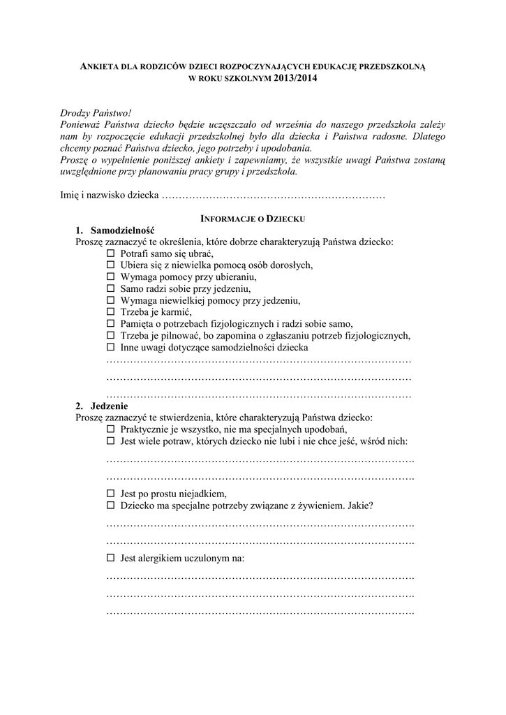 ANKIETA DLA RODZICÓW DZIECI ROZPOCZYNAJĄCYCH EDUKACJĘ PRZEDSZKOLNĄ W ROKU SZKOLNYM 2013/2014 Drodzy Państwo! Ponieważ Państwa dziecko będzie uczęszczało od września do naszego przedszkola zależy nam by rozpoczęcie edukacji przedszkolnej było dla dziecka i Państwa radosne. Dlatego chcemy poznać Państwa dziecko, jego potrzeby i upodobania. Proszę o wypełnienie poniższej ankiety i zapewniamy, że wszystkie uwagi Państwa zostaną uwzględnione przy planowaniu pracy grupy i przedszkola. Imię i nazwisko dziecka ………………………………………………………… INFORMACJE O DZIECKU 1. Samodzielność Proszę zaznaczyć te określenia, które dobrze charakteryzują Państwa dziecko: Potrafi samo się ubrać, Ubiera się z niewielka pomocą osób dorosłych, Wymaga pomocy przy ubieraniu, Samo radzi sobie przy jedzeniu, Wymaga niewielkiej pomocy przy jedzeniu, Trzeba je karmić, Pamięta o potrzebach fizjologicznych i radzi sobie samo, Trzeba je pilnować, bo zapomina o zgłaszaniu potrzeb fizjologicznych, Inne uwagi dotyczące samodzielności dziecka ……………………………………………………………………………… ……………………………………………………………………………… ……………………………………………………………………………… 2. Jedzenie Proszę zaznaczyć te stwierdzenia, które charakteryzują Państwa dziecko: Praktycznie je wszystko, nie ma specjalnych upodobań, Jest wiele potraw, których dziecko nie lubi i nie chce jeść, wśród nich: ………………………………………………………………………………. ………………………………………………………………………………. Jest po prostu niejadkiem, Dziecko ma specjalne potrzeby związane z żywieniem. Jakie? ………………………………………………………………………………. ………………………………………………………………………………. Jest alergikiem uczulonym na: ………………………………………………………………………………. ………………………………………………………………………………. ………………………………………………………………………………. 3. Odpoczynek / relaks Proszę zaznaczyć te określenia, które dobrze charakteryzują Państwa dziecko: Jest przyzwyczajone do odpoczynku po obiedzie, zasypia bez kłopotów, Trzeba je nakłaniać do odpoczynku, zasypia z trudnością, Nie ma potrzeby, nie odpoczywa po obiedzie, Zachowuje się jeszcze inaczej, jak? ………………………………………………………………………………………. ………………………………………………………………………………………. 4. Ulubione zabawki i zabawy mojego dziecka: ………………………………………………………………………………………. ………………………………………………………………………………………. 5. Ulubiony rodzaj książek mojego dziecka to: ………………………………………………………………………………………. ………………………………………………………………………………………. 6. Uzdolnienia i zainteresowania Proszę zaznaczyć te określenia, które dobrze charakteryzują Państwa dziecko: Wykazuje uzdolnienia w kierunku: ……………………………………………………………………………………… ……………………………………………………………………………………… Bardzo interesuje się: ……………………………………………………………………………………… ……………………………………………………………………………………… Bardzo lubi (np. grać, śpiewać…): ……………………………………………………………………………………… ……………………………………………………………………………………… 7. Inne informacje o dziecku Uprzejmie proszę o przekazanie tych informacji o dziecku, które uznacie Państwo za ważne: ……………………………………………………………………………………….. ……………………………………………………………………………………….. ……………………………………………………………………………………….. ……………………………………………………………………………………….. ……………………………………………………………………………………….. 8. Jakie są Państwa oczekiwania w stosunku do Przedszkola? ……………………………………………………………………………………….. ……………………………………………………………………………………….. ……………………………………………………………………………………….. ……………………………………………………………………………………….. Dziękujemy za wypełnienie ankiety