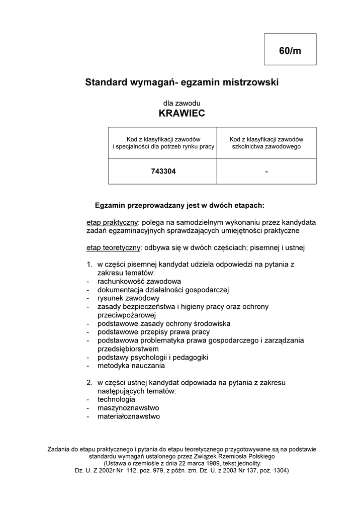 60/m Standard wymagań- egzamin mistrzowski KRAWIEC